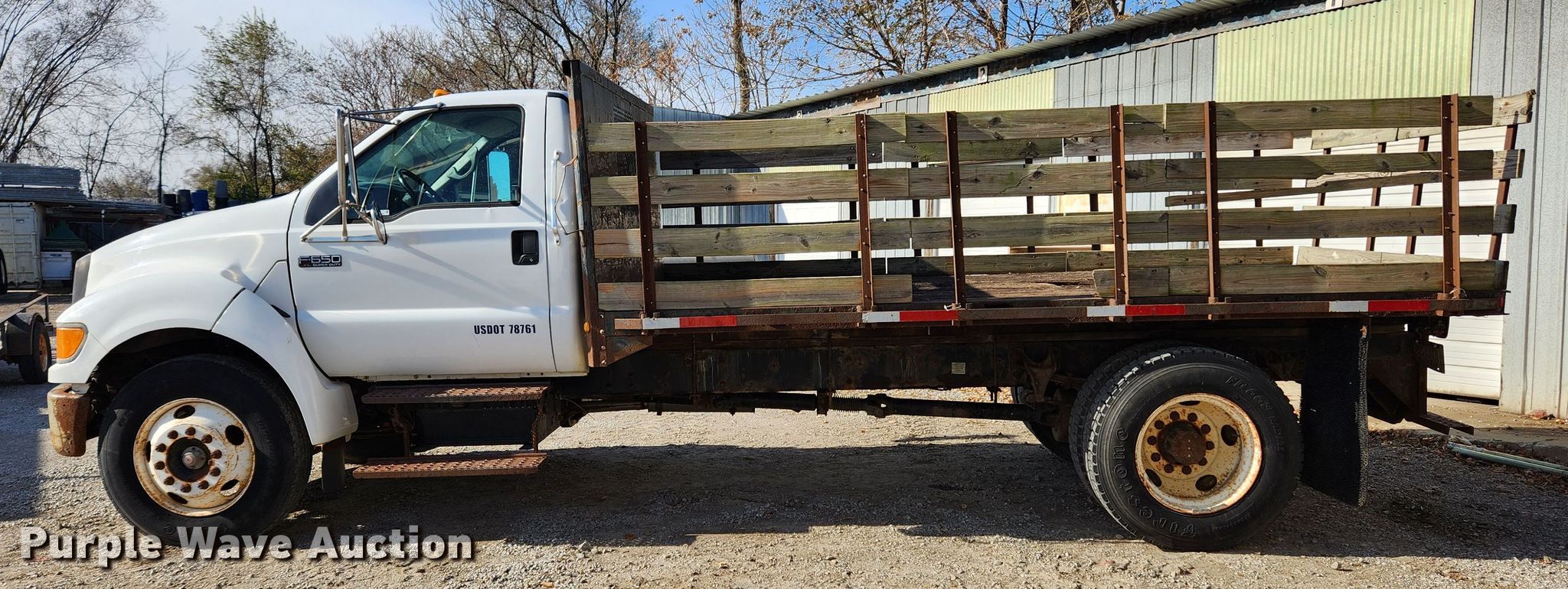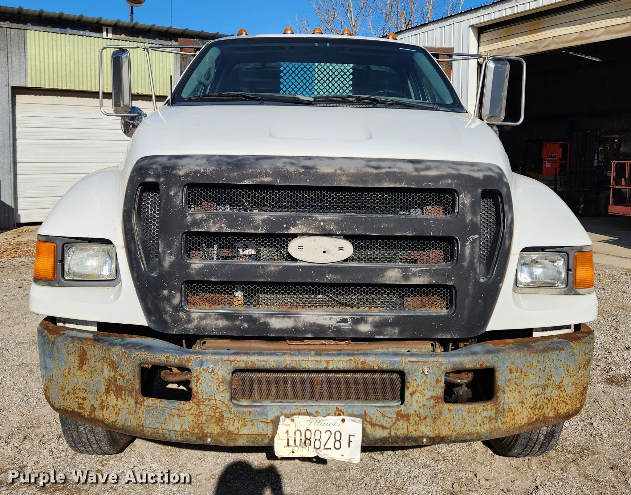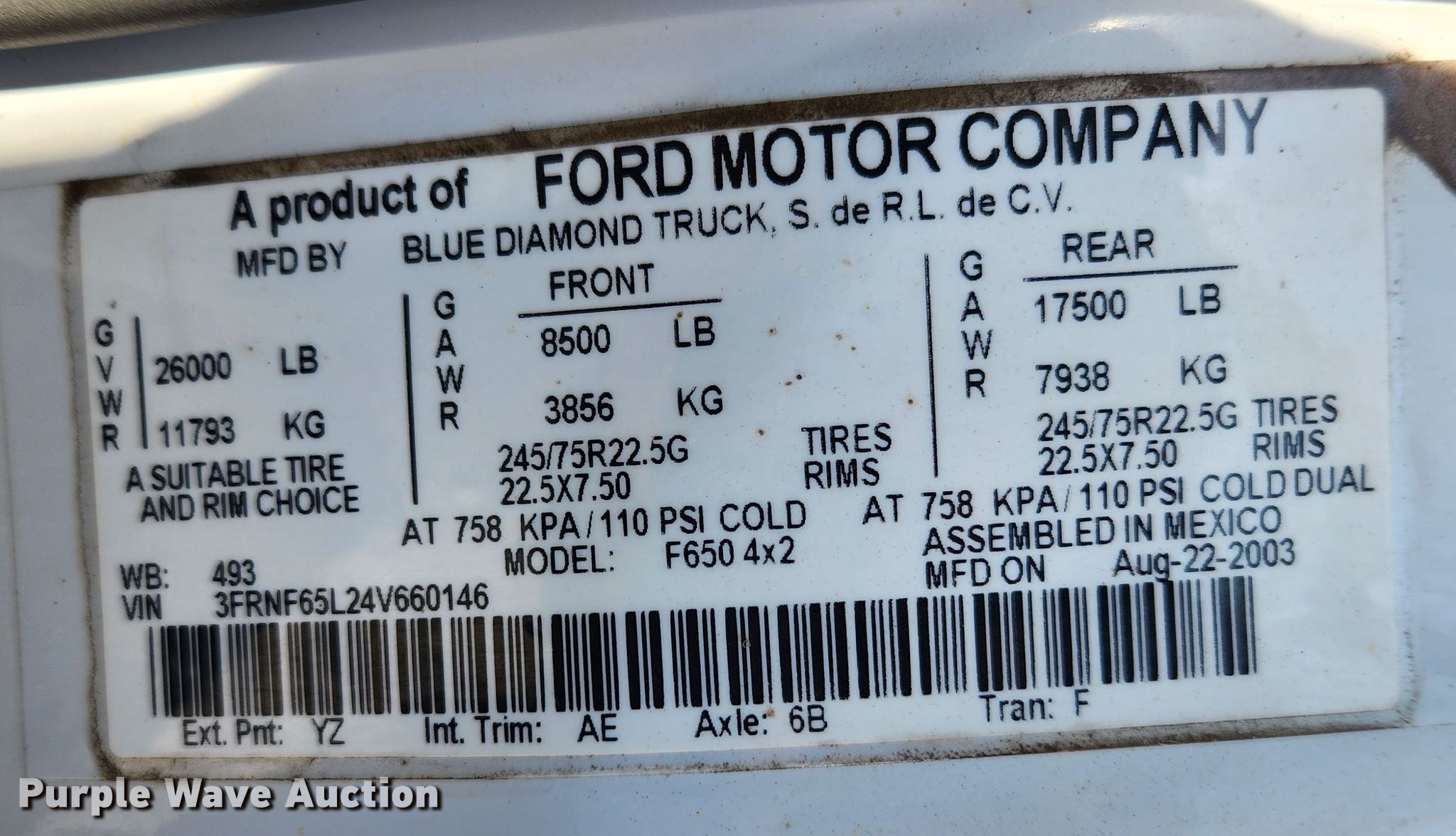 2004 Ford F650 Super Duty XL flatbed truck. Miles: 110,189 on odometer, VIN: 3FRNF65L24V660146. Engine International VT365, Displacement: 6.0L, Cylinders: 6, Fuel type: Diesel. Transmission Automatic. Chassis Axles: Single, Suspension: Spring, Brakes: Hydraulic, GVWR: 26,000 lbs, Wheelbase: 194". Interior AC, Heat, Cruise control. Features Flatbed 14' 6" L x 91" W, Removable sides. Tires Size: 10R22.5. Illinois title. Title distribution may be delayed up to 14 days from verification of funds. S.M. Wilson & Co.. Granite City, IL 62040