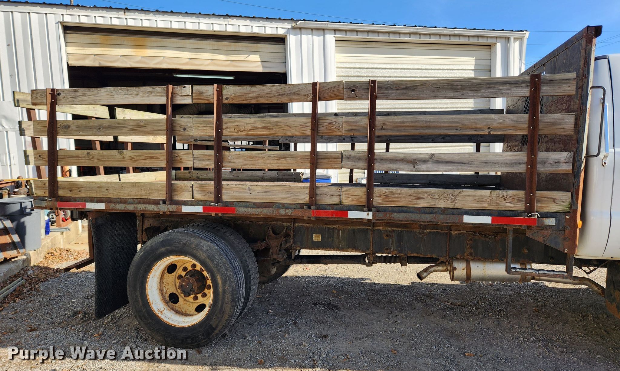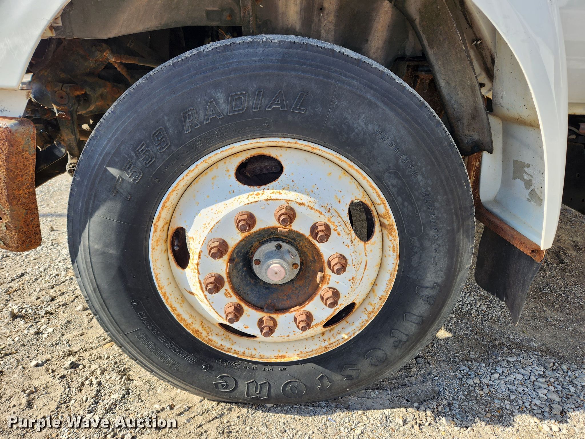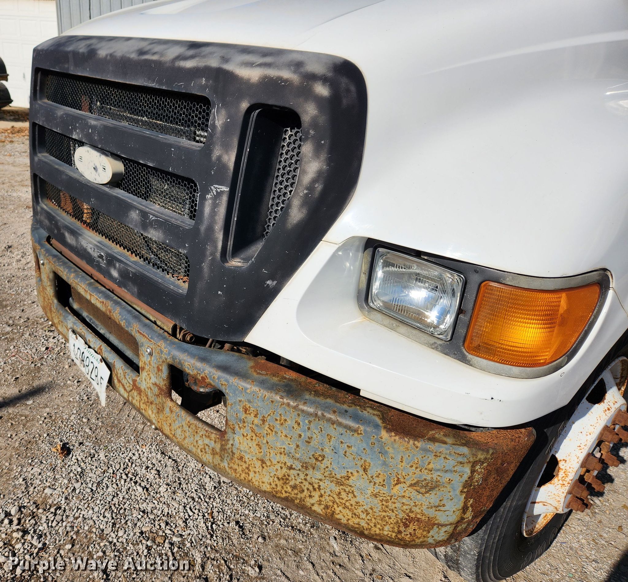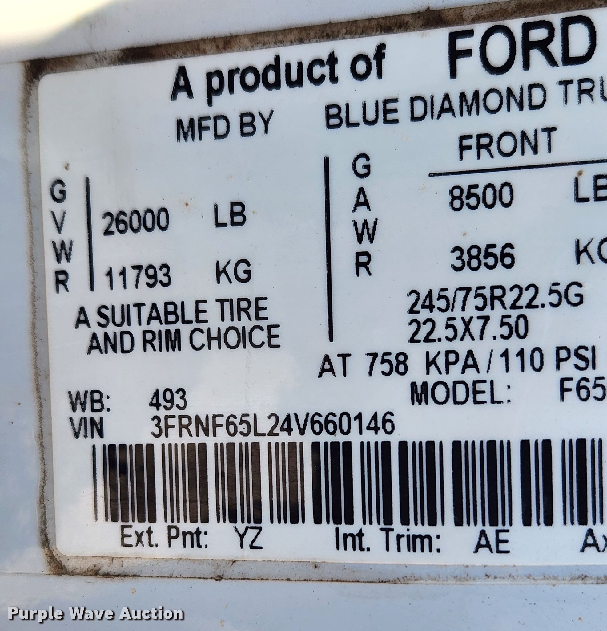 2004 Ford F650 Super Duty XL flatbed truck. Miles: 110,189 on odometer, VIN: 3FRNF65L24V660146. Engine International VT365, Displacement: 6.0L, Cylinders: 6, Fuel type: Diesel. Transmission Automatic. Chassis Axles: Single, Suspension: Spring, Brakes: Hydraulic, GVWR: 26,000 lbs, Wheelbase: 194". Interior AC, Heat, Cruise control. Features Flatbed 14' 6" L x 91" W, Removable sides. Tires Size: 10R22.5. Illinois title. Title distribution may be delayed up to 14 days from verification of funds. S.M. Wilson & Co.. Granite City, IL 62040