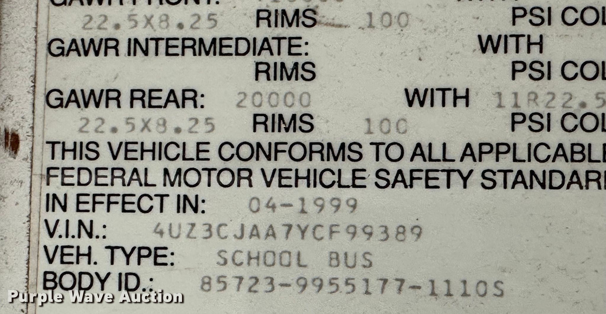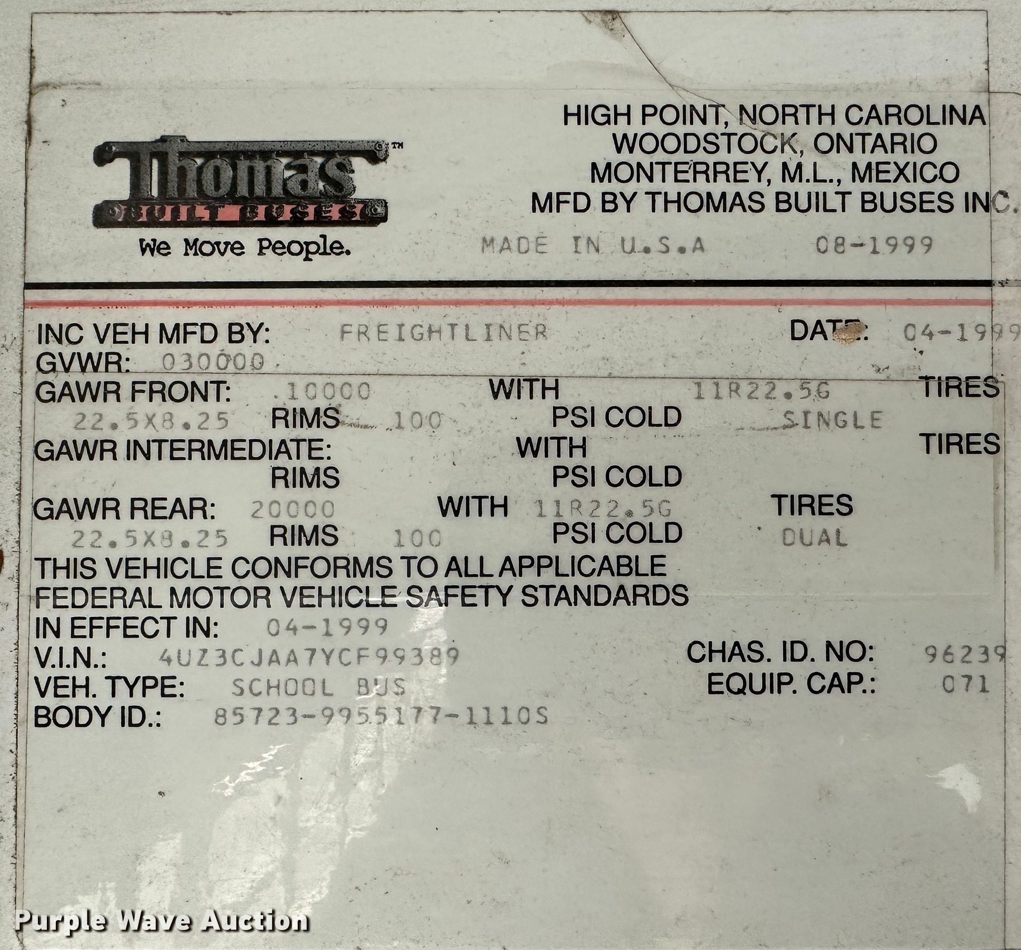 1999 Freightliner Thomas Built school bus. Miles: 174,099 on odometer, Hours: 10,008 on meter, VIN: 4UZ3CJAA7YCF99389. Engine Caterpillar 3126, Displacement: 7.2L, Cylinders: 6, Fuel type: Diesel. Transmission Automatic. Chassis Axles: Single, Suspension: Spring, Brakes: Hydraulic. Interior Heat, Cruise control, Passengers: 71. Tires Size: 11R22.5. Nebraska title. Mileage has not been verified. Exempt will be written in the odometer disclosure on the title. Title distribution may be delayed up to 14 days from verification of funds. Coach Master's Inc.. 6410 U.S. 30 Suite B. Kearney, NE 68847