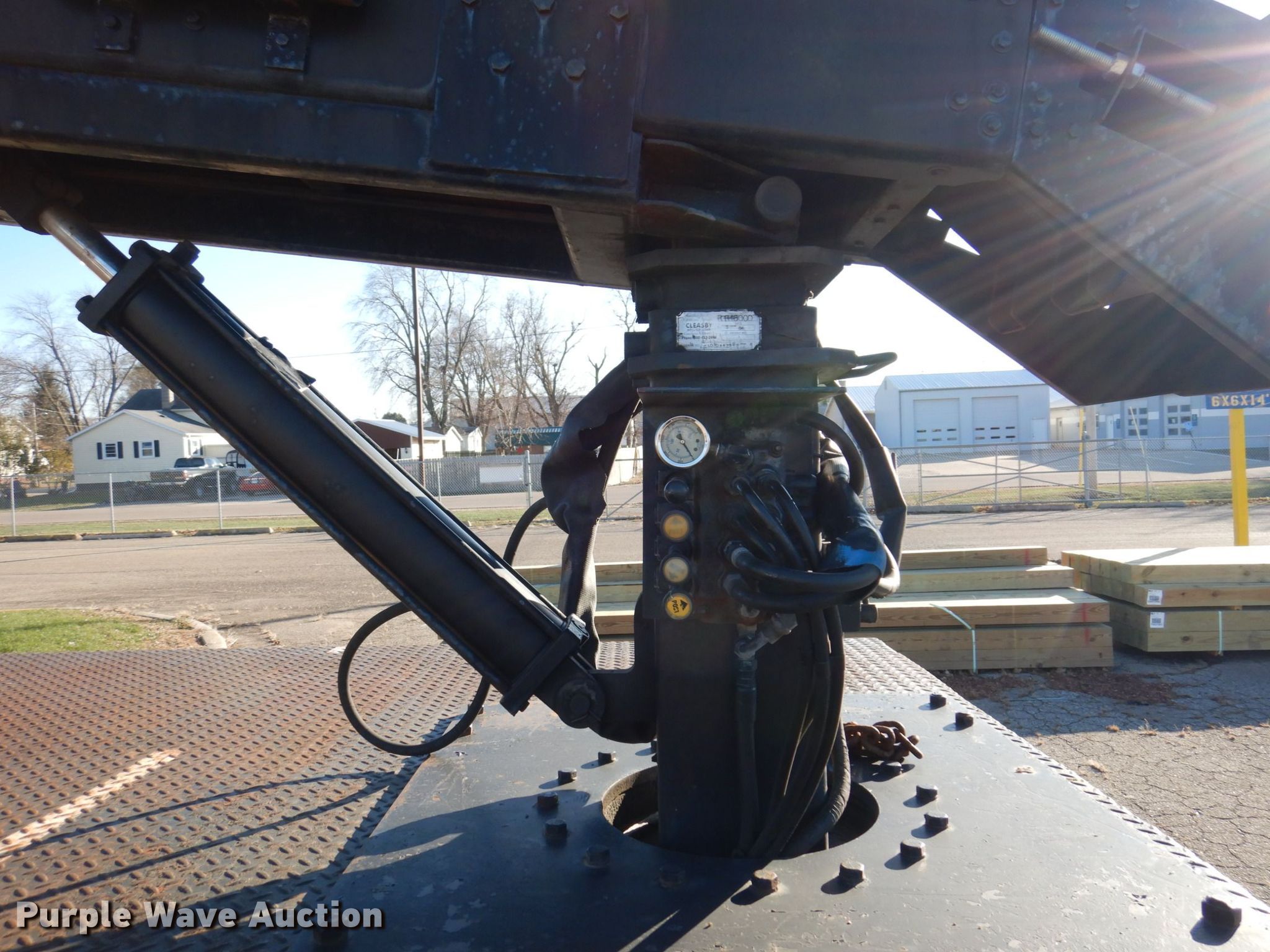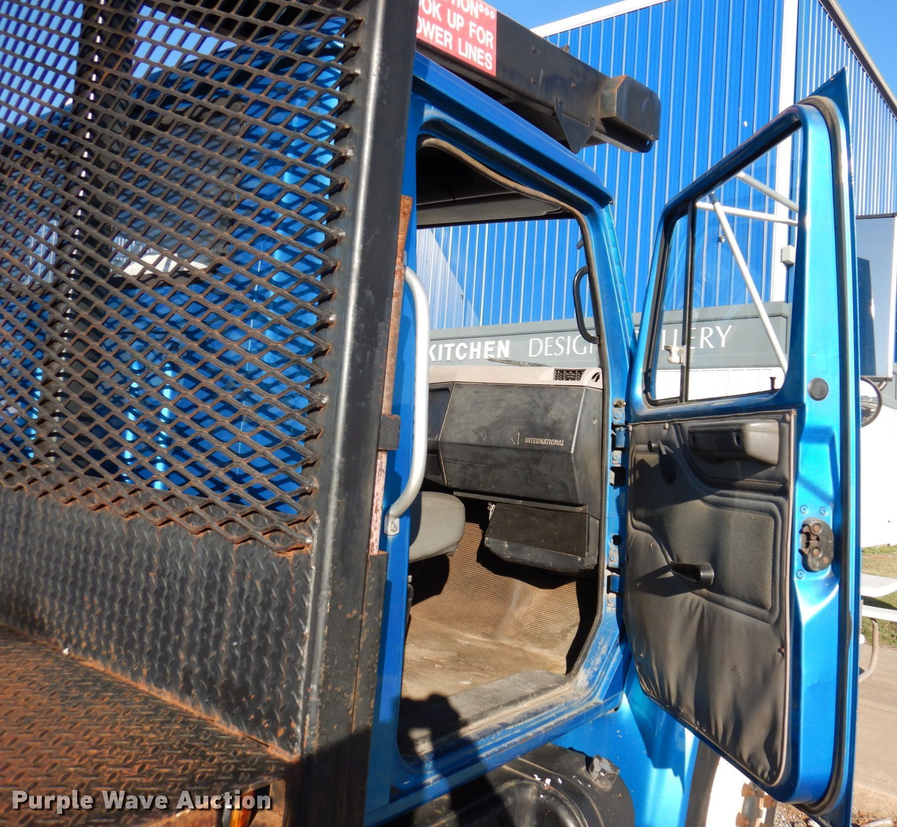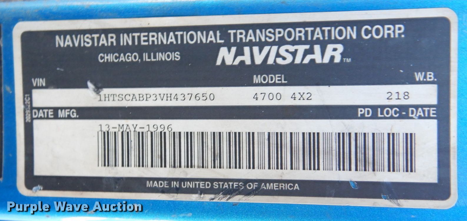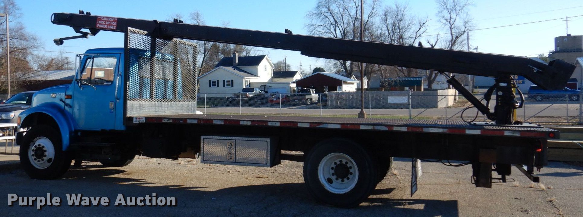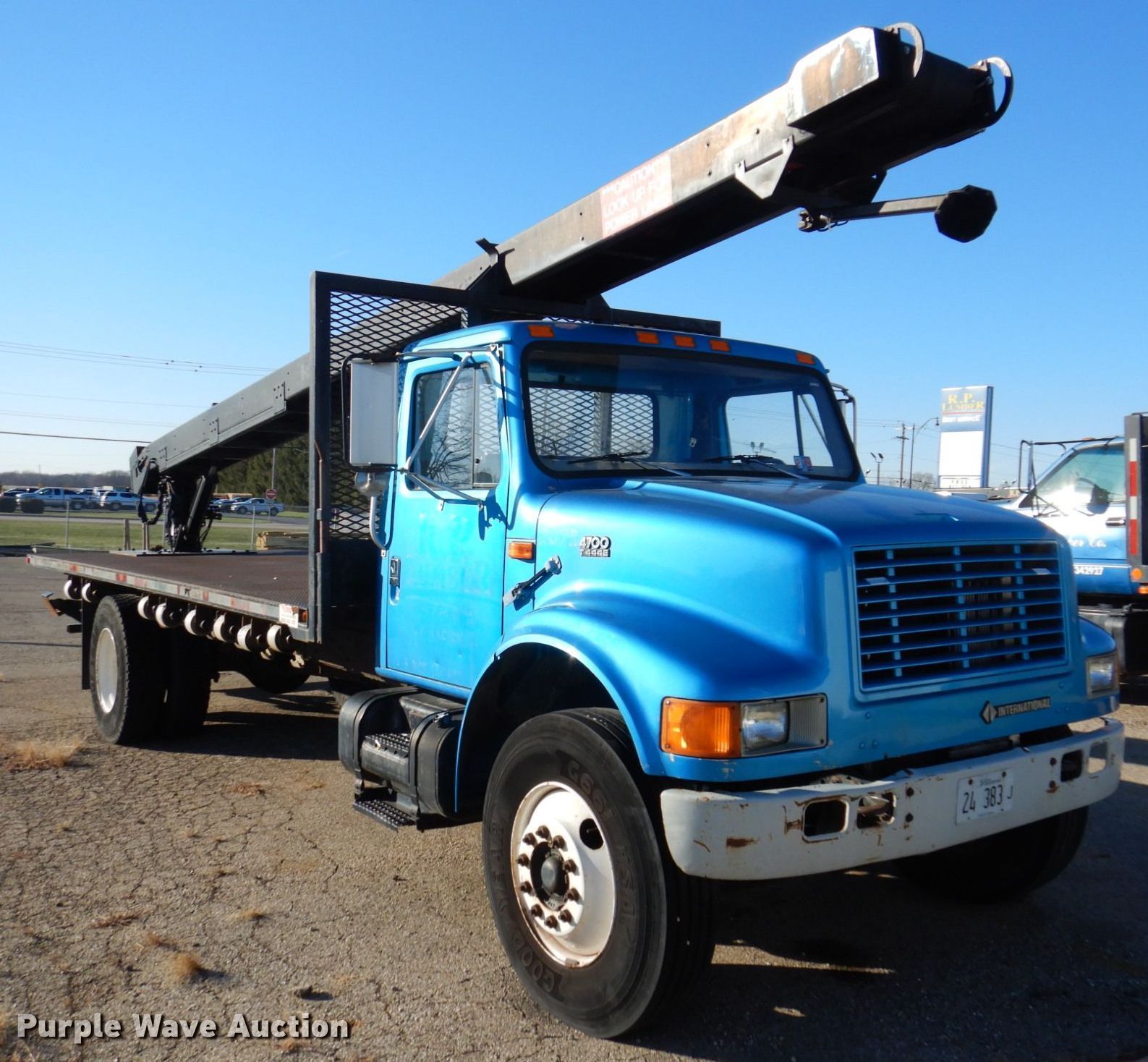 1997 International 4700 flatbed truck. Miles: 186,817 on odometer, VIN: 1HTSCABP3VH437650, Unit #: 2072. Engine International T444E, Displacement: 7.3L, Cylinders: 8, Fuel type: Diesel. Transmission Manual, Speed: 5, plus 2. Chassis Axles: Single, Suspension: Spring, Brakes: Hydraulic, PTO, Wheelbase: 218". Interior Heat. Features Flatbed 21' 3" L x 96" W, 2004 Cleasby RTH6000 boom laddervator Serial: CL030442998-6, Belt: 21' L x 15.5" W. Tires Size: 11R22.5. Notes Unit must be towed or hauled, Non-operational engine, Non-operational unit. Illinois title. Title distribution may be delayed up to 14 days from verification of funds. R.P. Lumber Co. Inc.. Princeton, IL 61356