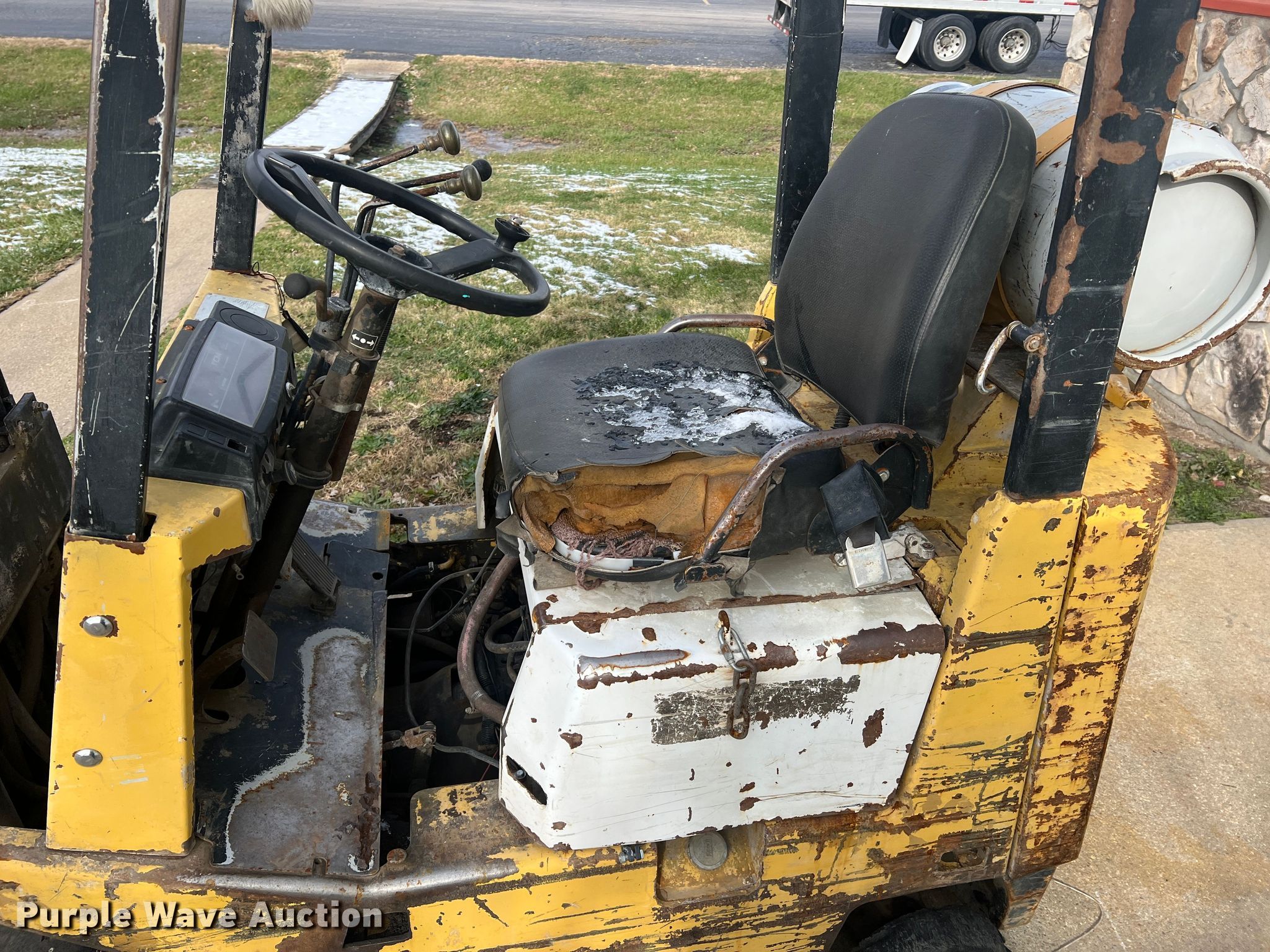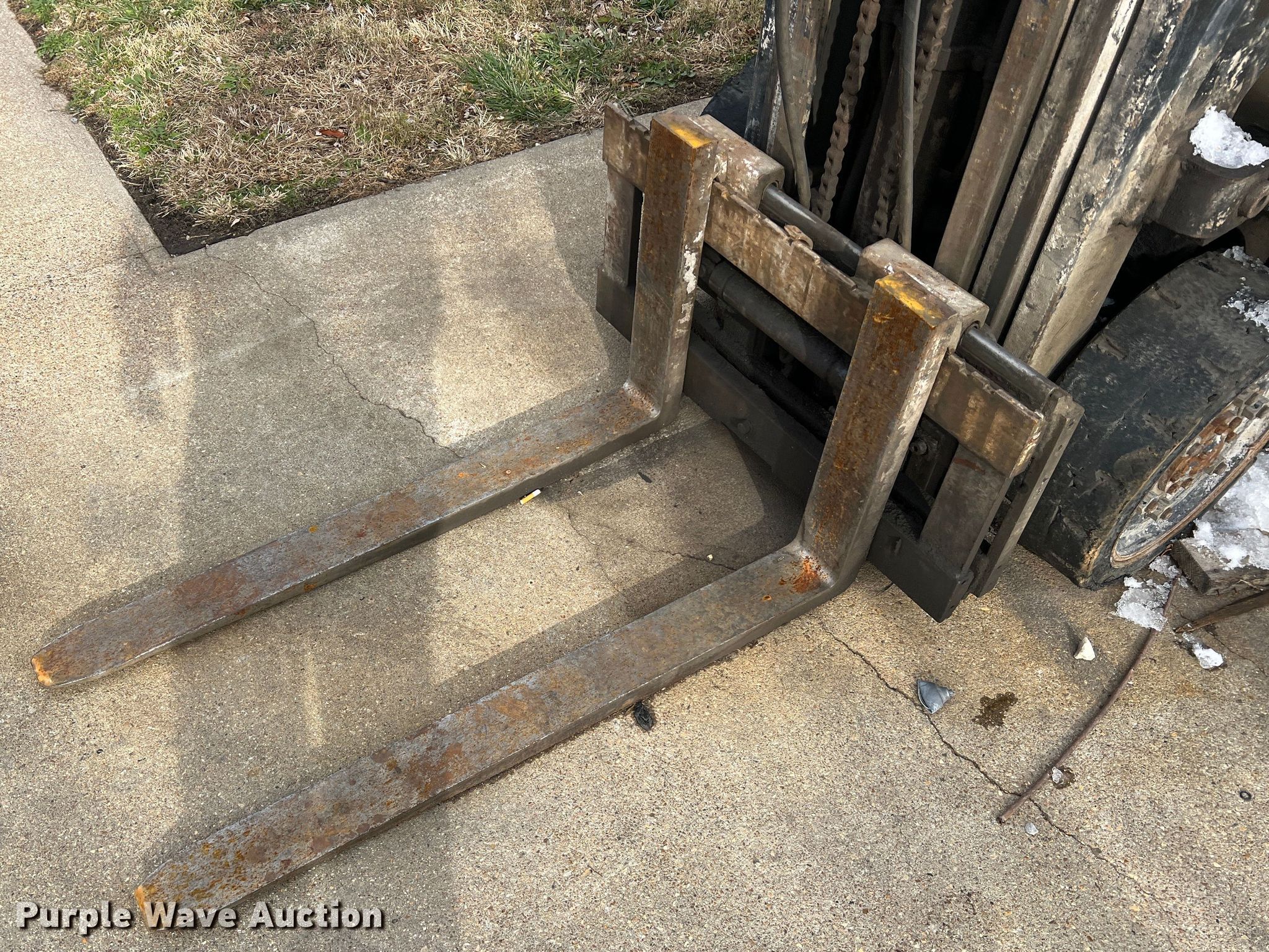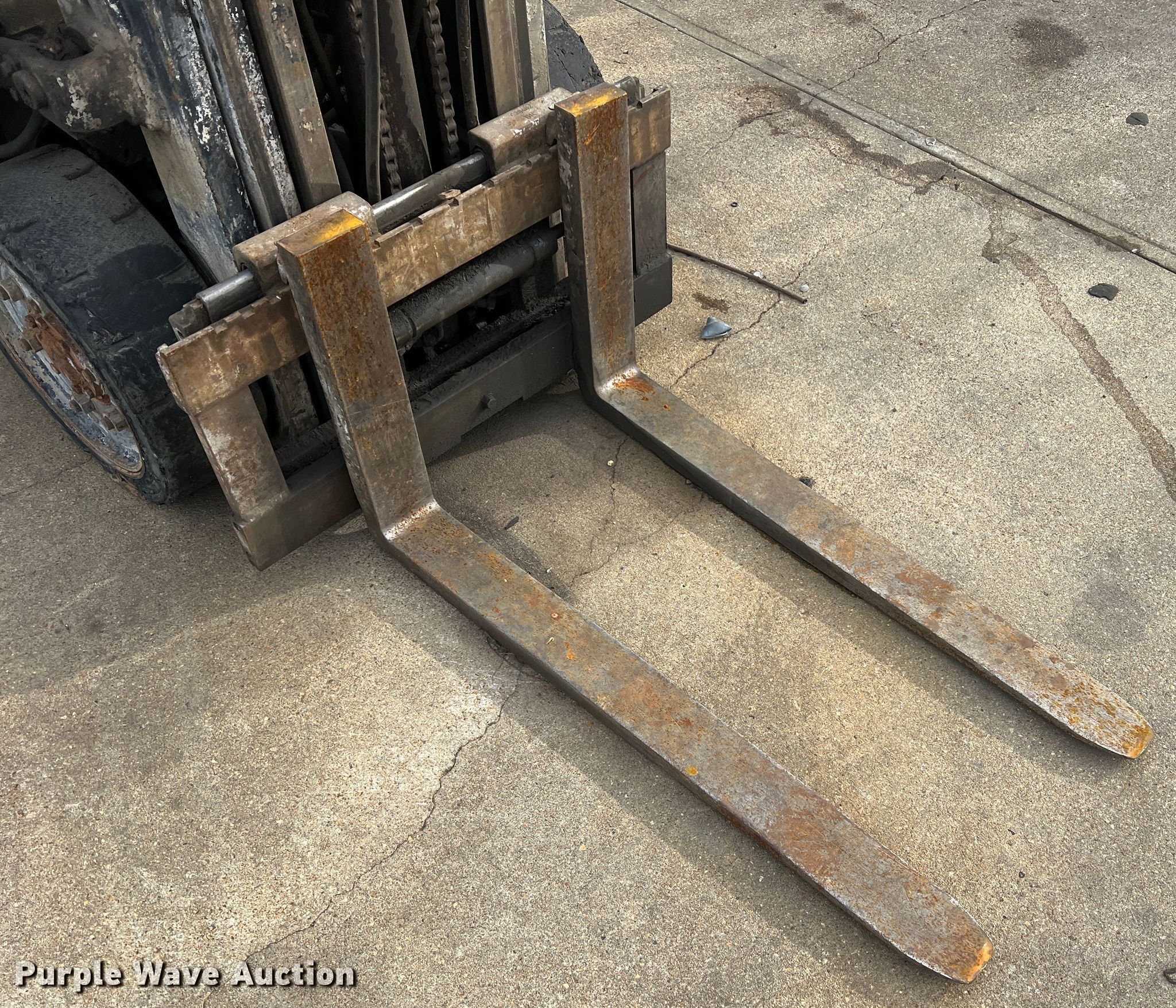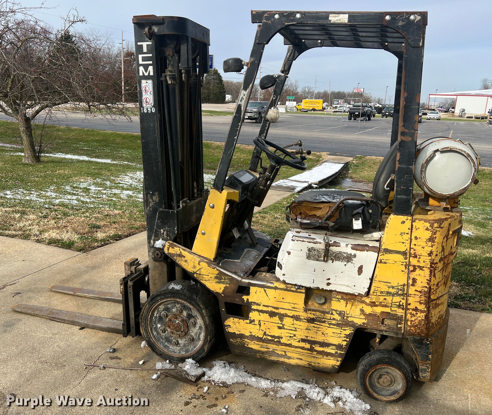 TCM FCG15N7T forklift. Hours: 1,318 on meter, Serial: A44700579. Engine Nissan, Cylinders: 4, Fuel type: LPG LP bottle: Included. Transmission Shuttle shift. Operators station OROPS. Features Maximum lift capacity: 2,500 lbs, Maximum lift height: 189", Mast stages: 3, Side shift, Mast tilt, Fork length: 42". Tires Size: 21x7x15, Solid, Non marking. Notes Non-operational engine, Non-operational unit. 14829 MO-52. Versailles, MO 65084