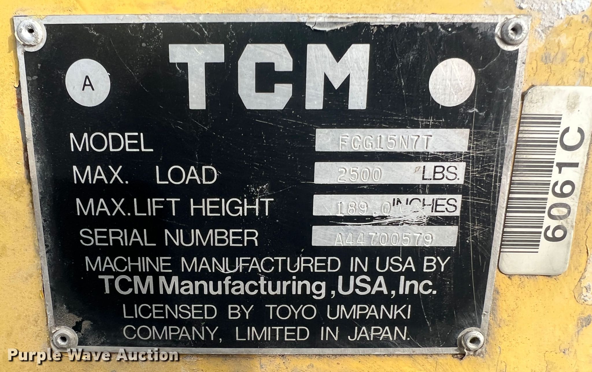 Purple Wave is selling a used Warehouse Forklift in Missouri. This item is a TCM FCG15N7T forklift with the following: Hours: 1,318 on meter, Serial: A44700579