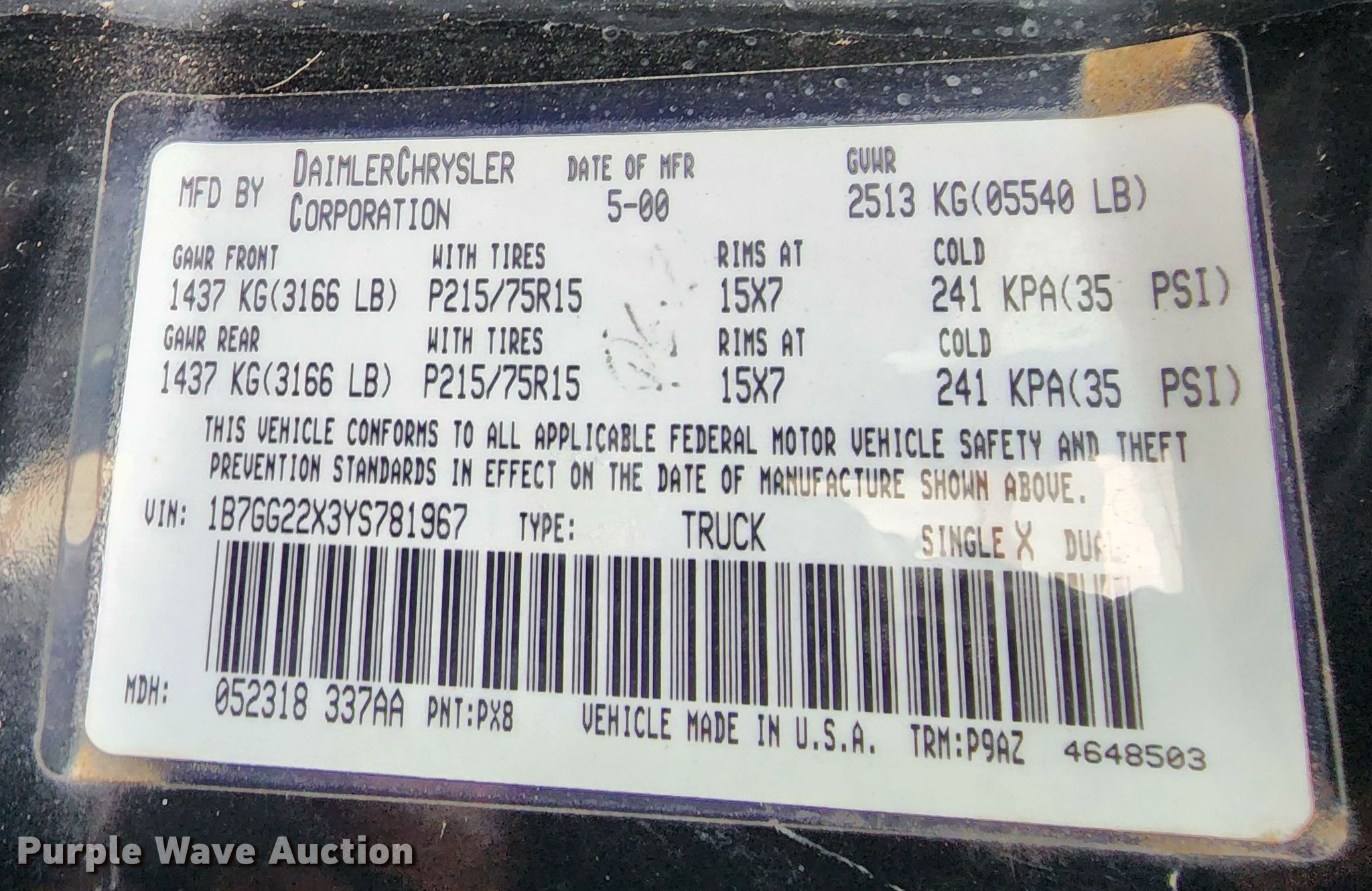 Purple Wave is selling a used Compact Pickup or Van in Missouri. This item is a 2000 Dodge Dakota Club Cab pickup truck with the following: Miles: 183,382 on odometer, VIN: 1B7GG22X3YS781967