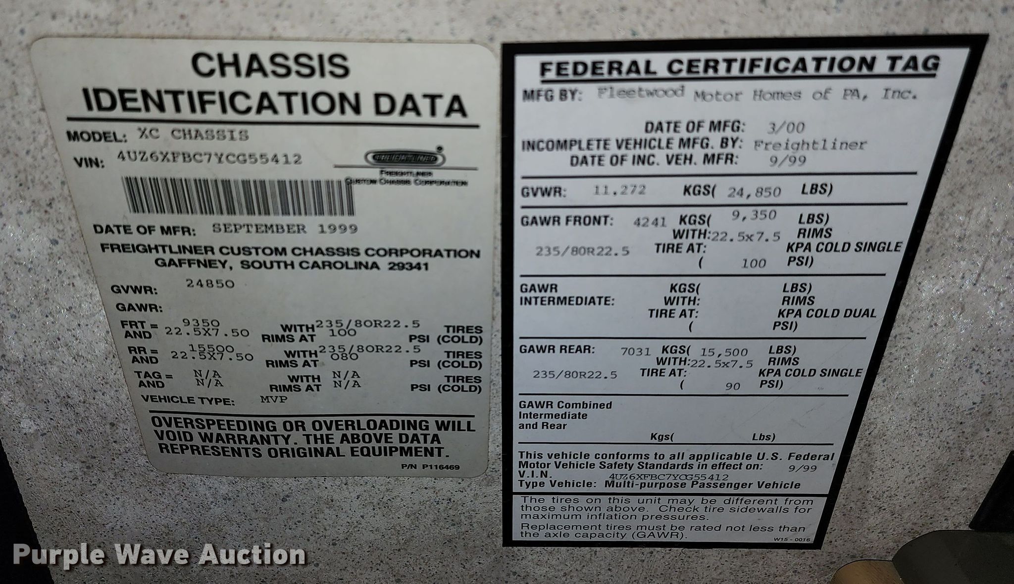 Purple Wave is selling a used RV or Camper in Missouri. This item is a 2000 Fleetwood Bounder RV with the following: Miles: 92,489 on odometer, Camper length: 38', VIN: 4UZ6XFBC7YCG55412