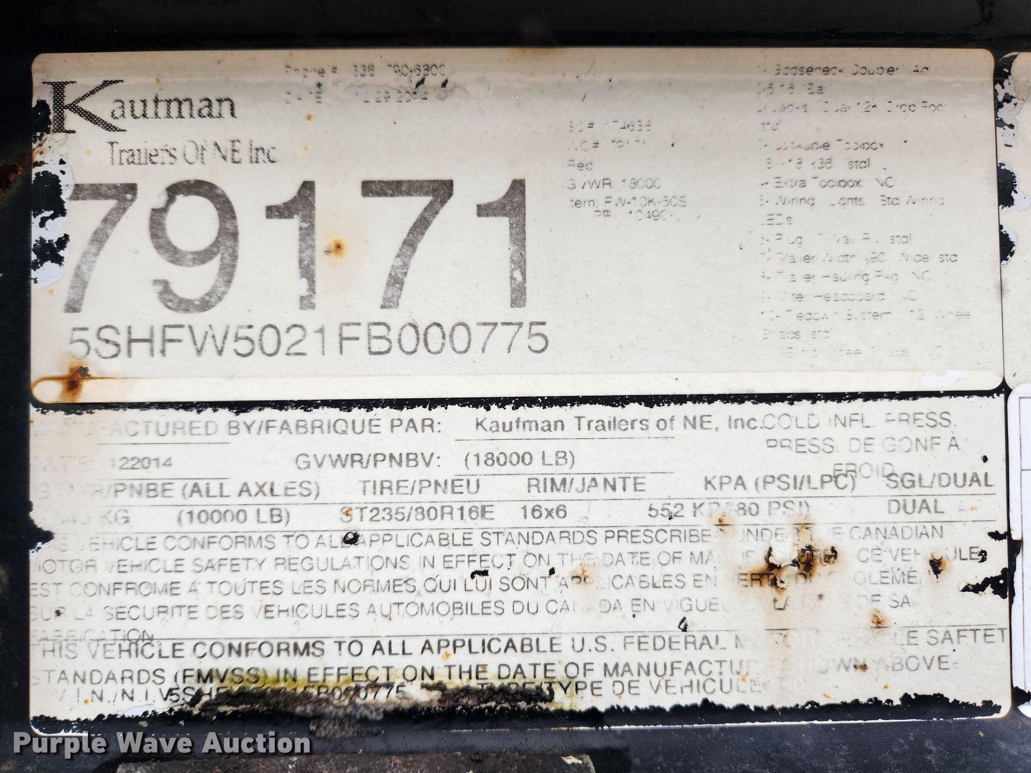 2015 Kaufman car carrier. VIN: 5SHFW5021FB000775. Dimensions Overall: 50' L x 91" W, Ramps: Manual Length: 6'. Features Deck type: Steel. Chassis Hitch: Gooseneck, Landing gear: Dual, Two speed, Suspension: Spring, Brakes: Electric, Axles: Tandem, GVWR: 18,000 lbs, GAWR: 10,000 lbs. Tires Steel wheels, Size: 235/80R16. Missouri title. Seller is a Missouri licensed motor vehicle dealer. Title will be assigned and distributed by the dealer. Please contact the seller for distribution questions. CSR Truck and Equipment Sales. Marthasville, MO 63357