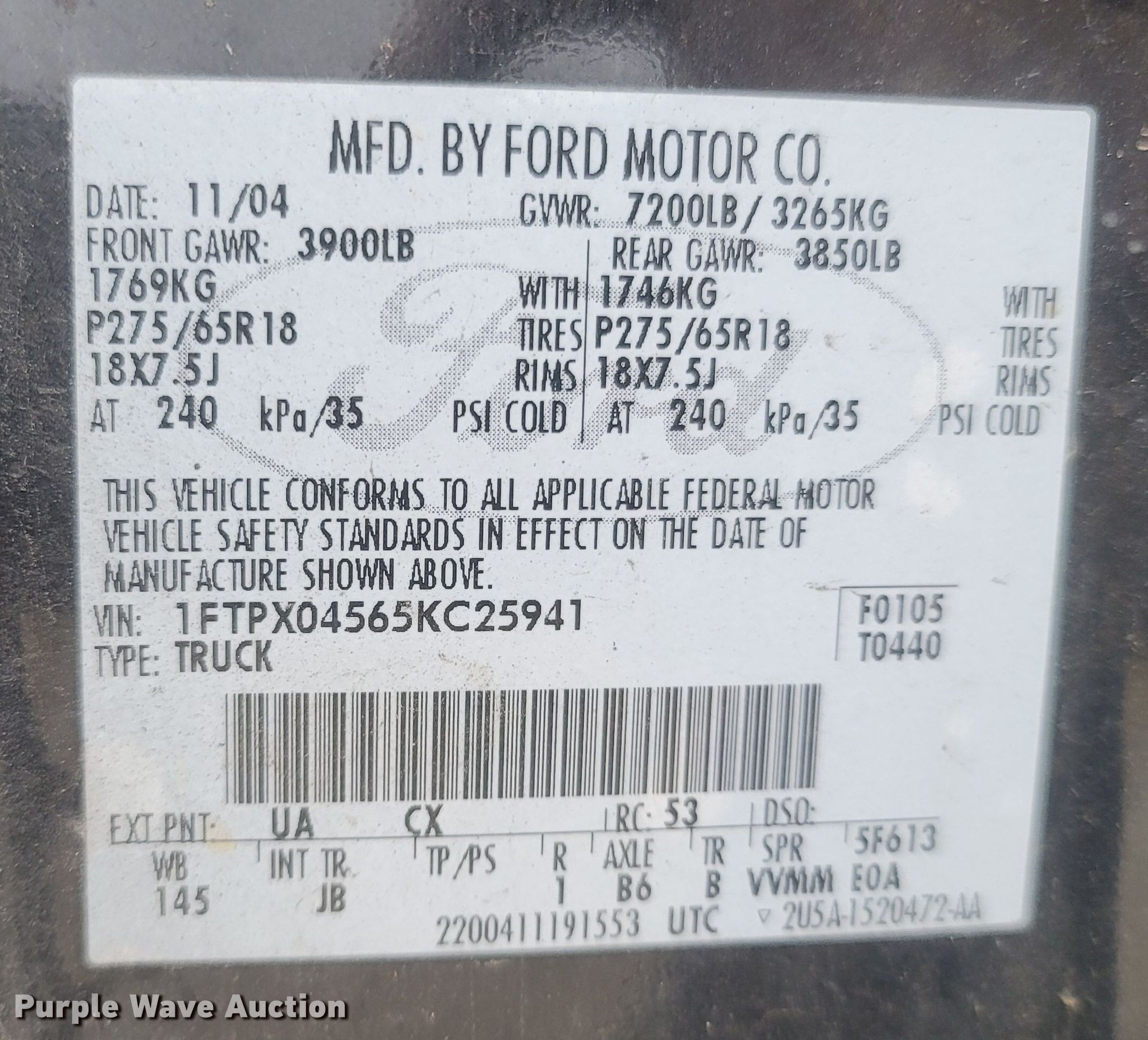 - VIN: 1FTPX04565KC25941