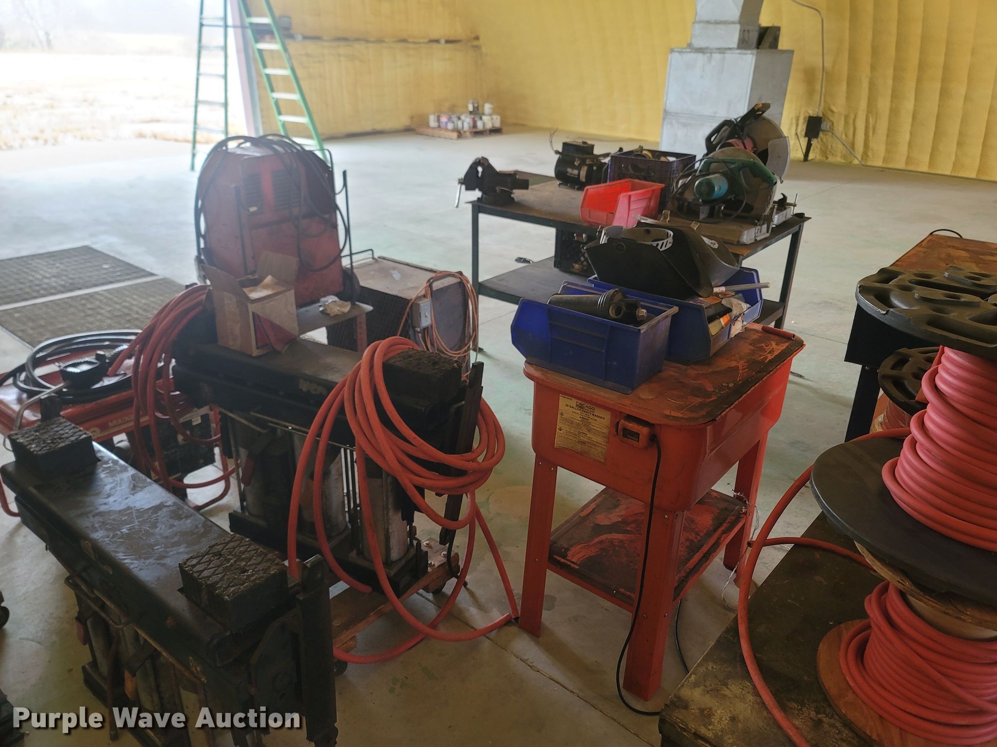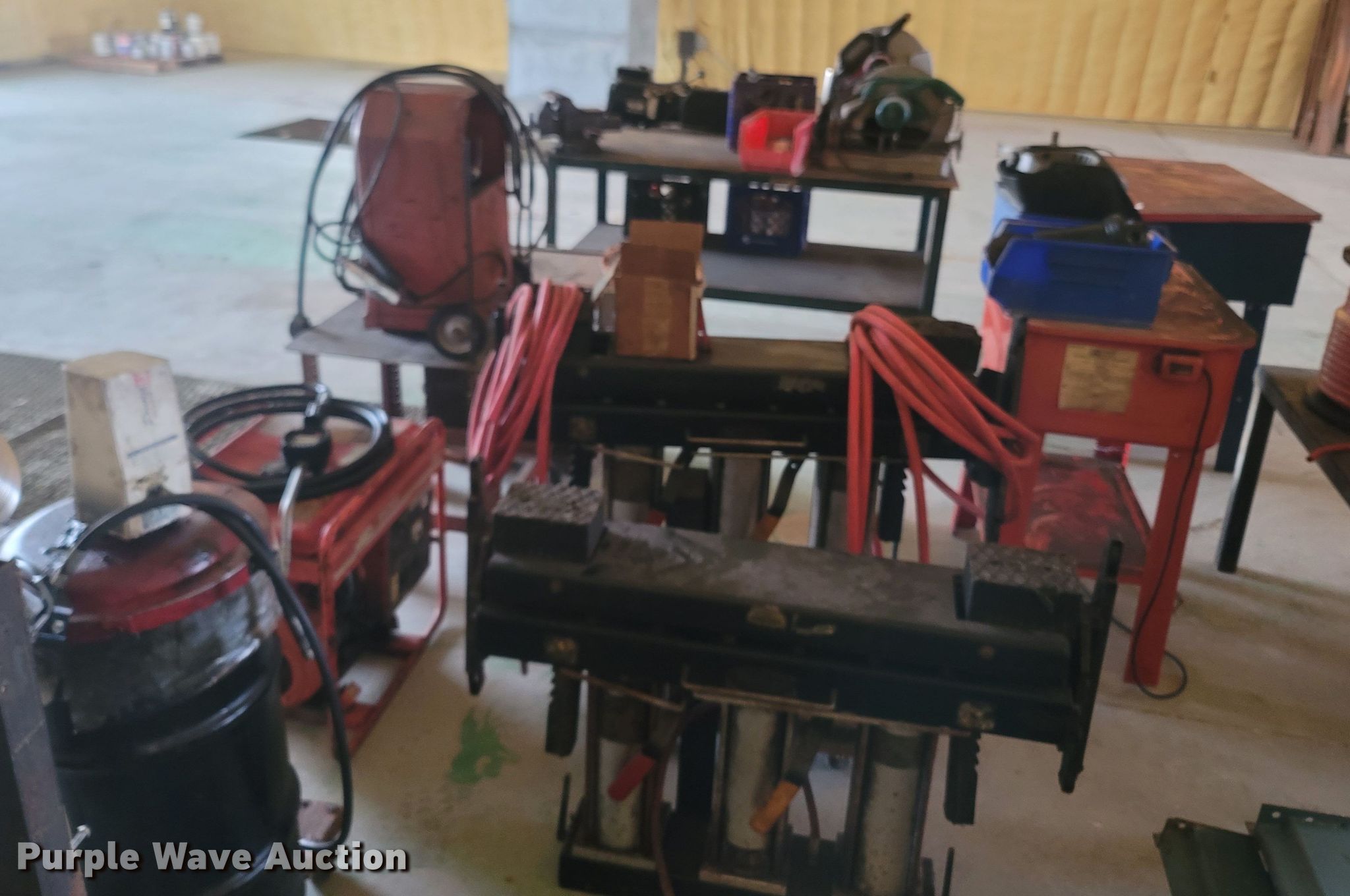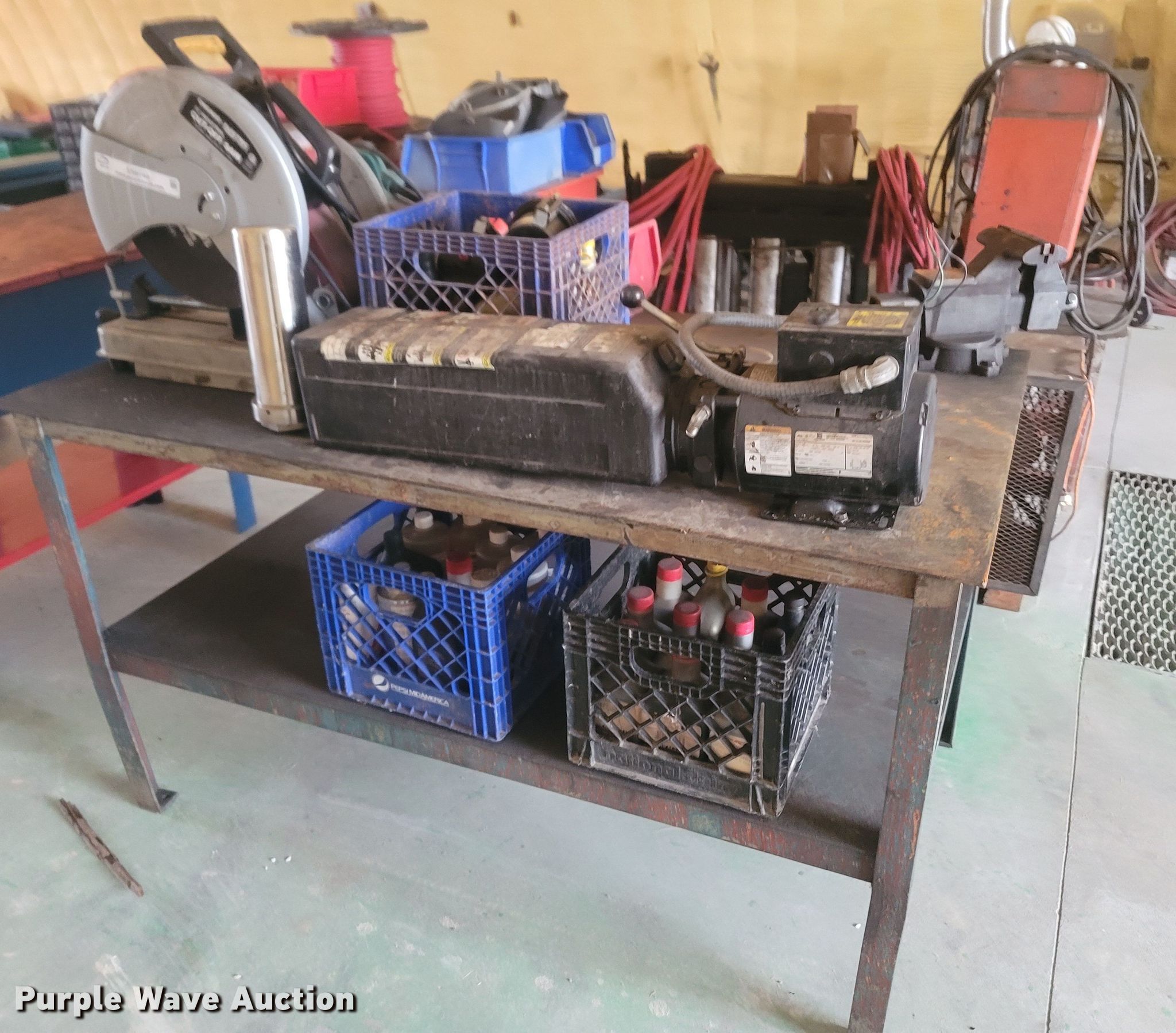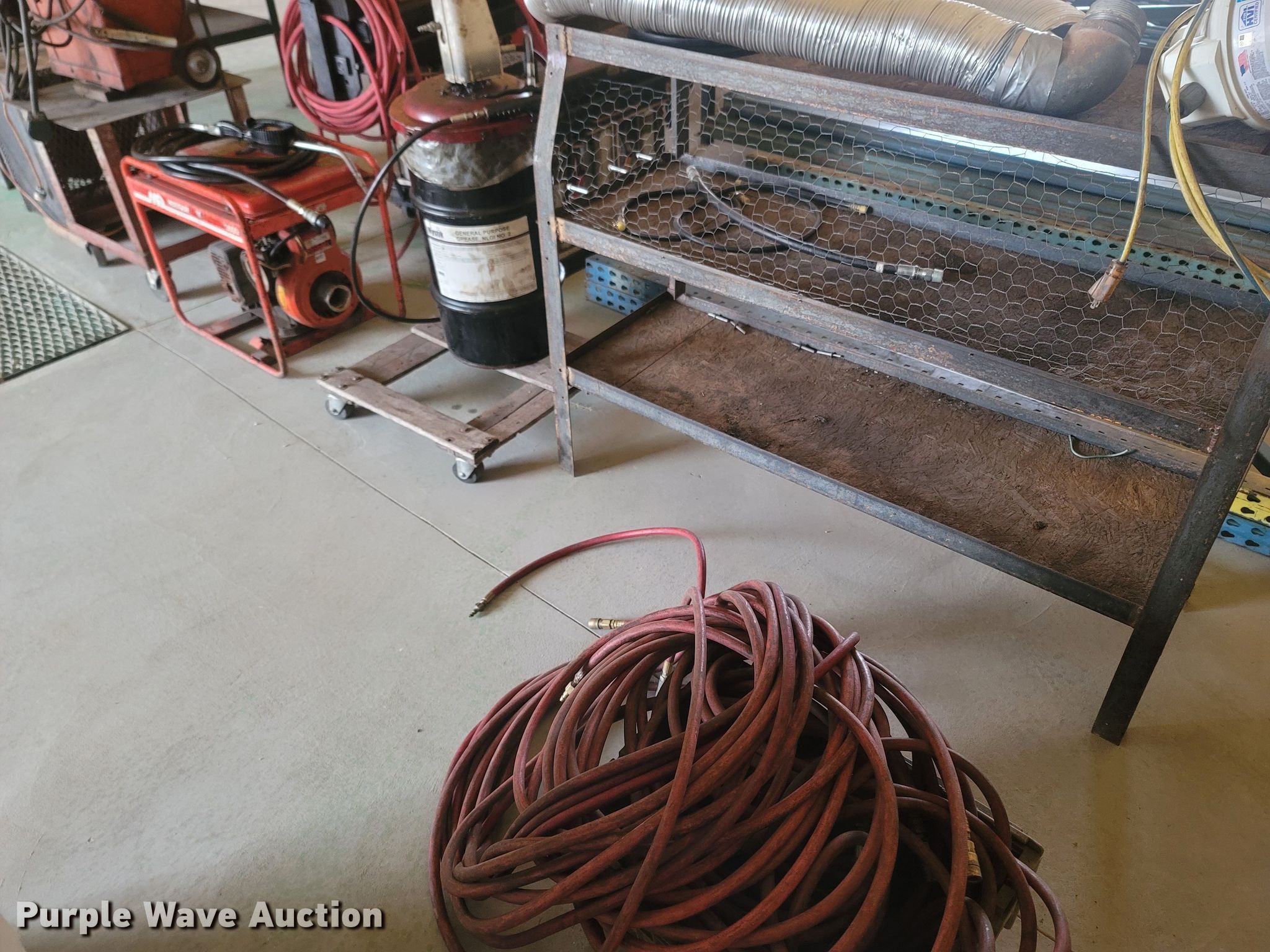 Purple Wave is selling a used Tools in Missouri. This item is a Tools with the following: Welding table, Lincoln AC180A, Welding supplies, Box fan, Hydraulic car lift with pump, Vise, (3) crates of hydraulic fluid, Multiquip 3600 generator, 30 gallon grease barrel, Shop made metal shelf, Air hoses, (2) parts washers, (2) cut off saws, (5) spools of air hose, Approx. 44 boxes of fittings, Pneumatic air nibbler, Shop built metal table, Exhaust fume fan with ducting