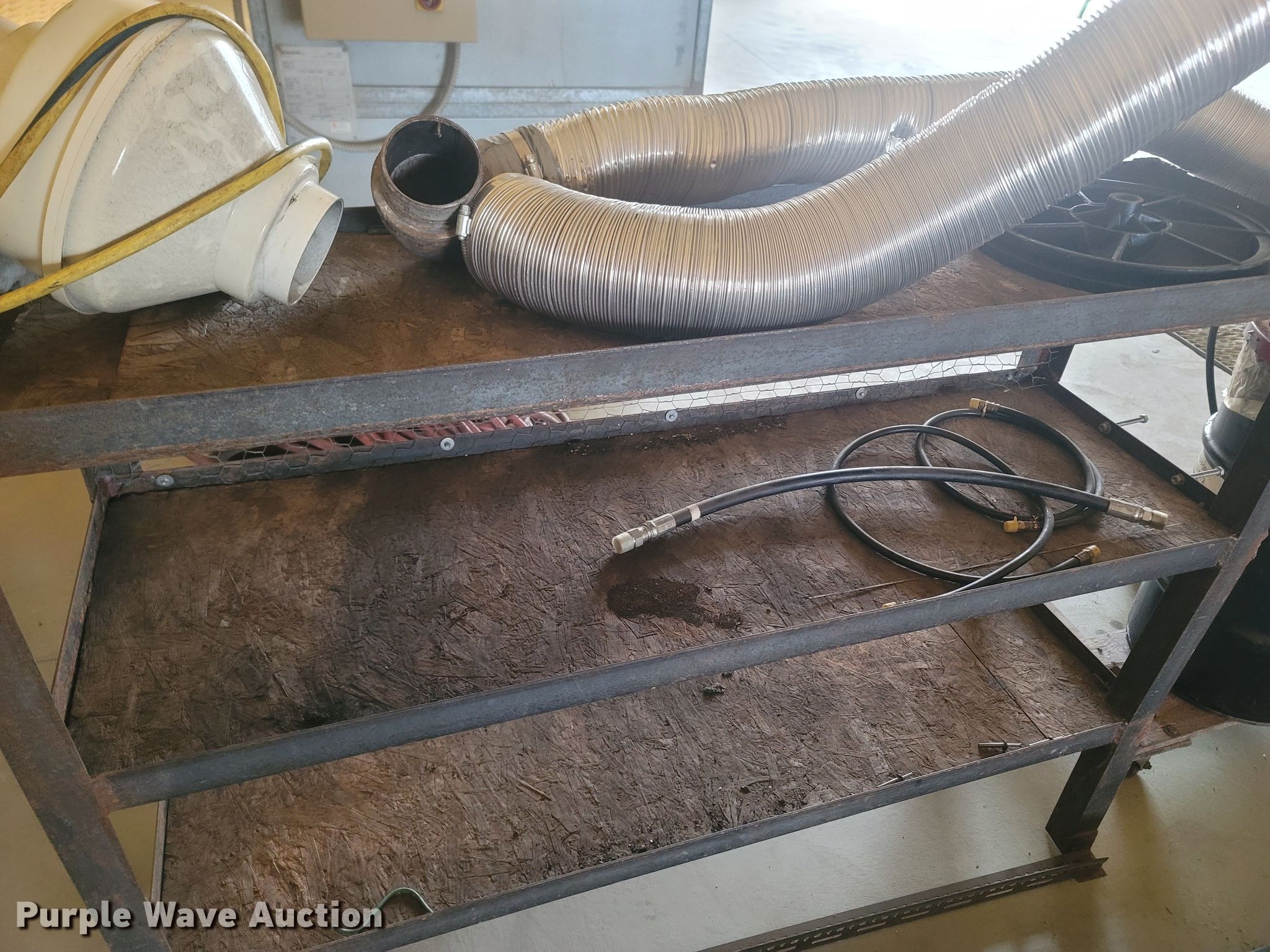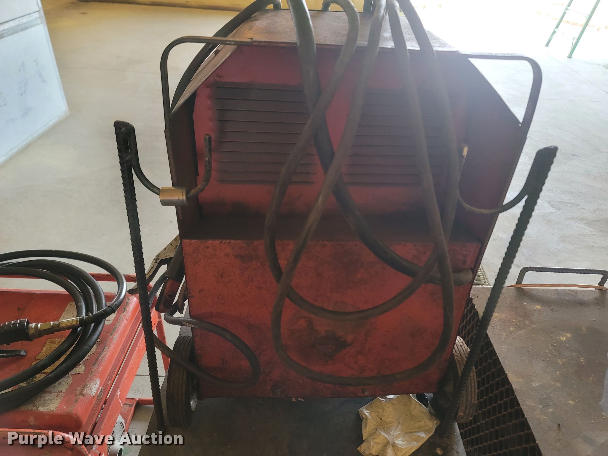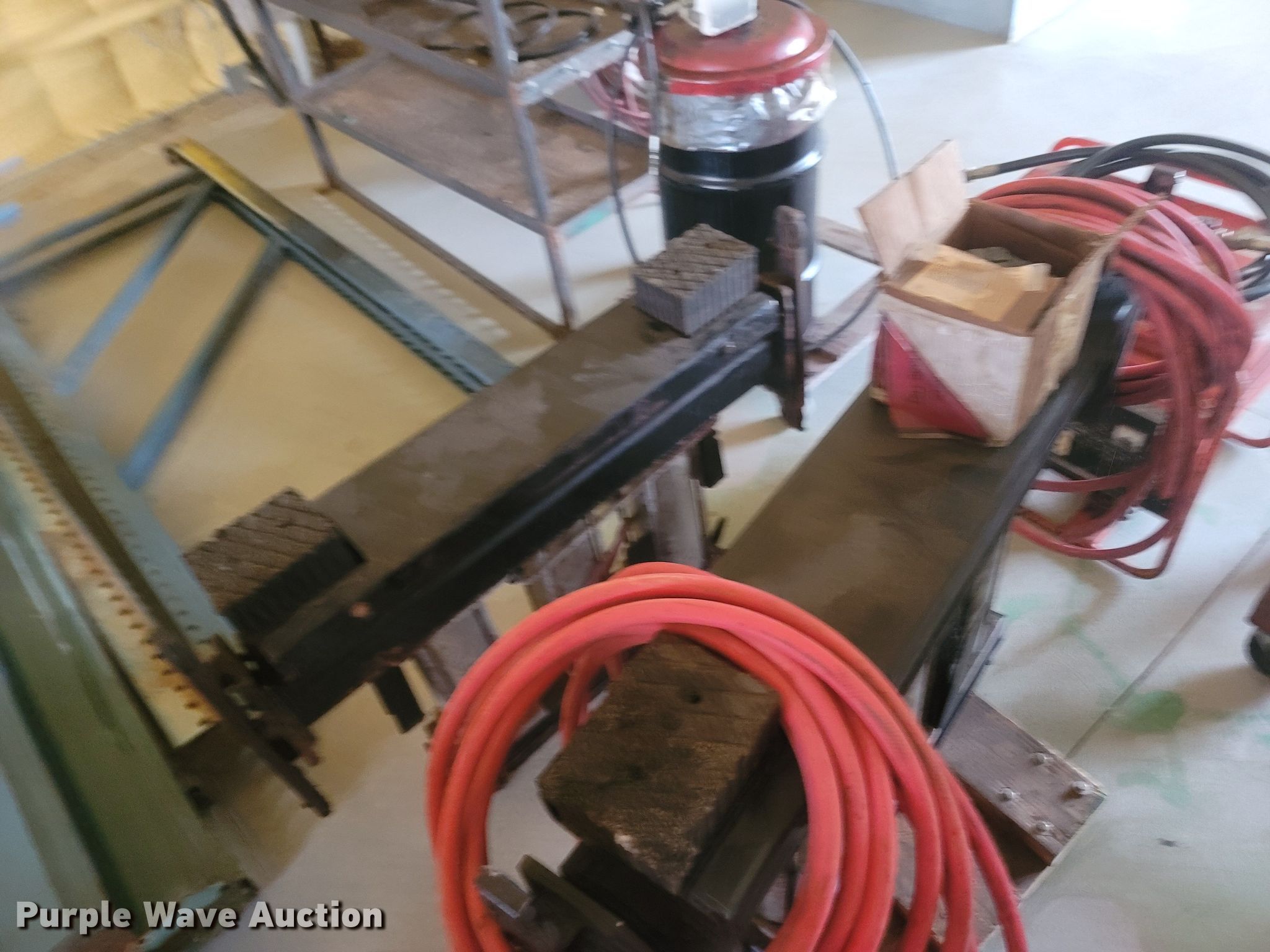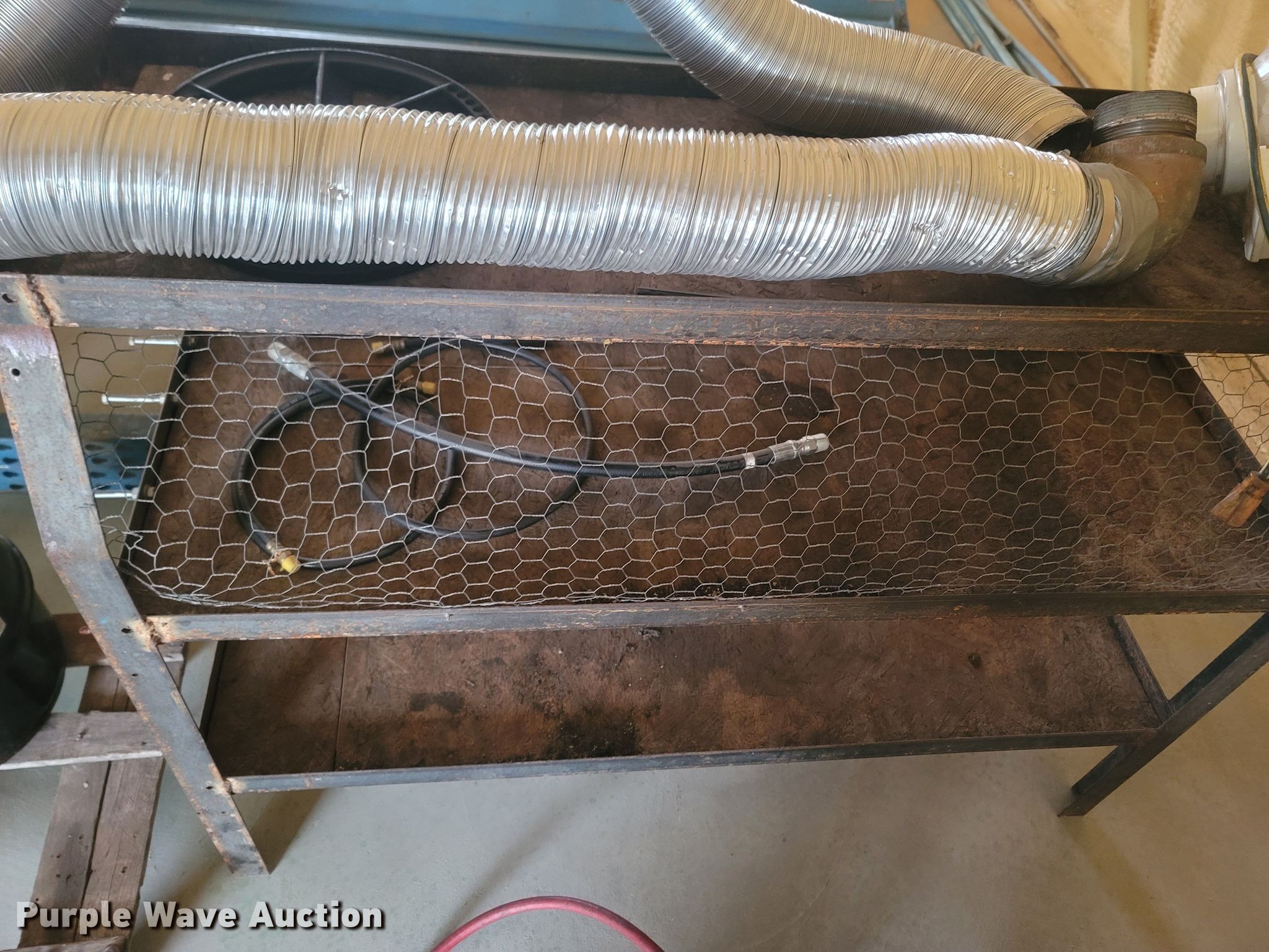Purple Wave is selling a used Tools in Missouri. This item is a Tools with the following: Welding table, Lincoln AC180A, Welding supplies, Box fan, Hydraulic car lift with pump, Vise, (3) crates of hydraulic fluid, Multiquip 3600 generator, 30 gallon grease barrel, Shop made metal shelf, Air hoses, (2) parts washers, (2) cut off saws, (5) spools of air hose, Approx. 44 boxes of fittings, Pneumatic air nibbler, Shop built metal table, Exhaust fume fan with ducting