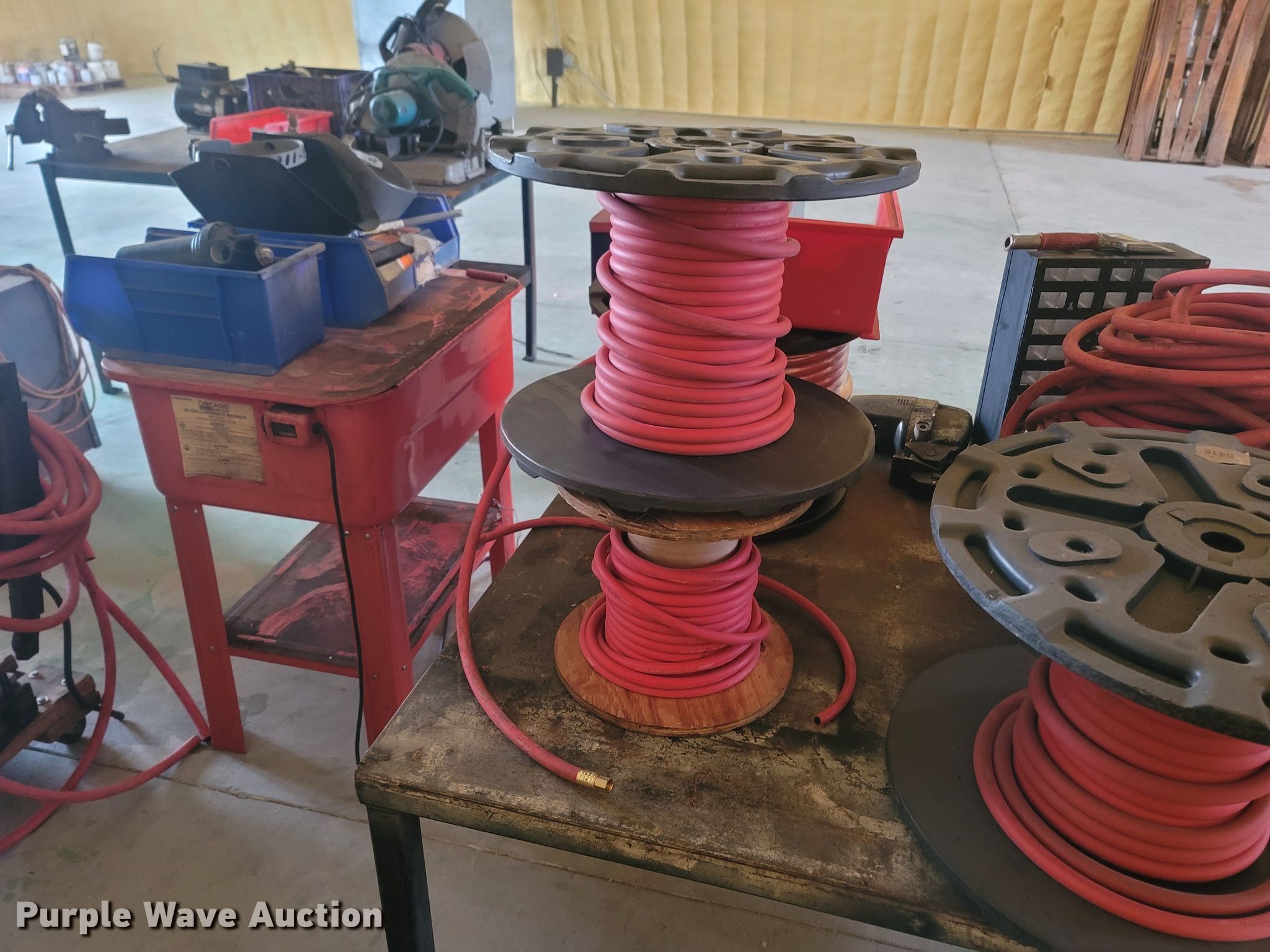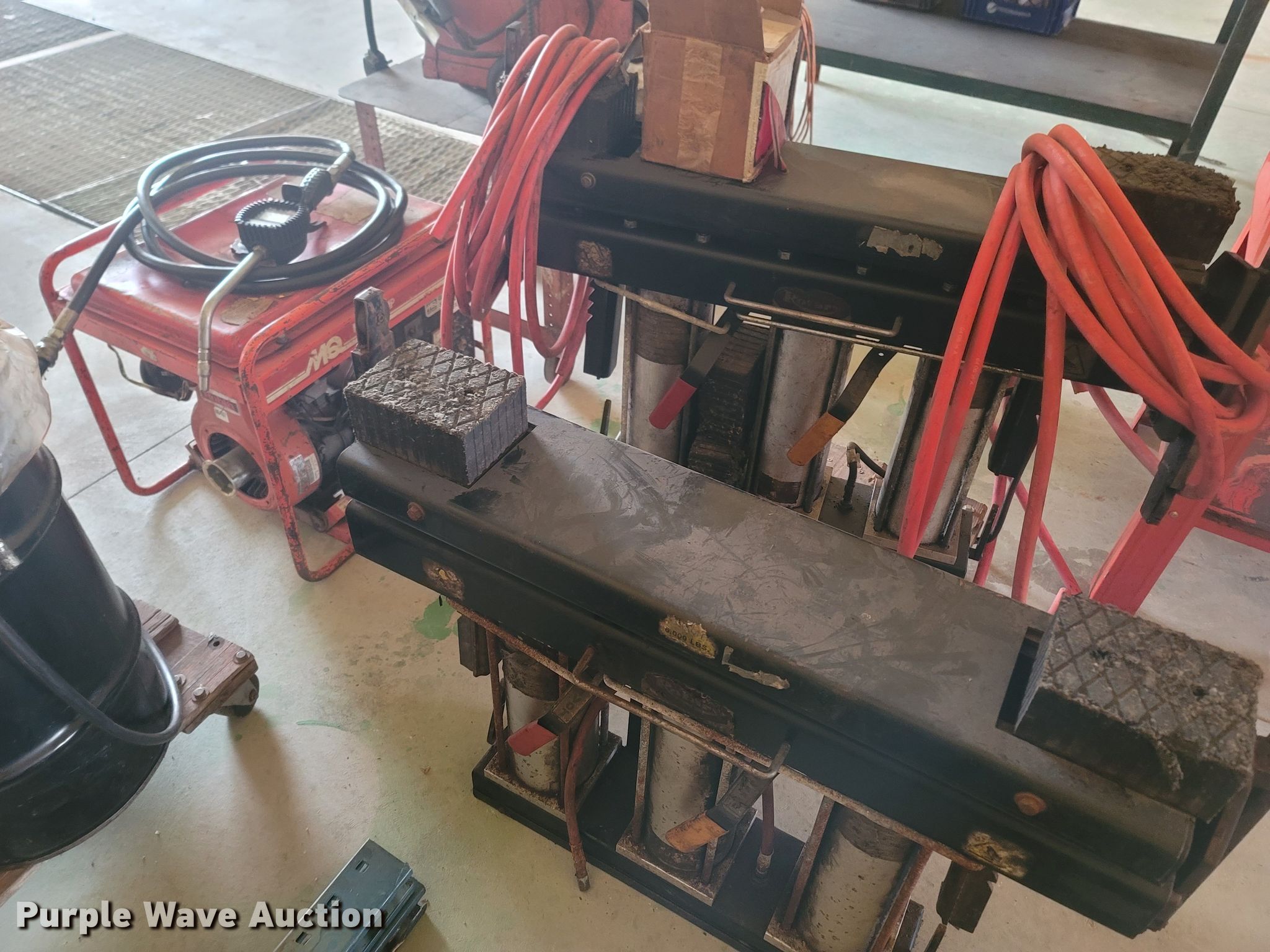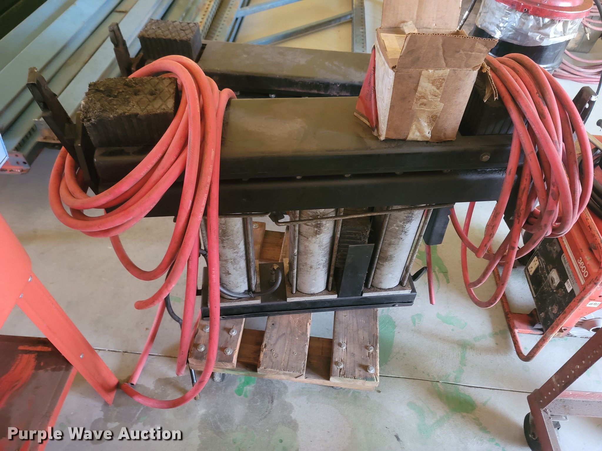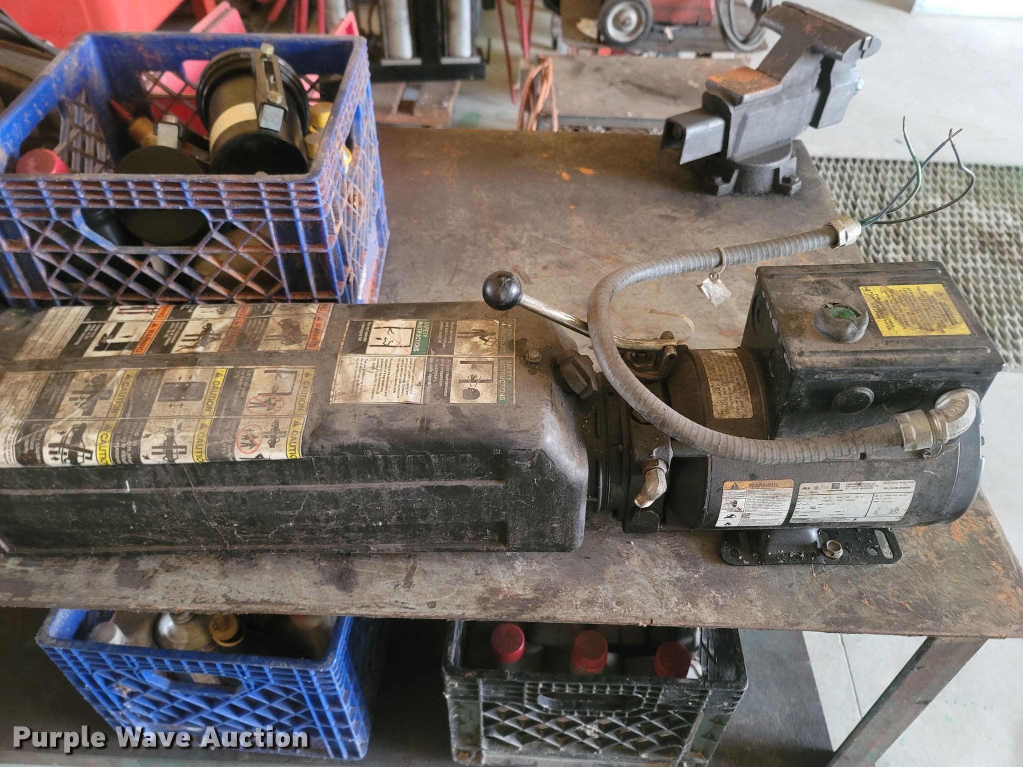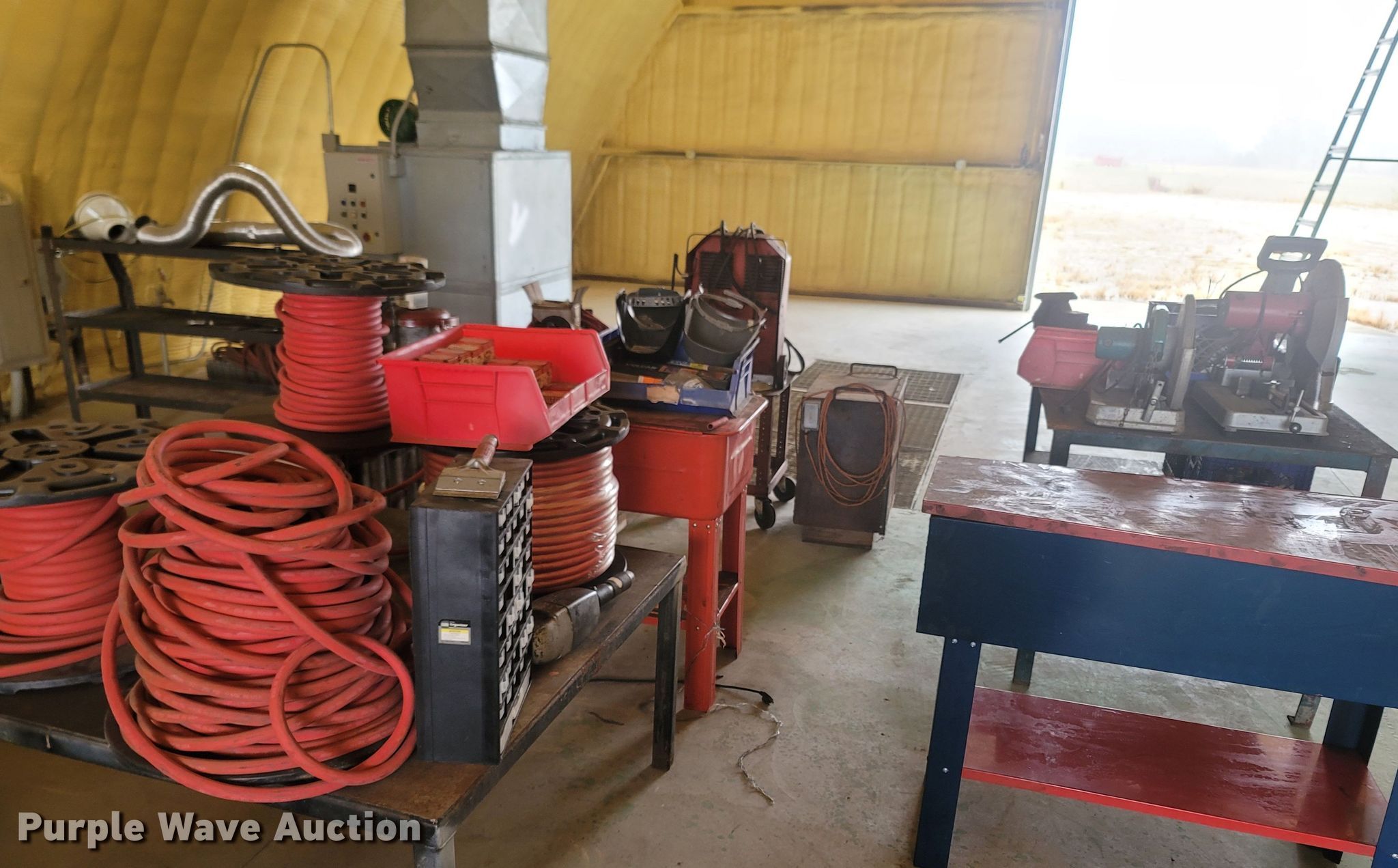 Purple Wave is selling a used Tools in Missouri. This item is a Tools with the following: Welding table, Lincoln AC180A, Welding supplies, Box fan, Hydraulic car lift with pump, Vise, (3) crates of hydraulic fluid, Multiquip 3600 generator, 30 gallon grease barrel, Shop made metal shelf, Air hoses, (2) parts washers, (2) cut off saws, (5) spools of air hose, Approx. 44 boxes of fittings, Pneumatic air nibbler, Shop built metal table, Exhaust fume fan with ducting