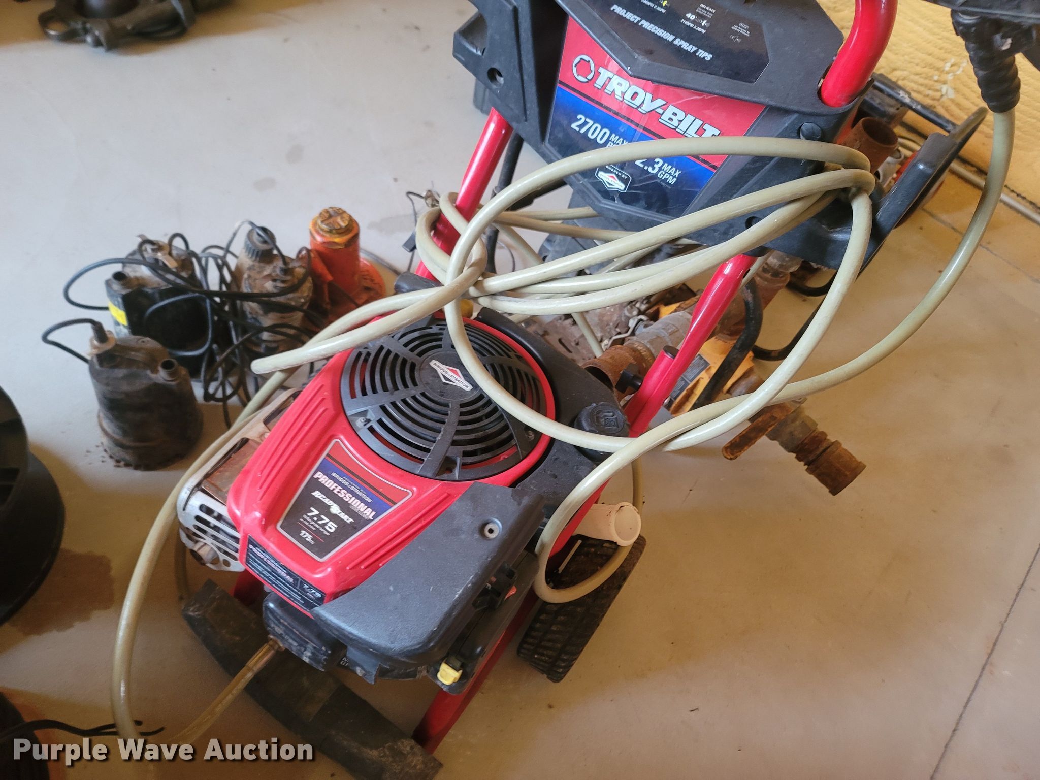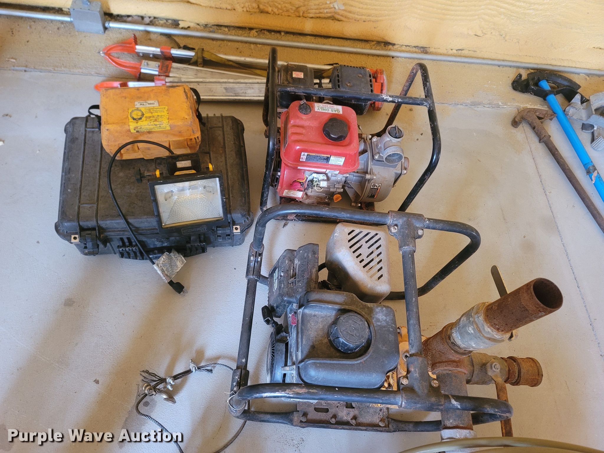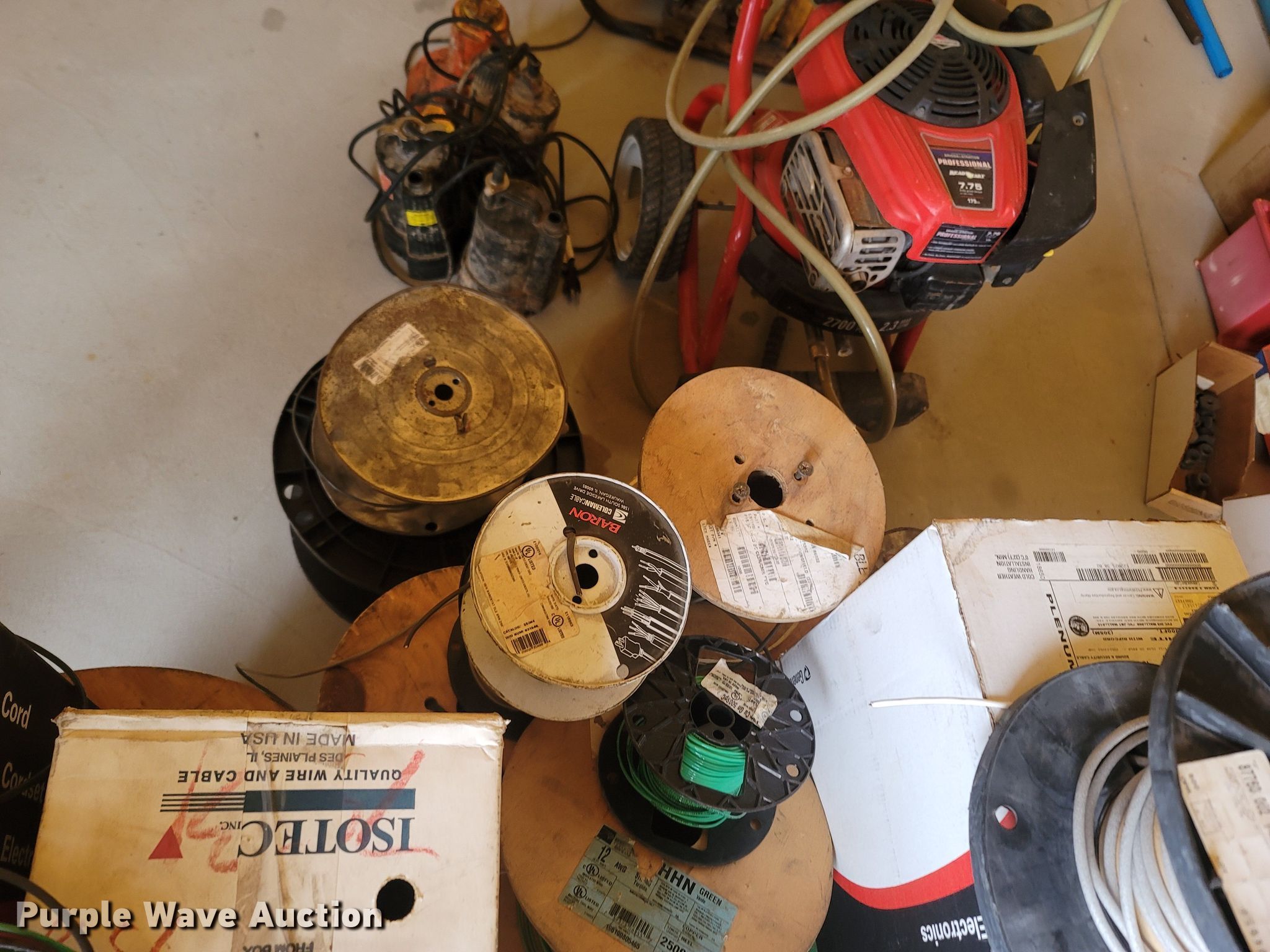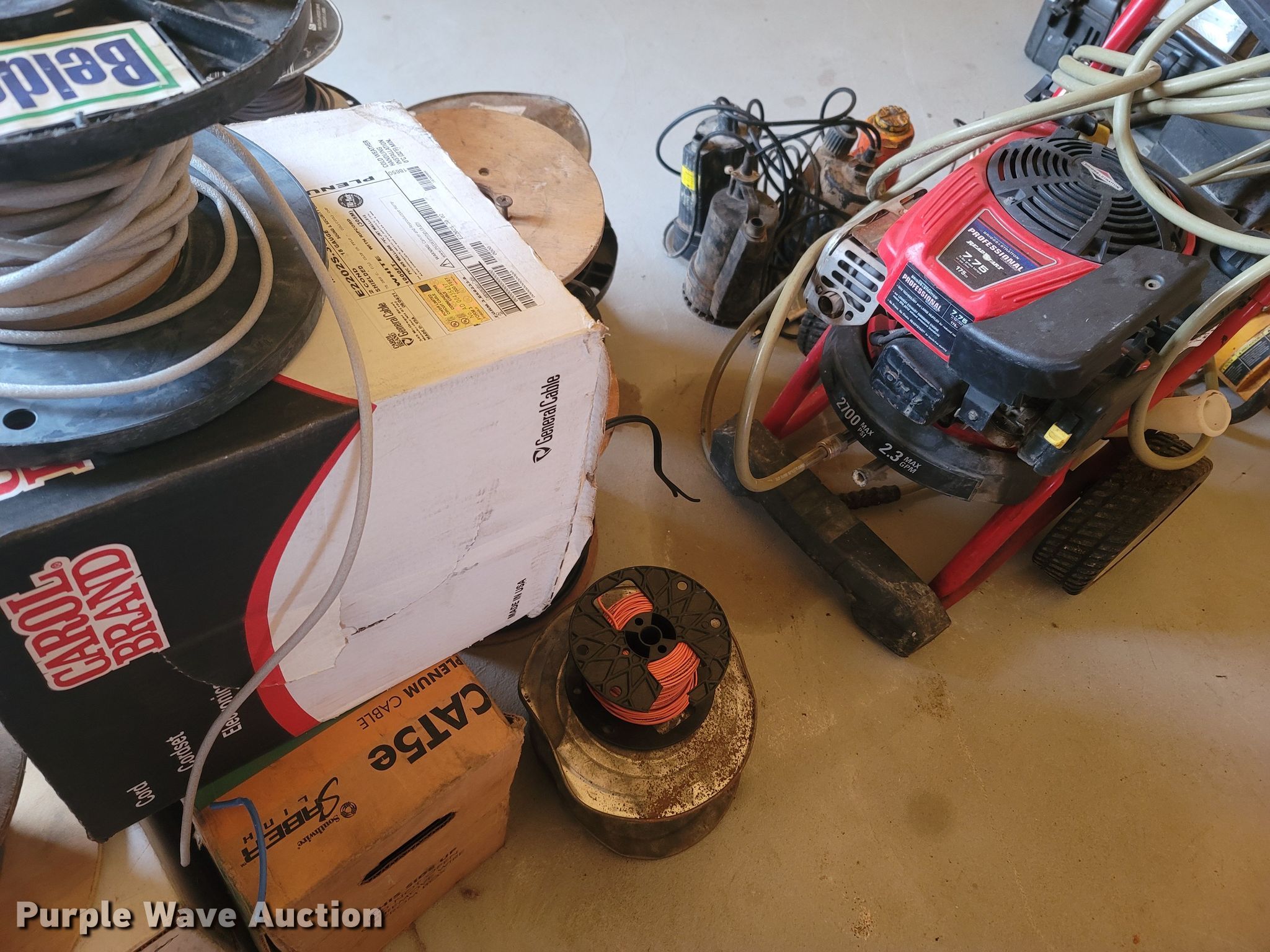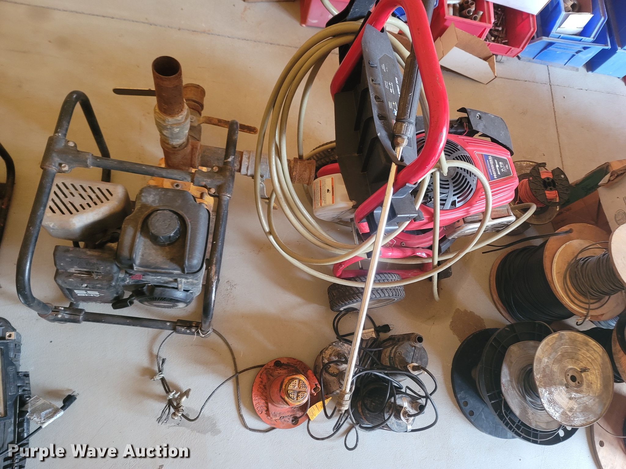 Purple Wave is selling a used Tools in Missouri. This item is a Tools with the following: Multiple spools and gauges of electrical wire, Troy-Bilt power washer, (3) sump pumps, (2) engine powered liquid pumps, Pentax AL-180 plumb bob, Fuel pressure kit, Tripod for plumb, Unknown operating conditions