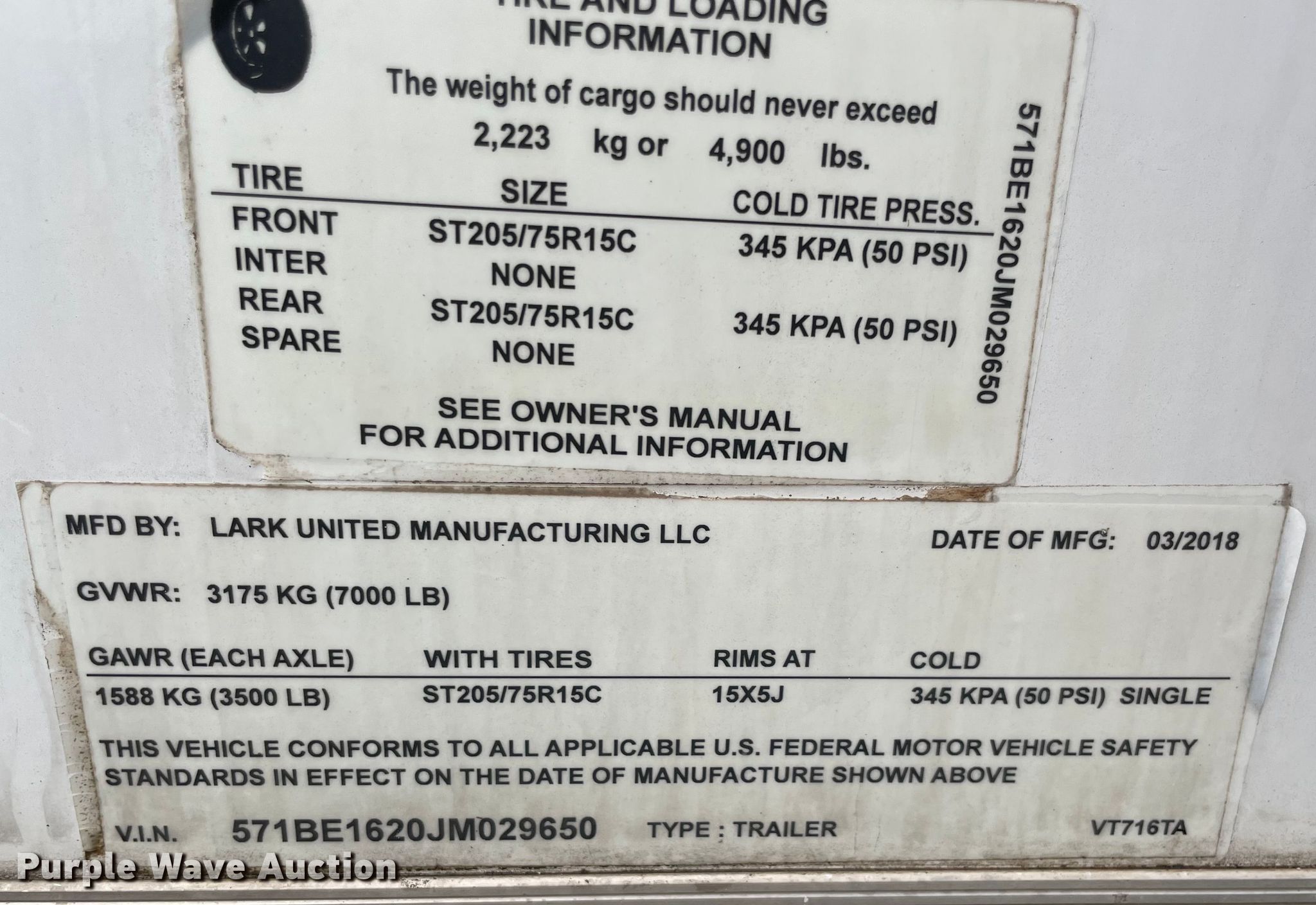 Purple Wave is selling a used Enclosed Cargo Trailer in Oklahoma. This item is a 2018 Lark enclosed cargo trailer with the following: VIN: 571BE1620JM029650, Unit #: 1537-1