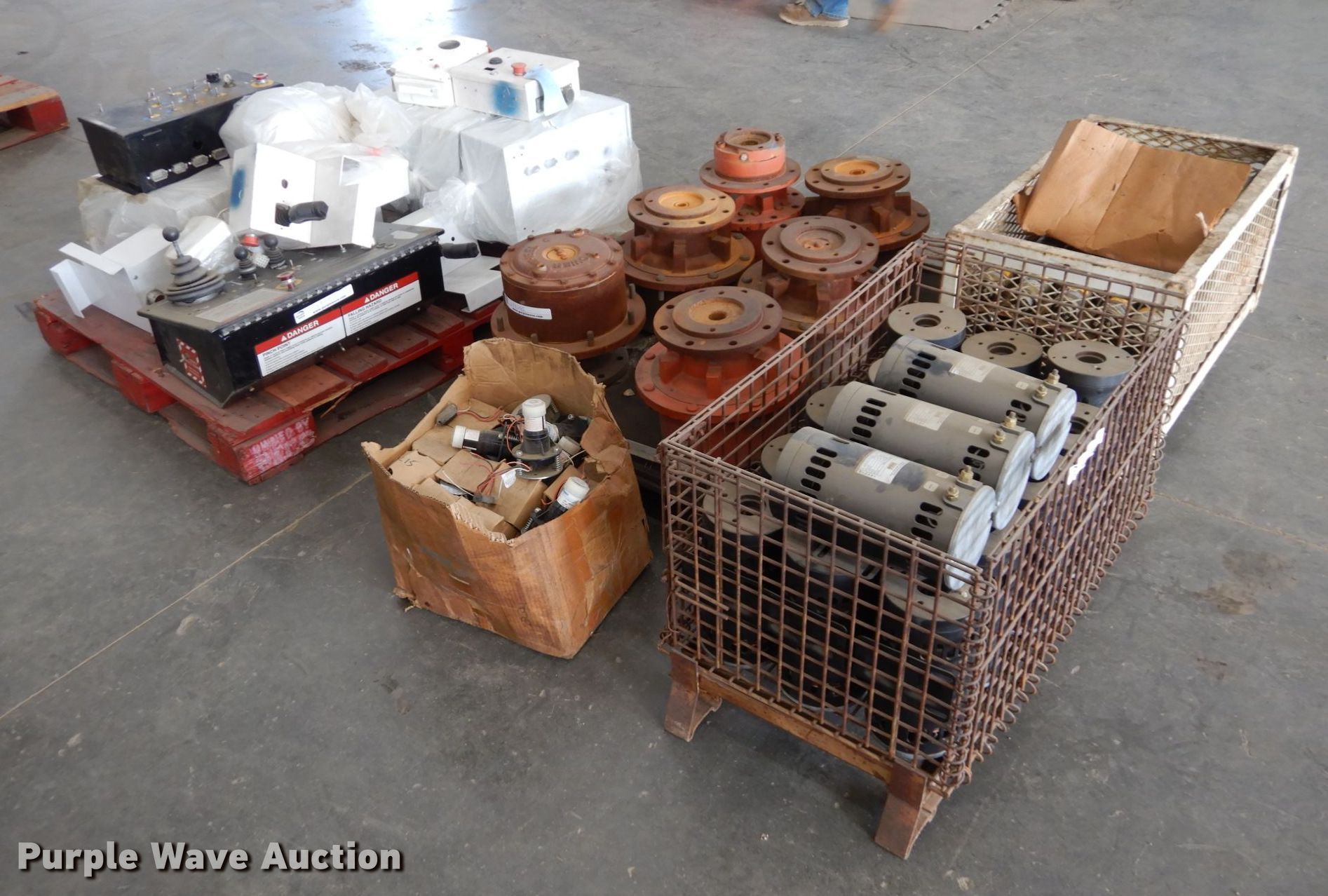 Snorkelift lift parts. Electric solenoids, (18) electric motors, (6) drive motors , Auto level sensors , Control boxes. American Equipment Sales Inc., Retirement Auction. 1723 E 1500 Rd. Lawrence, KS 66044