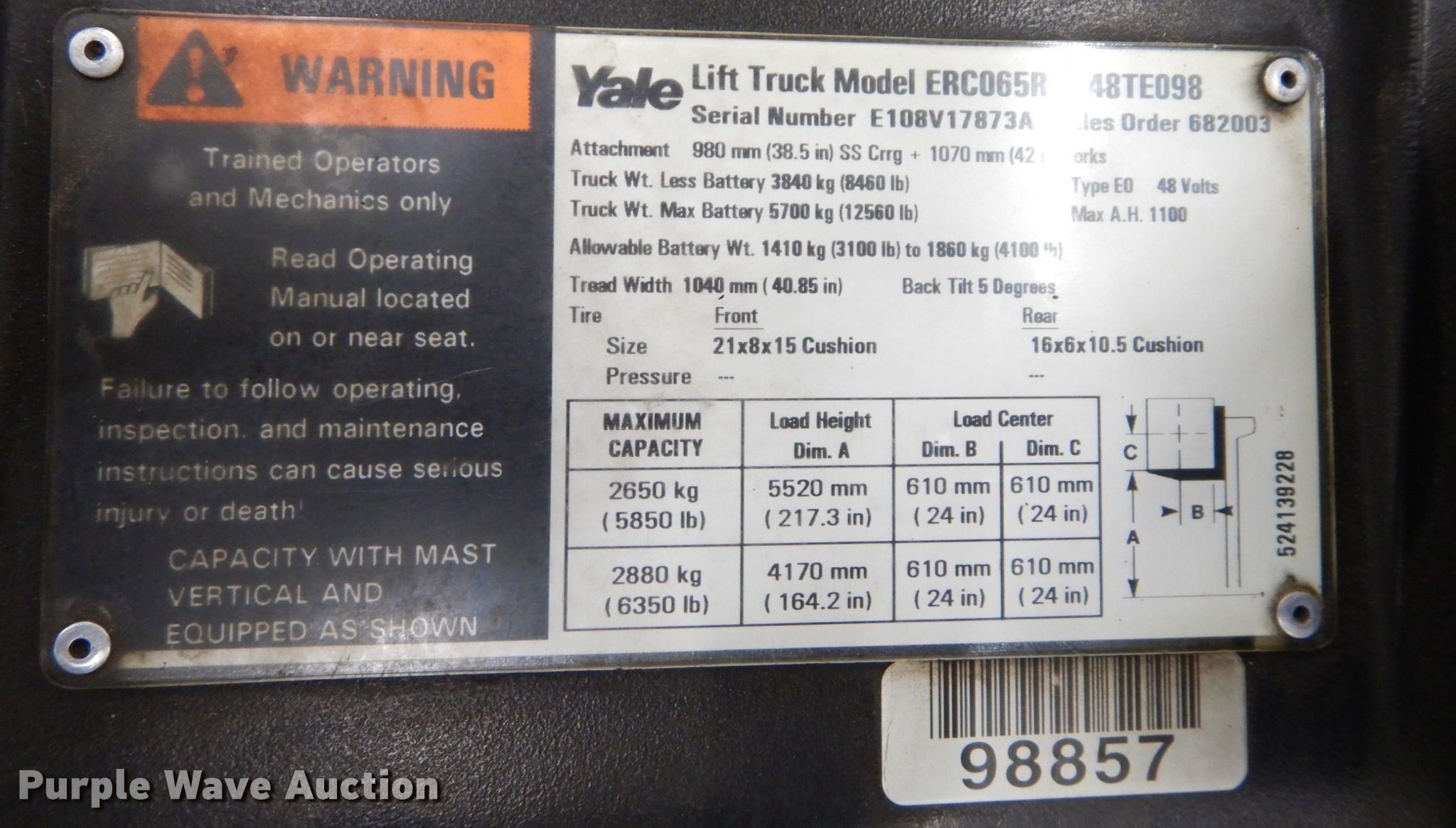 Purple Wave is selling a used Warehouse Forklift in Kansas. This item is a Yale ERC065RGN48TE098 forklift with the following: Hours: 8,927 on meter, Serial: E108V17873A