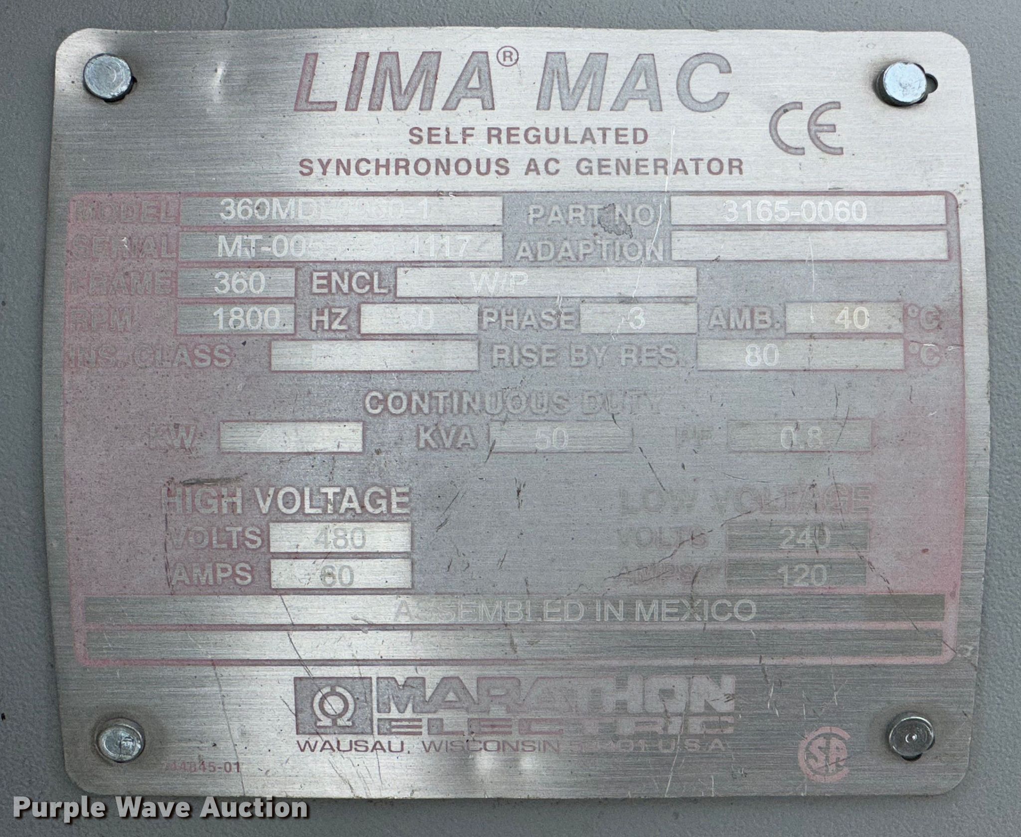 Purple Wave is selling a used Generator Set in Kansas. This item is a Lima Mac 360MDL0060-1 generator with the following: Serial: MT-0055236-1117