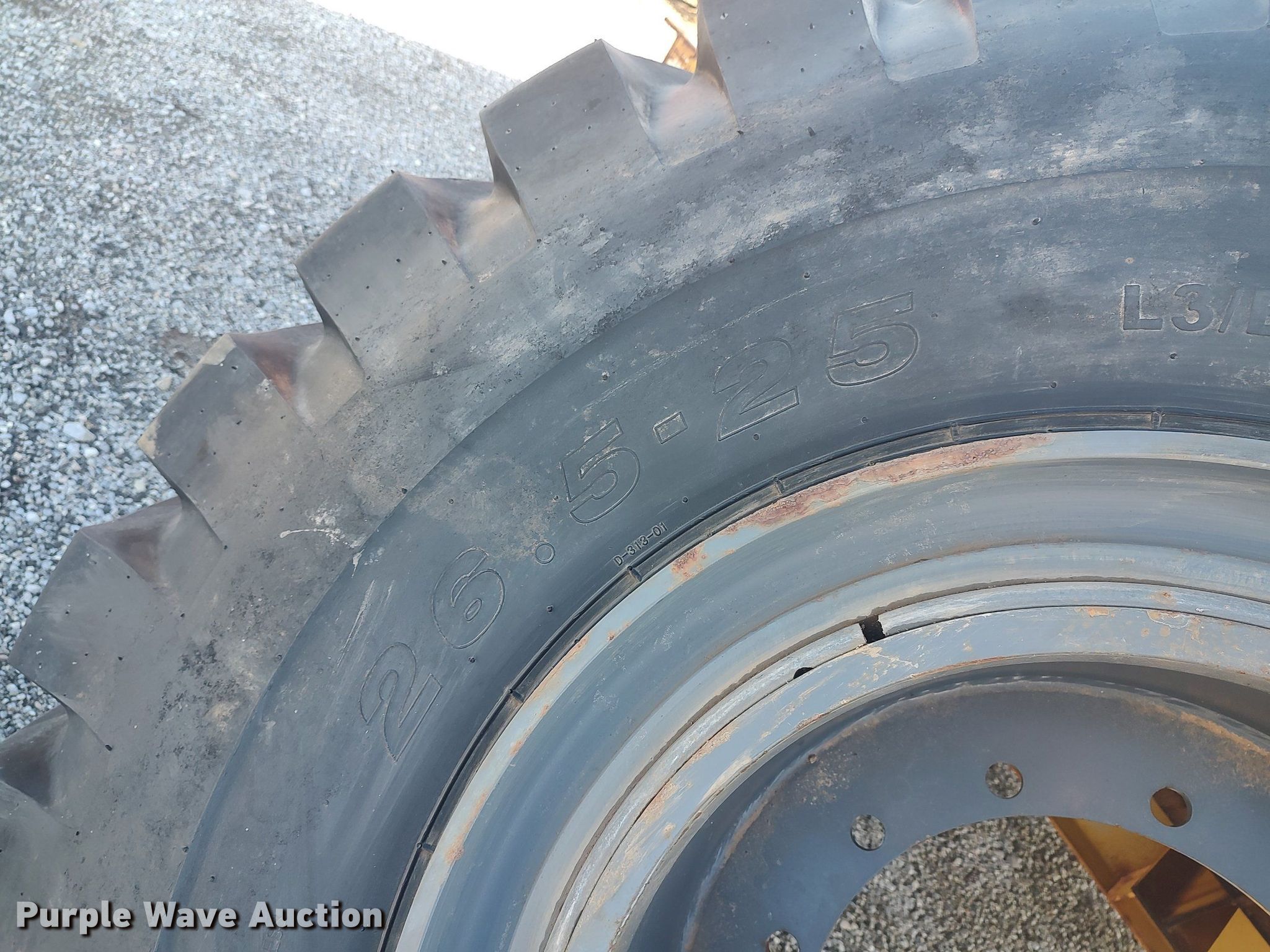 Purple Wave is selling a used Industrial Tires or Tracks in Oklahoma. This item is a Roadstone DL-3 tire and wheel with the following: Size: 26.5-25, Unused