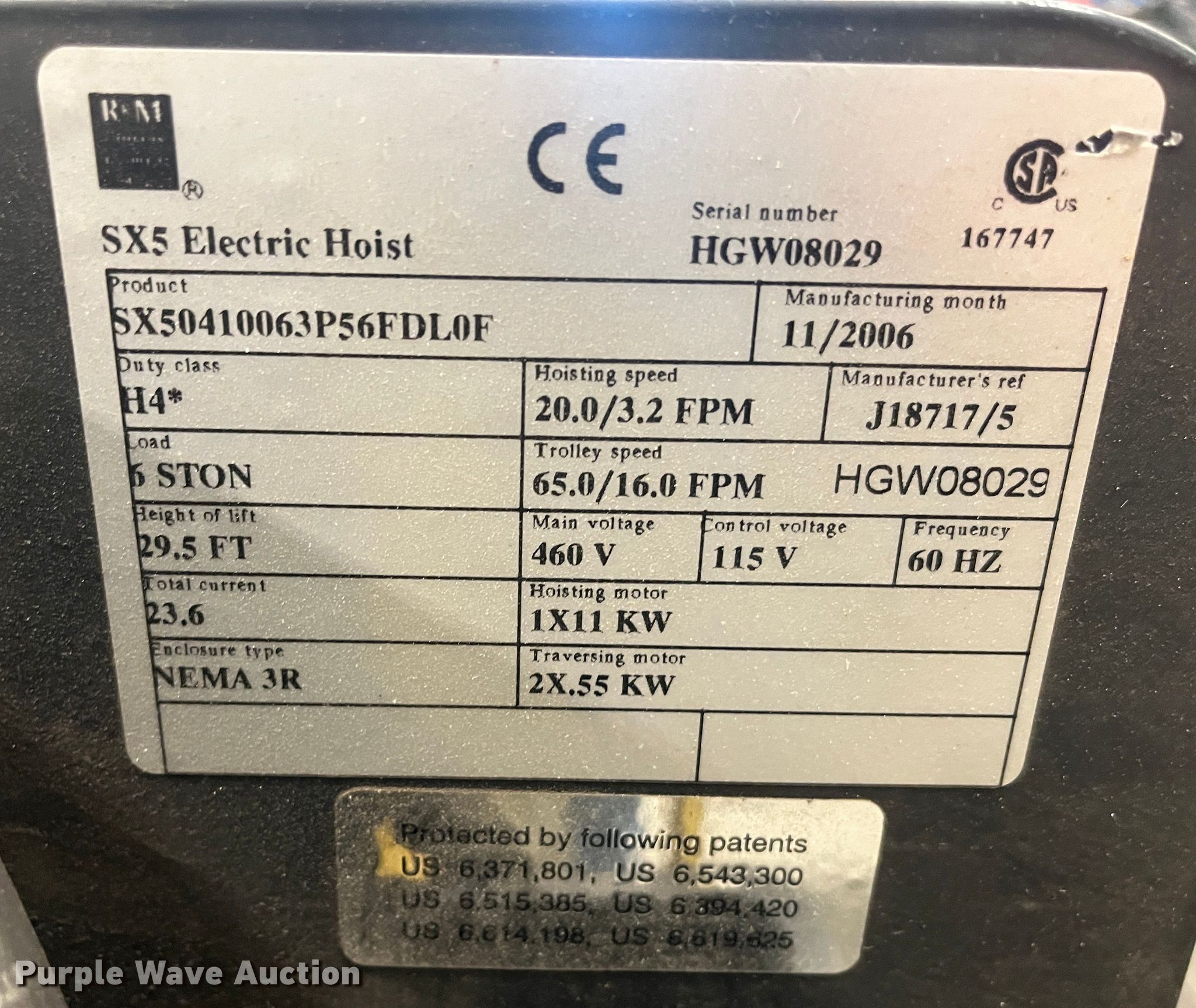 Purple Wave is selling a used Overhead or Straddle Crane in Kansas. This item is a 2006 R&M cable hoist with the following: Electric motor, 450V, 6 ton capacity, Serial: HGW08029