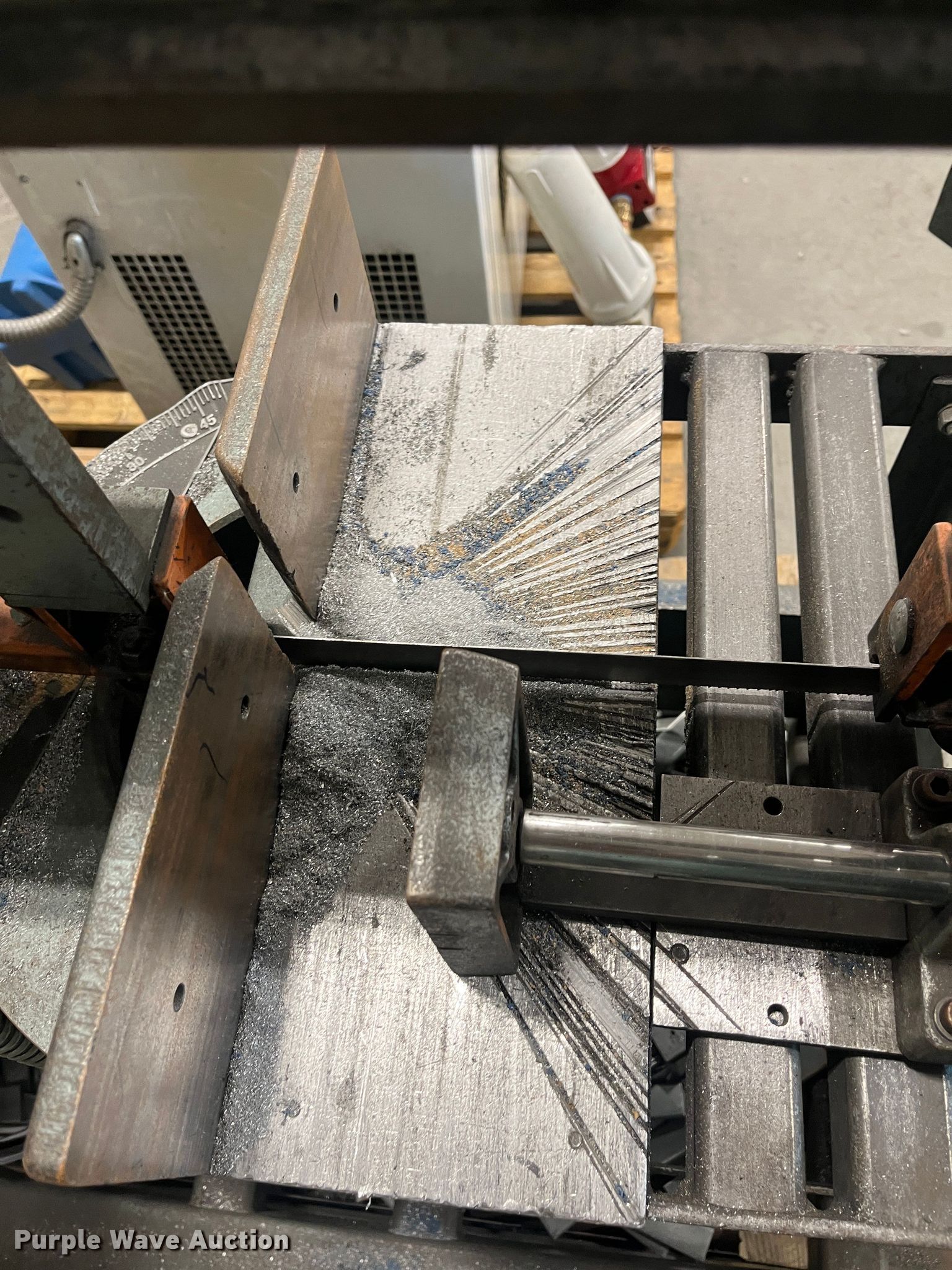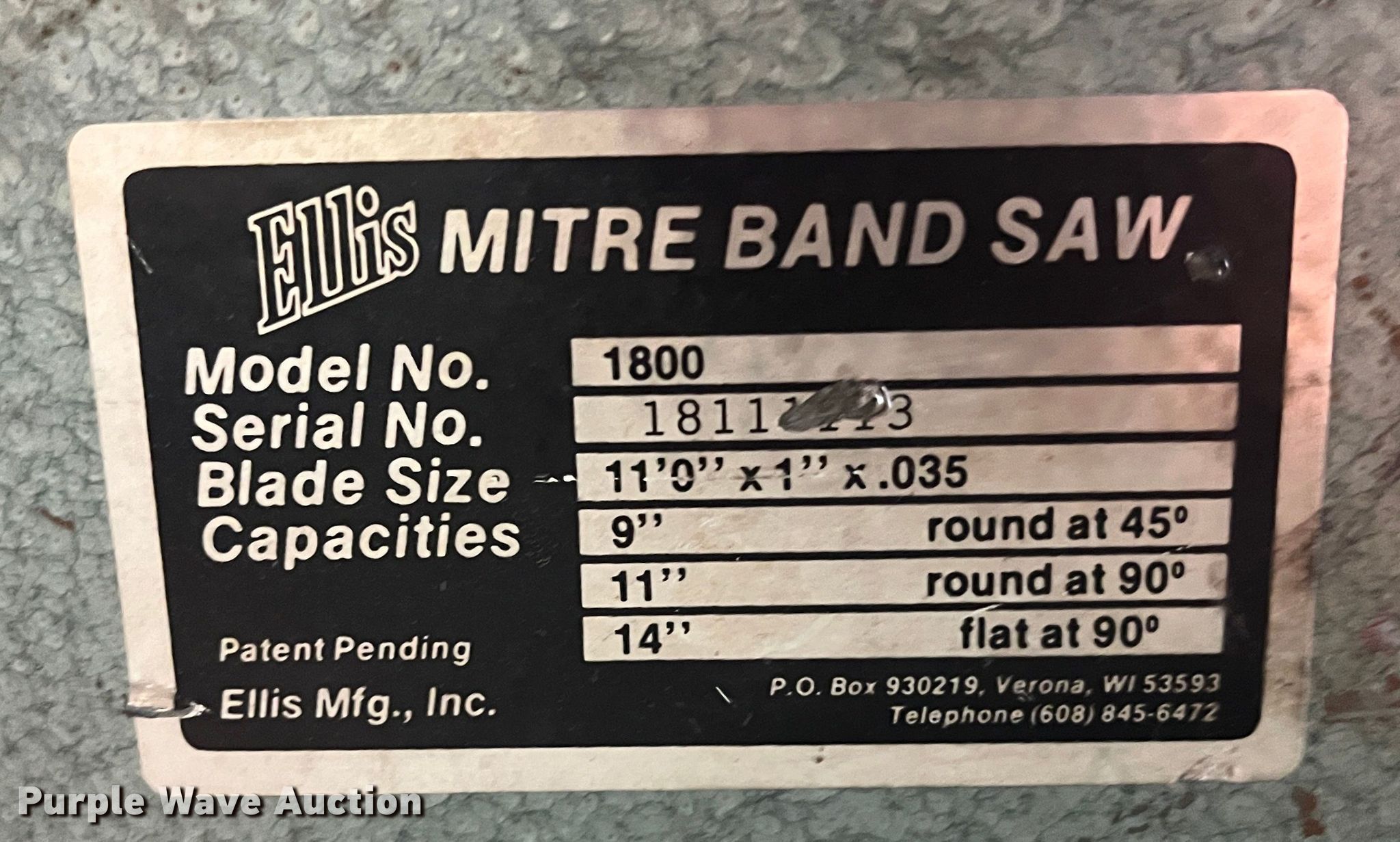 Purple Wave is selling a used Machine Shop Tools and Equip. in Kansas. This item is a Ellis 1800 mitre bandsaw with the following: 11' blade, Capacity, 9" round at 45 degrees, 11" round at 90 degrees, 14" flat at 90 degrees, Approx. 5 additional unused blades