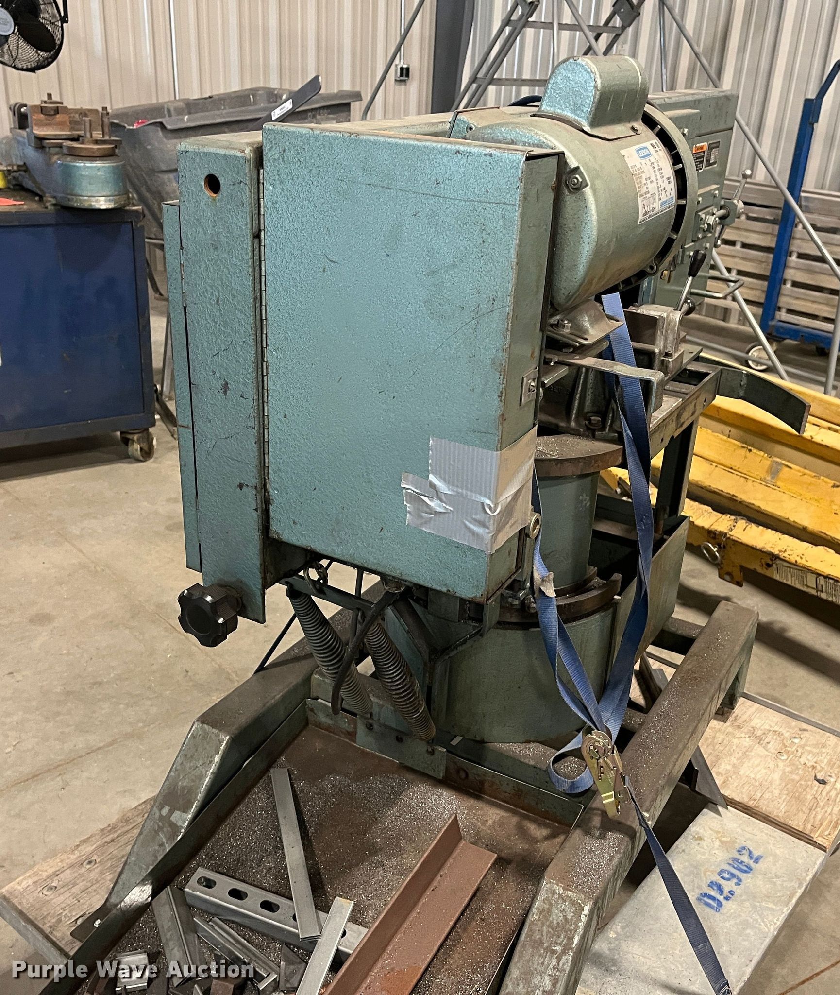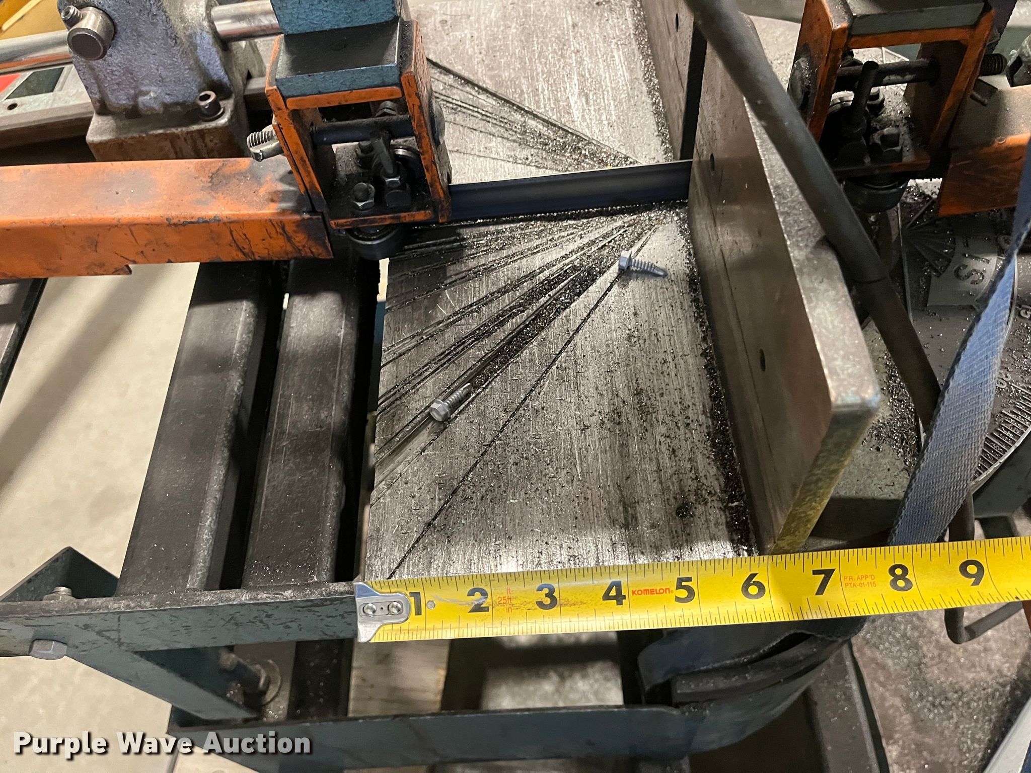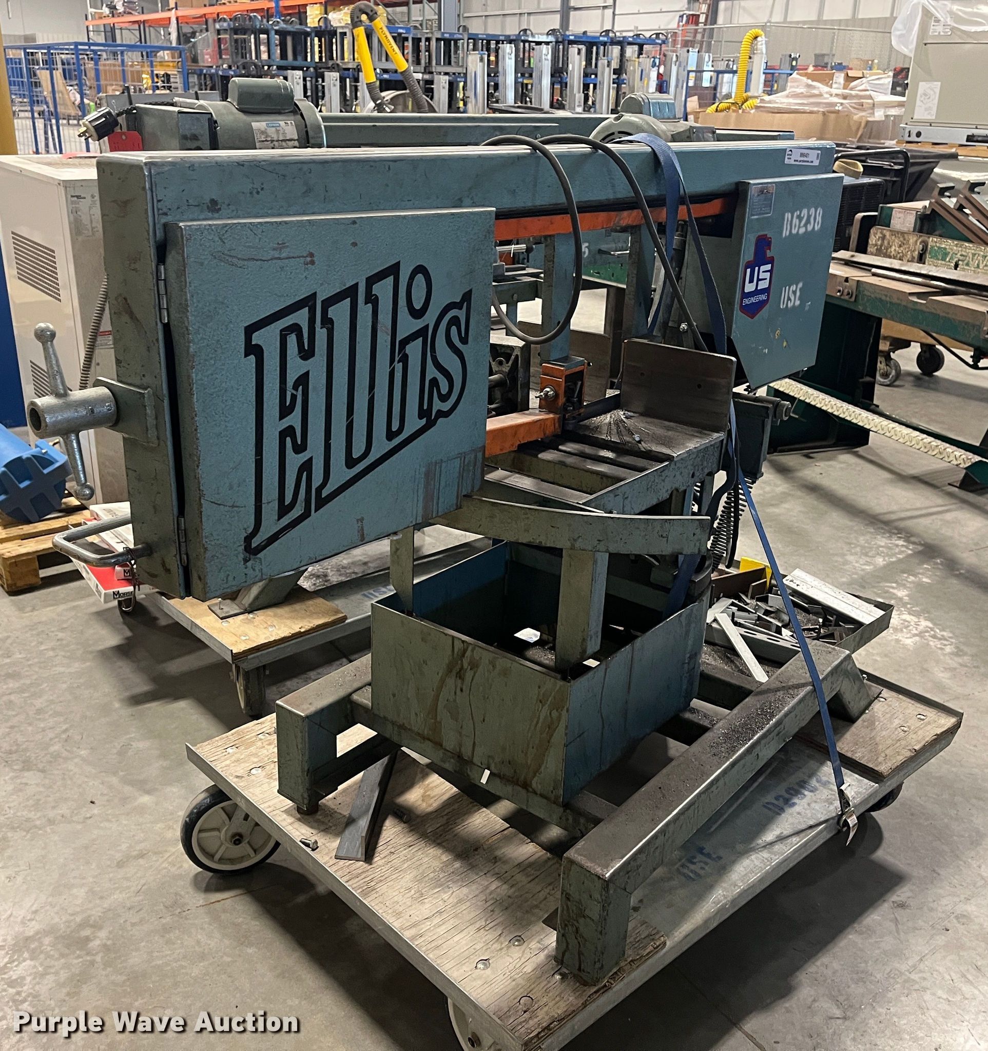 Purple Wave is selling a used Machine Shop Tools and Equip. in Kansas. This item is a Ellis 1800 mitre bandsaw with the following: 11' blade, Capacity, 9" round at 45 degrees, 11" round at 90 degrees, 14" flat at 90 degrees, Serial: 18111160