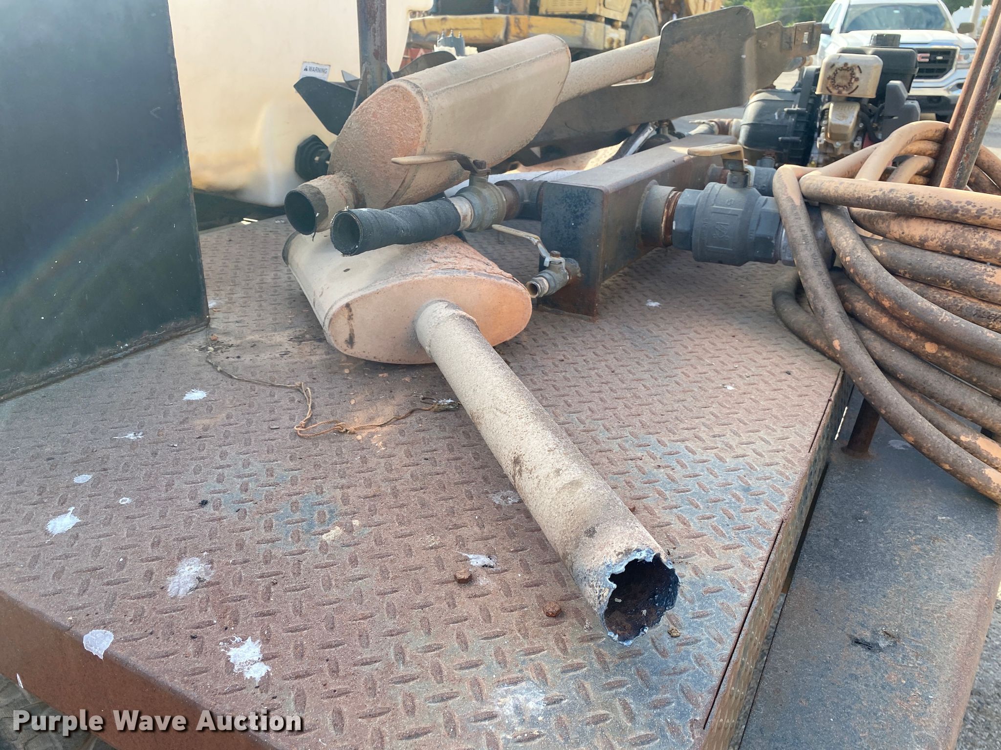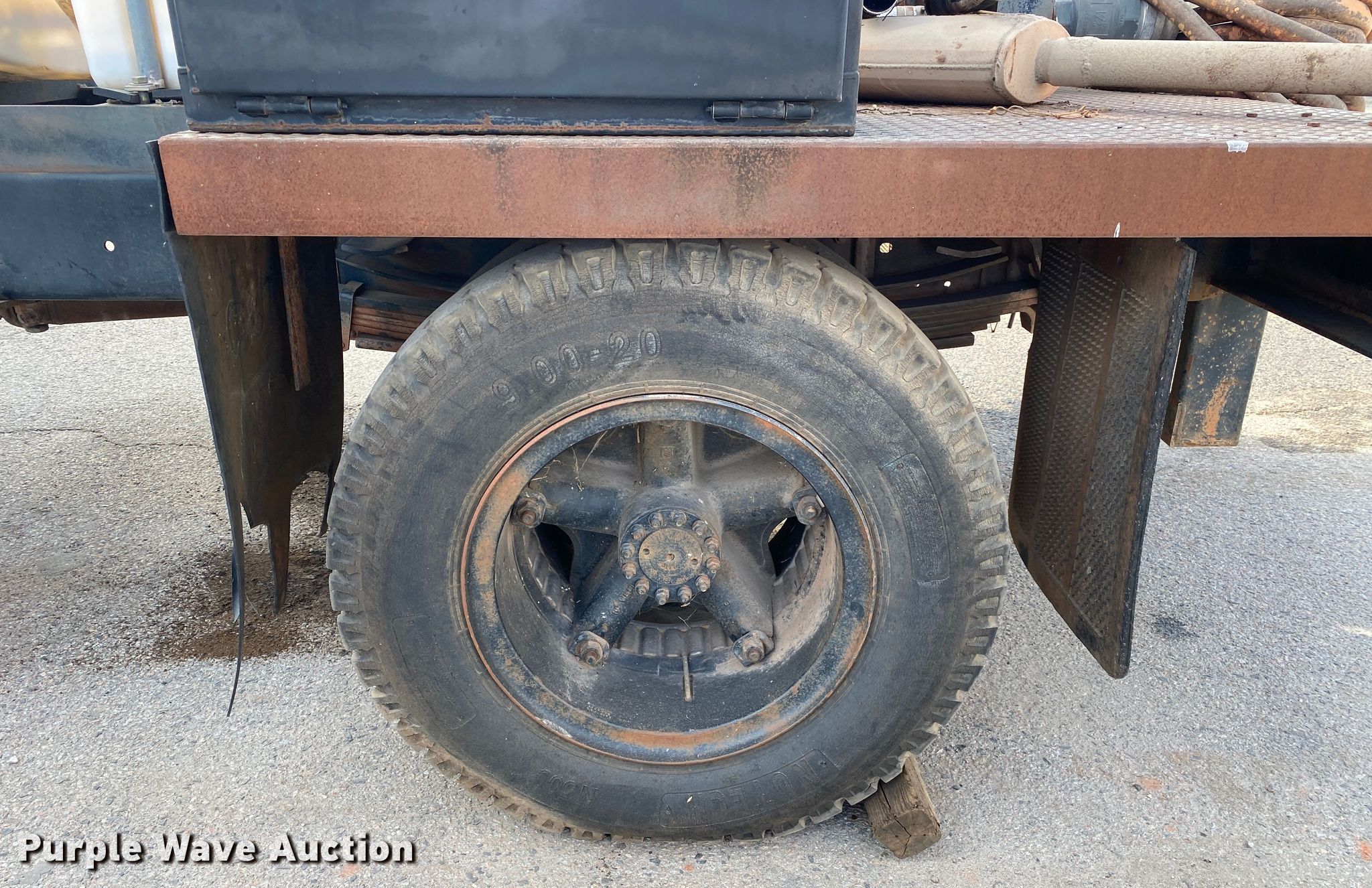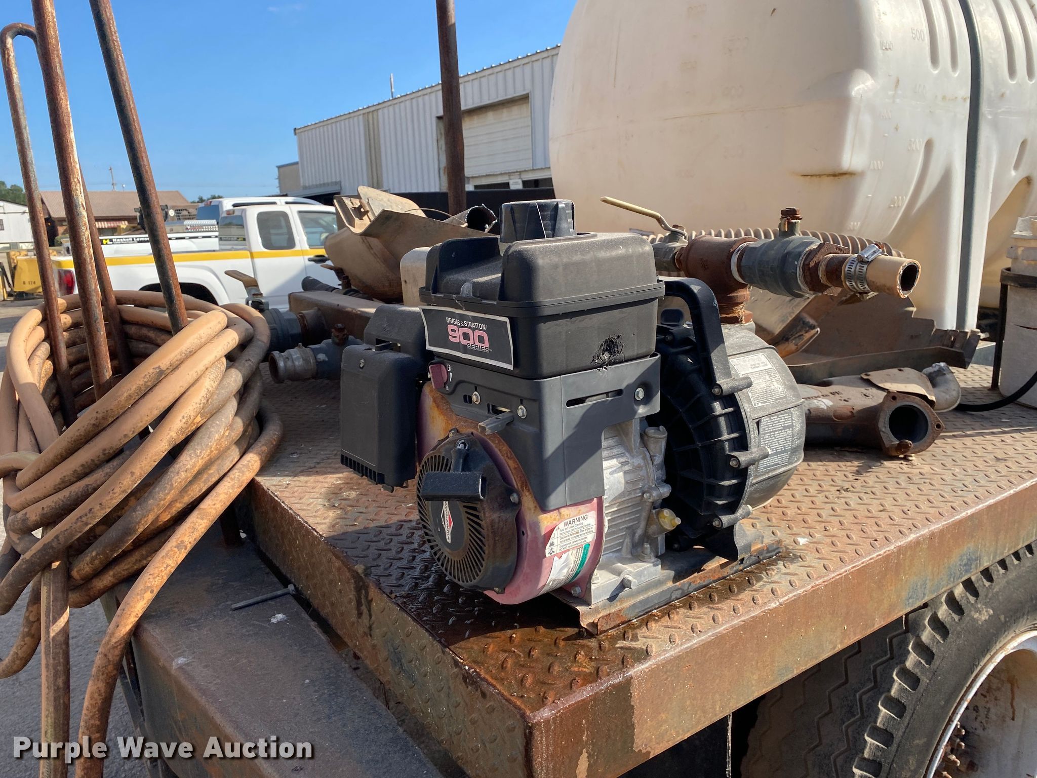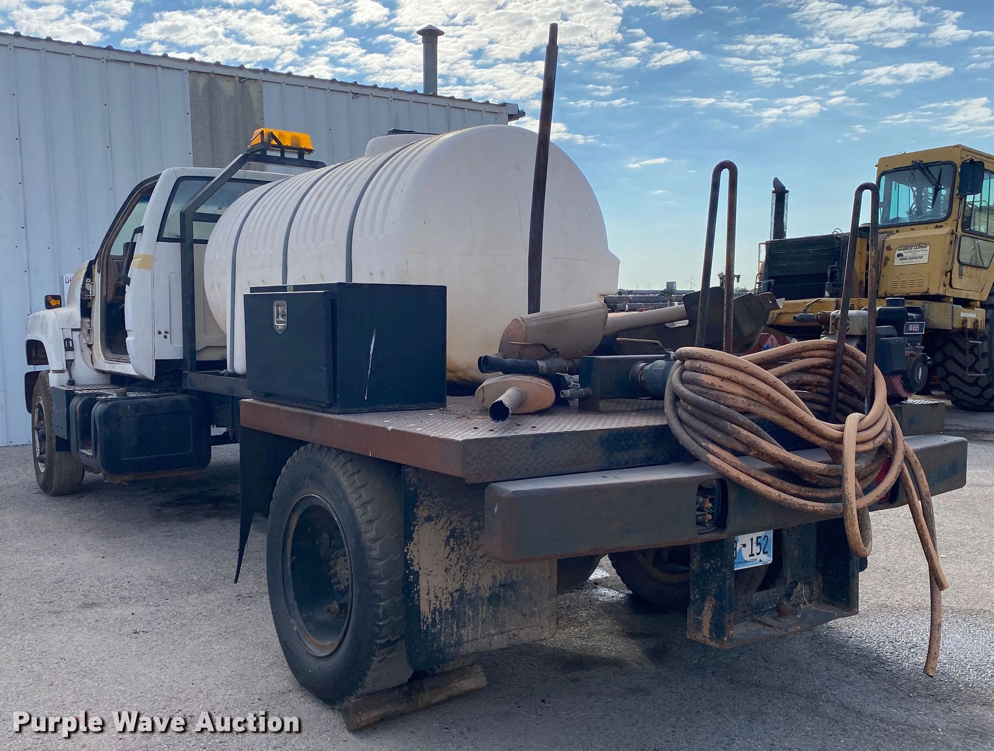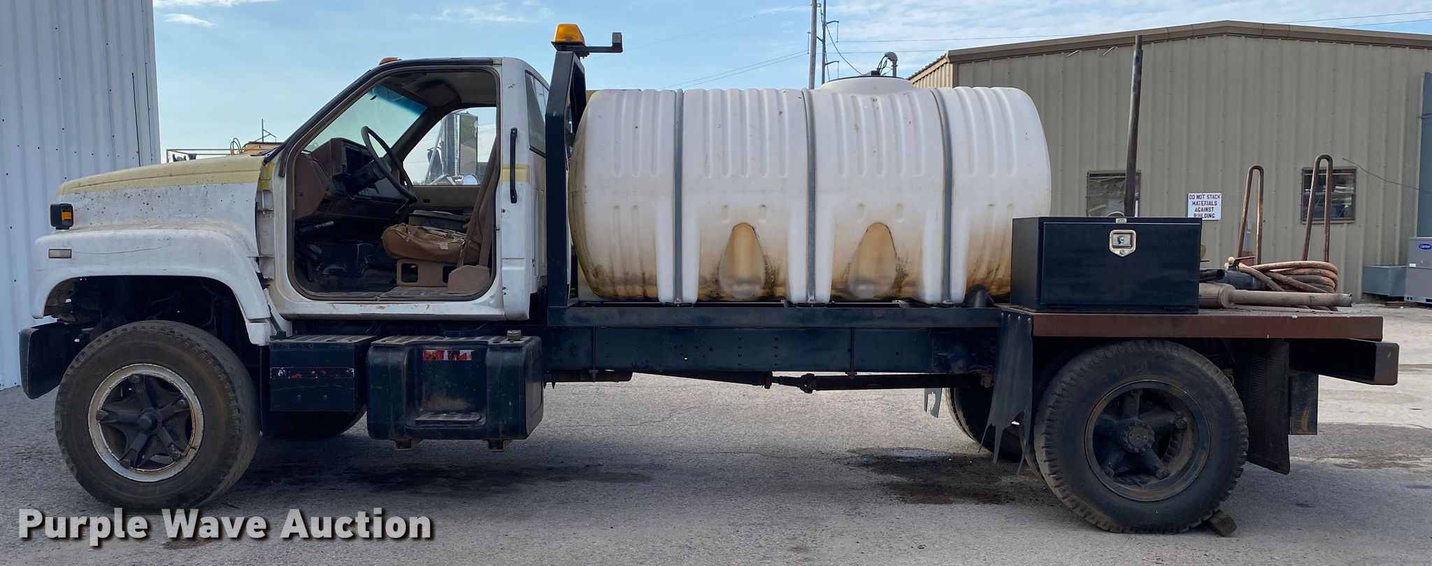 1991 Chevrolet Kodiak flatbed truck. Miles: 115,947 on odometer, Hours: 1,280 on meter, VIN: 1GBJ7H1P5MJ111691. Engine Displacement: 6.0L, Cylinders: 8, Fuel type: Gas. Transmission Manual, Speed: 5, plus 2. Chassis Axles: Single, Suspension: Spring, Brakes: Hydraulic. Interior Heat. Features Flatbed 13' L x 93" W, Briggs and Stratton 900 engine Fuel type: Gas, Cylinder: 1, Poly tank Capacity: 700 gallon. Tires Size: 9.00-20. Notes Unknown operating condition of Briggs & Stratton engine, Parts missing, Non-operational unit. Oklahoma classic title. Title distribution may be delayed up to 14 days from verification of funds. Haskell Lemon Construction Co. 1903 West Independence Street. Shawnee, OK 74801
