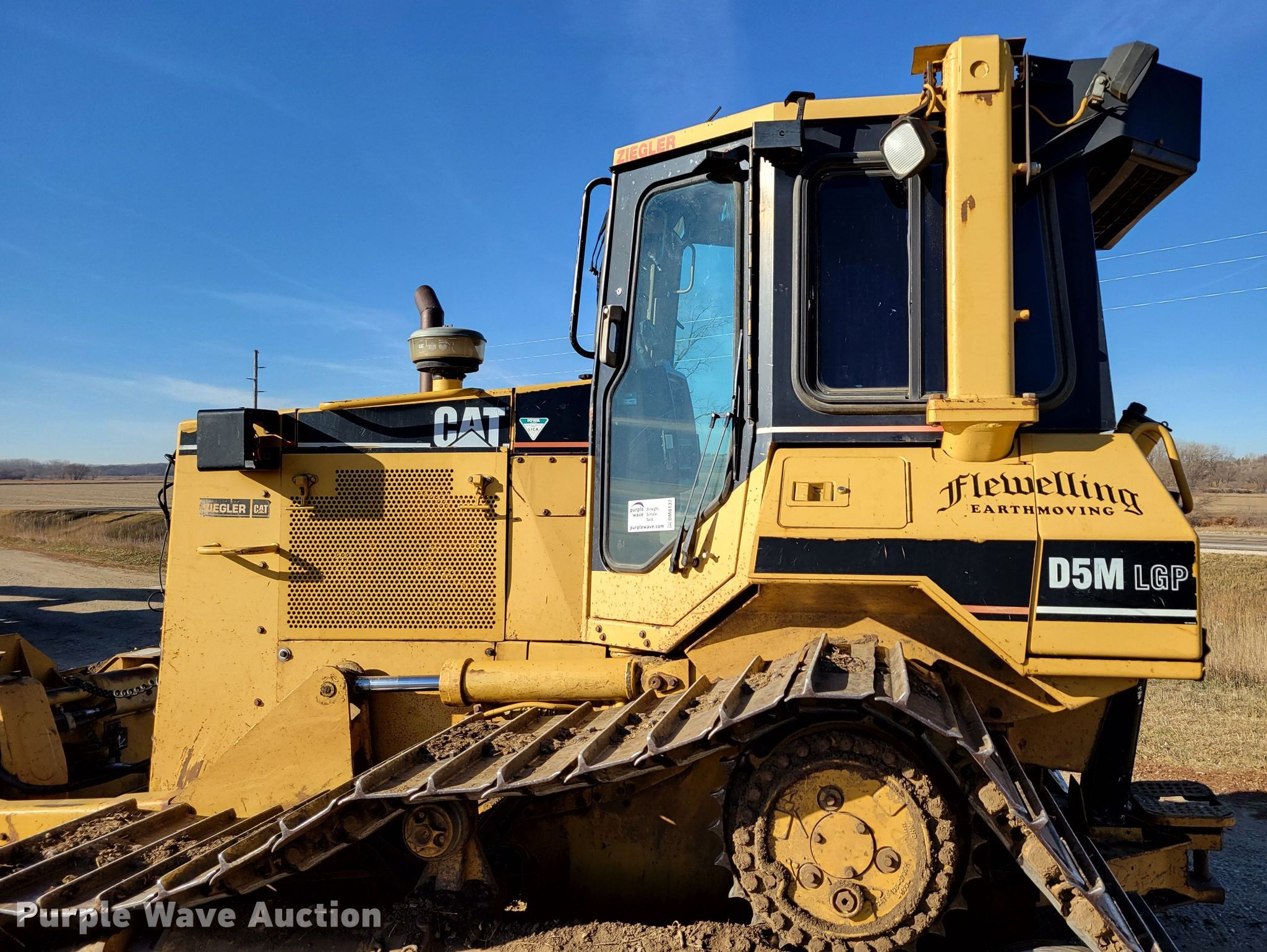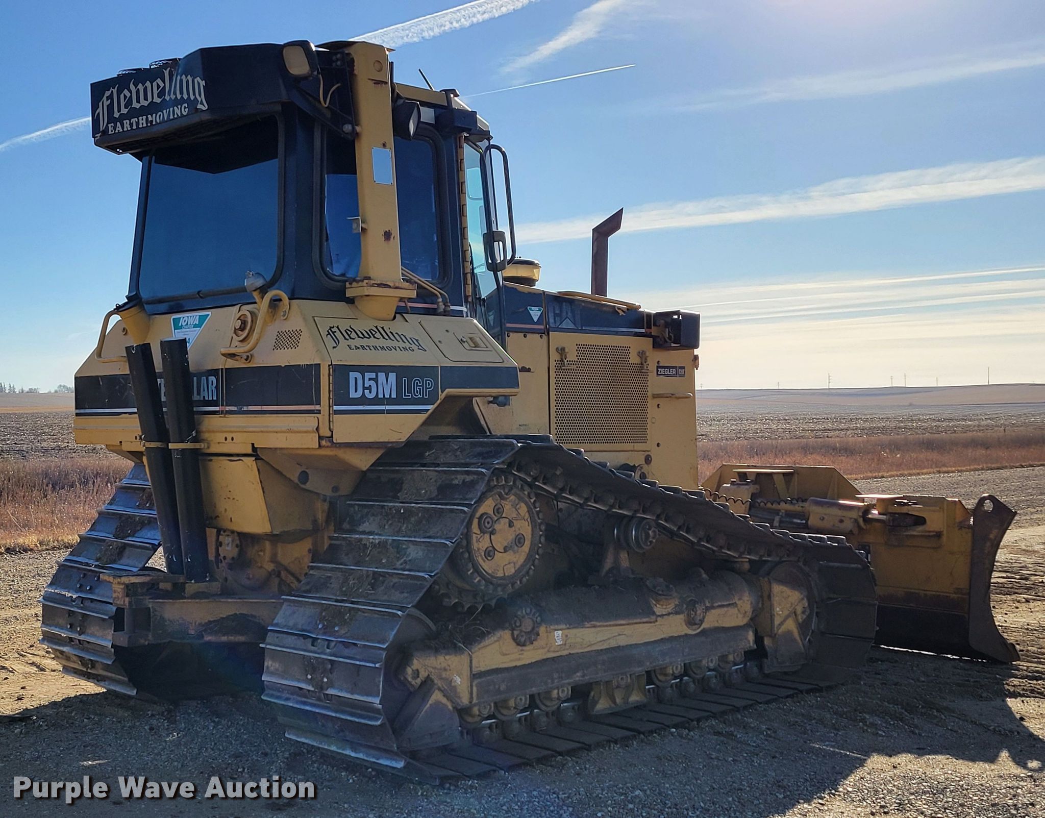 1997 Caterpillar D5M LGP dozer. Hours: 15,282 on meter, Serial: 3CR00417. Engine Cylinders: 6, Fuel type: Diesel. Transmission Powershift, 3F - 3R. Operators station EROPS, AC, Heat, Steering: Fingertip control. Features Rear drawbar, Dozer blade Type: 6-way, Straight, Width: 129" W. Tracks Width: 30", Grouser pads: Single, Bottom rollers: 7. Notes GPS not included, will be removed prior to auction. Flewelling Earth Moving Inc.. 1241 Hancock Avenue. Moville, IA 51039