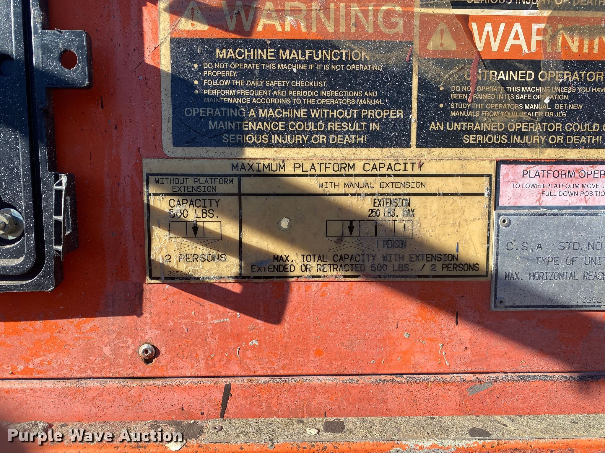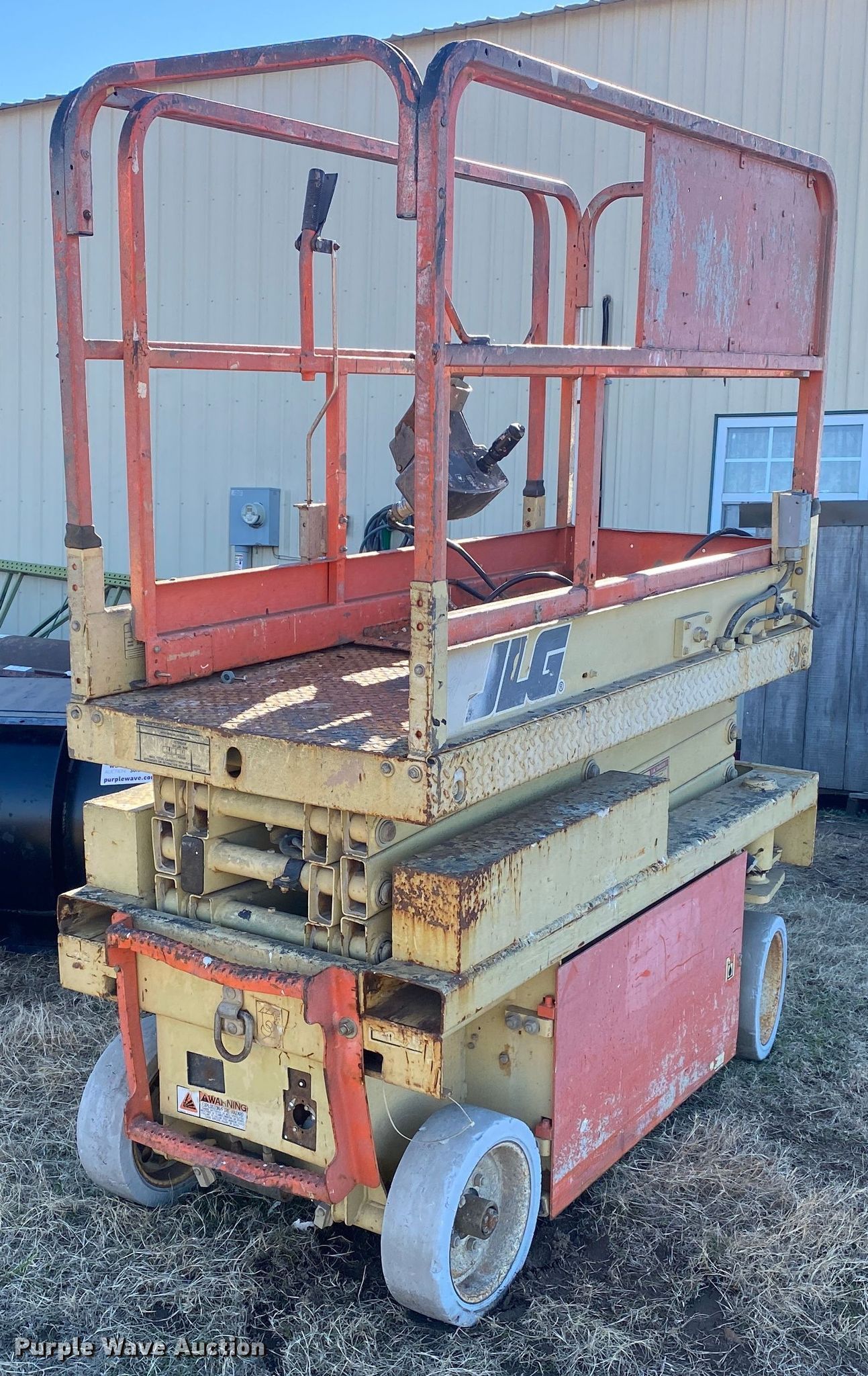 Purple Wave is selling a used Scissor or Vertical Lift in Oklahoma. This item is a JLG scissor lift with the following: Maximum lift capacity: 500 lbs, Controls: Platform, Platform extensions: Manual