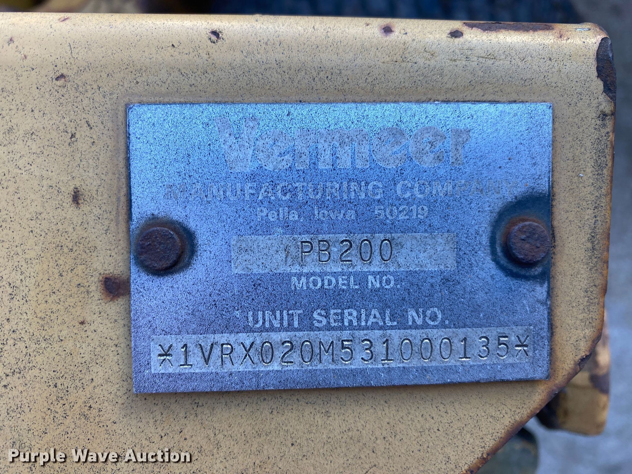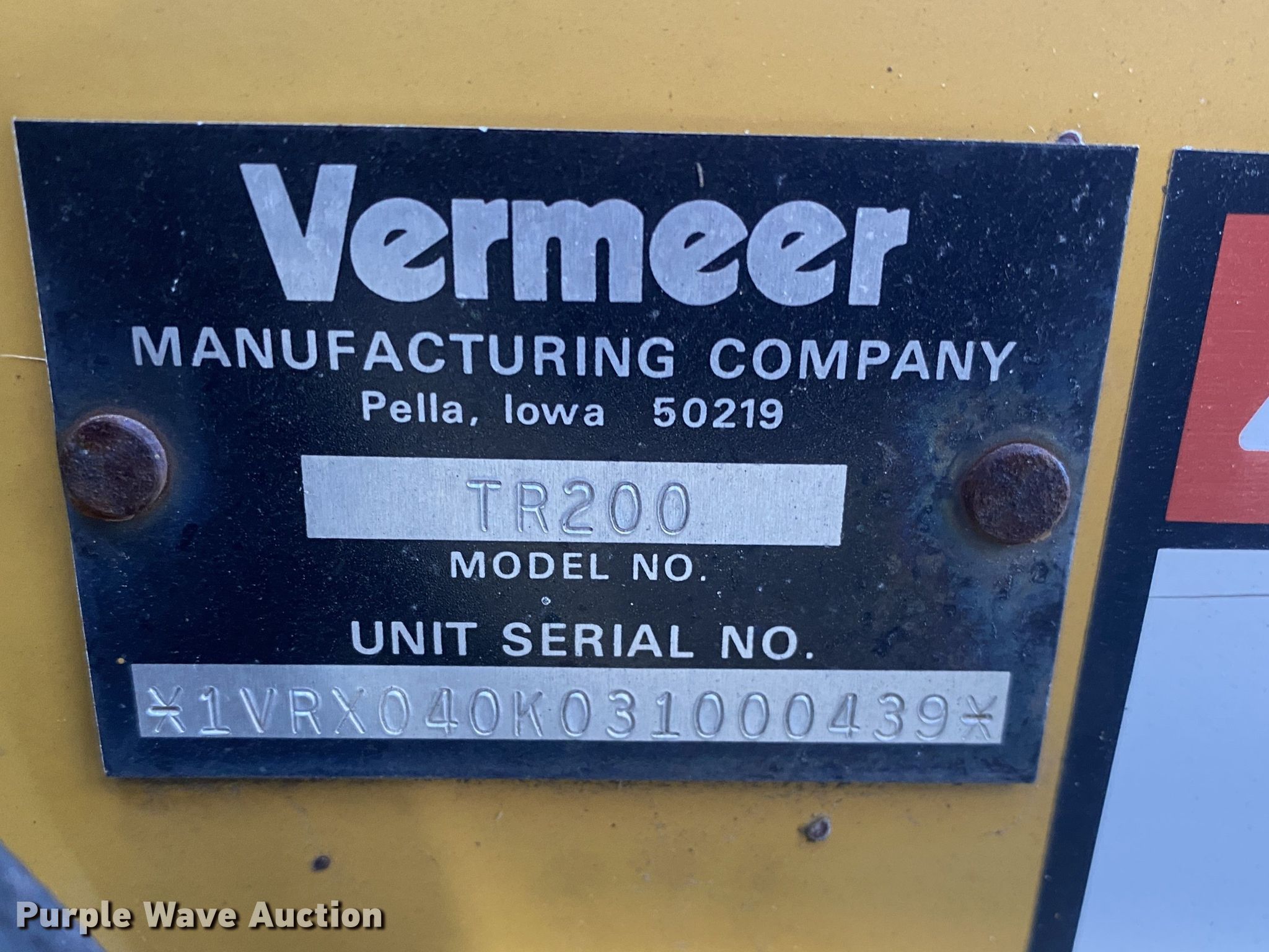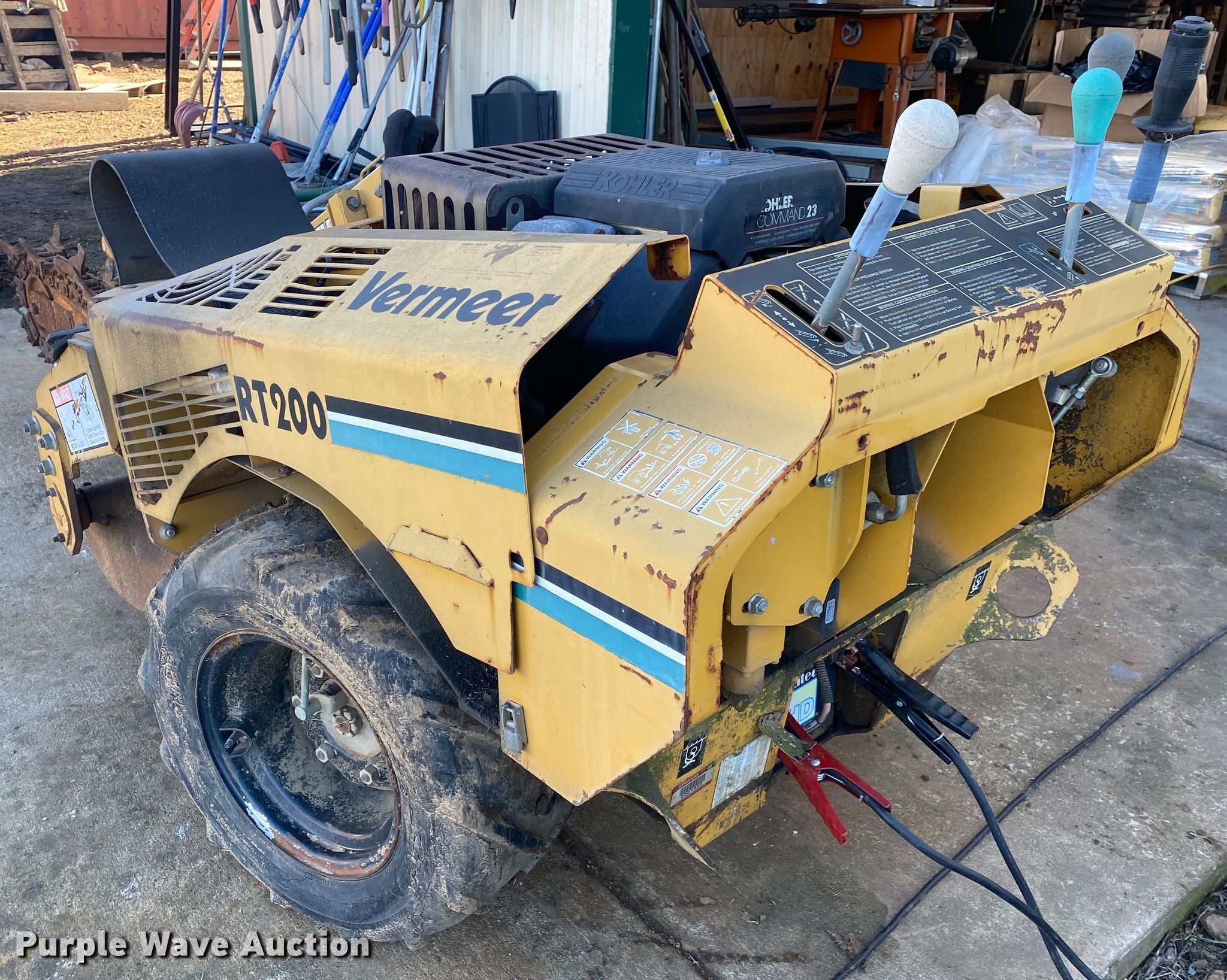 2003 Vermeer RT200 trencher. Hours: 148 on meter, Serial: 1VRX040K031000439. Engine Kohler Command 23, Cylinders: 2, Fuel type: Gas. Transmission Hydrostatic. Features Trencher Model: PB200, Serial: 1VRX020M531000135, Estimated dig depth: 36", Cutting width: 4", Teeth: Rock, Dirt. Tires Size: 23x10.50-12. Notes Dead battery. Carter Douglas Industrial. Beggs, OK 74421
