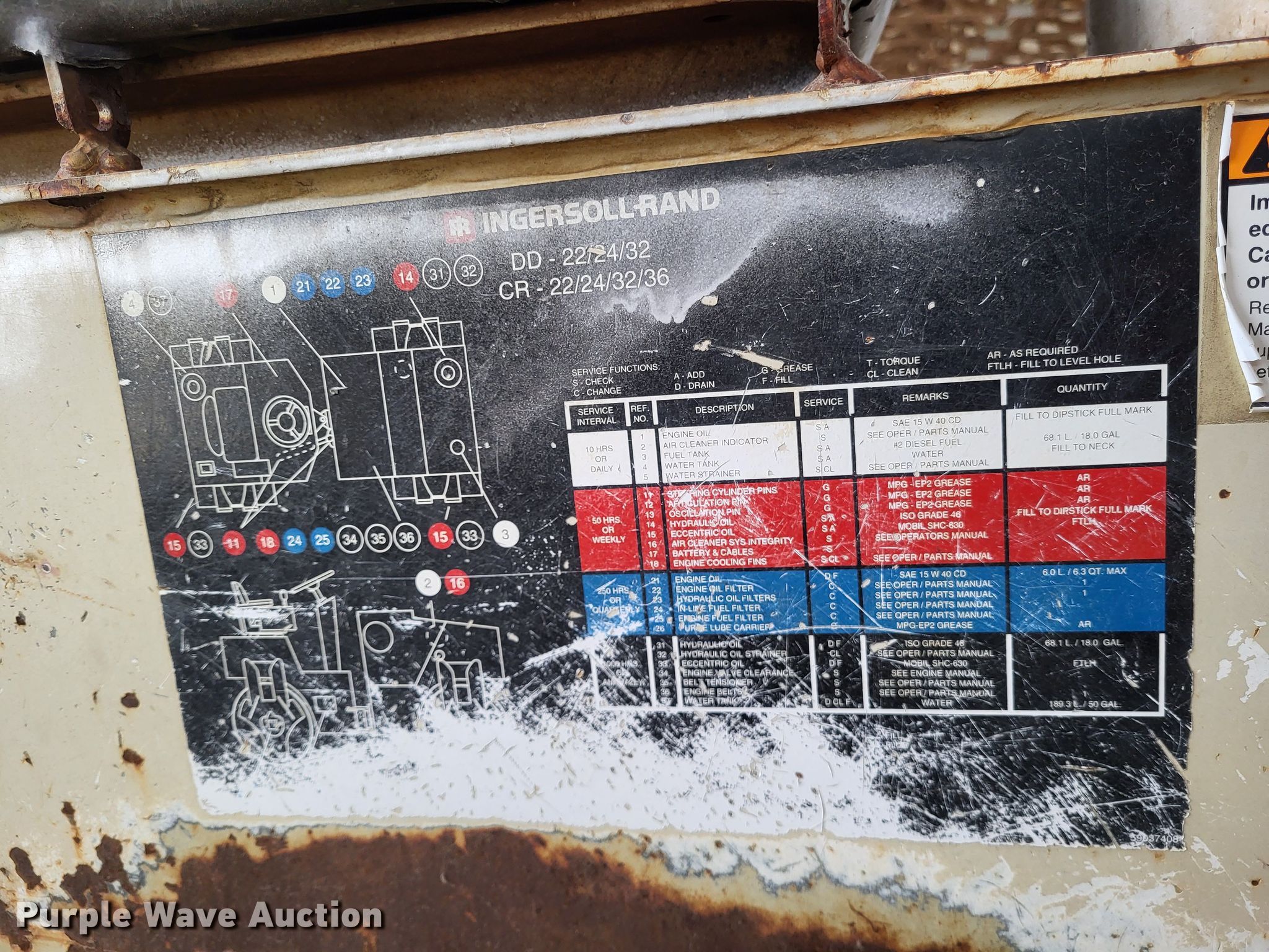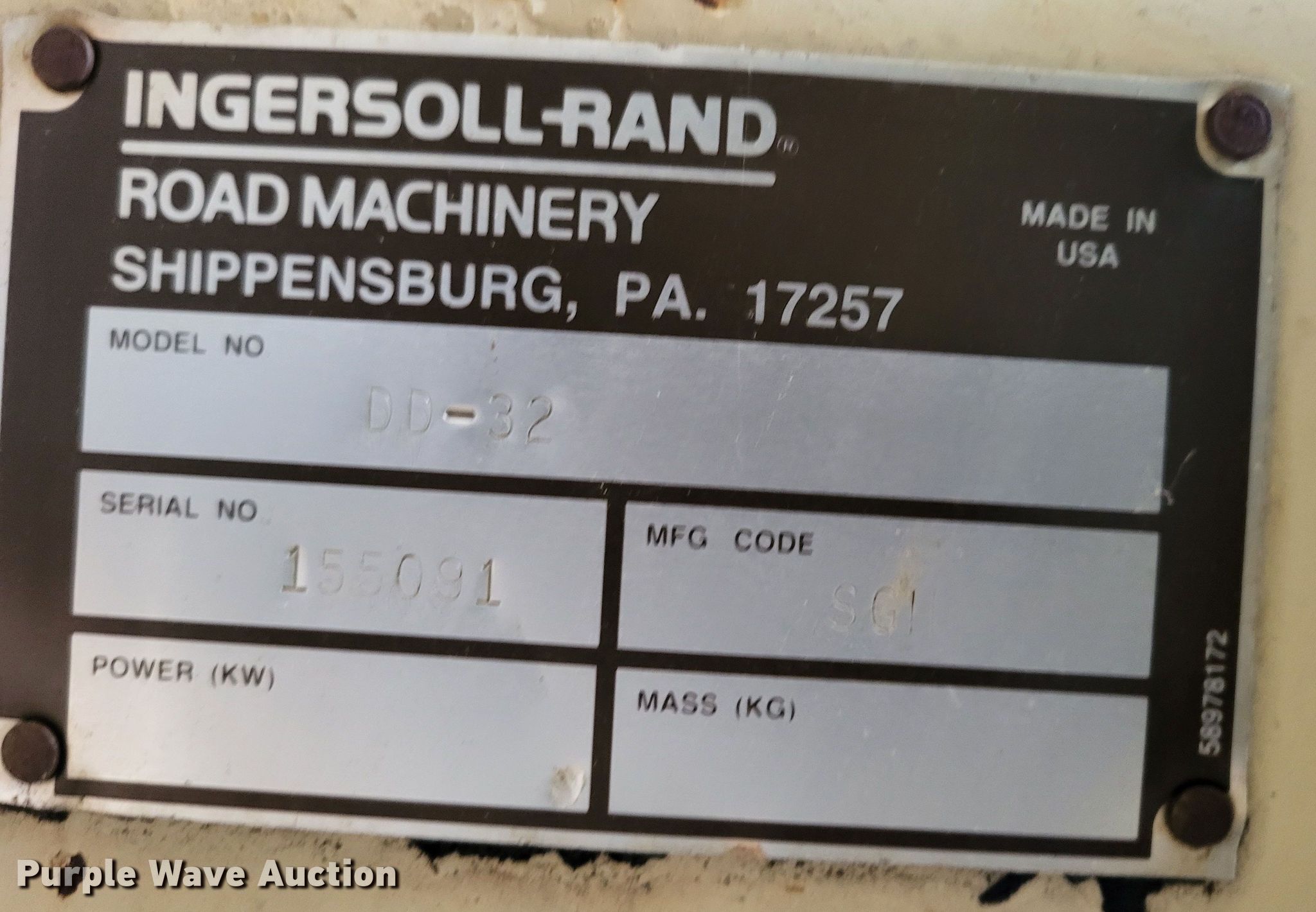 1998 Ingersoll Rand DD32 double drum vibratory roller. Hours: 2,602 on meter, Serial: 155091. Engine Deutz F3L 1011F, Serial: 00300744, Cylinders: 3, Fuel type: Diesel. Transmission Hydrostatic. Features Drum: Smooth, Vibratory system: Double, Front drum Width: 52", Diameter: 29", Rear drum Width: 52", Diameter: 29", Drum scrapers: Front, Rear, Water spray applicator: Front, Rear. Notes Non-operational unit. Duncan's Service. 9204 Missouri 32. Ste. Genevieve, MO 63670