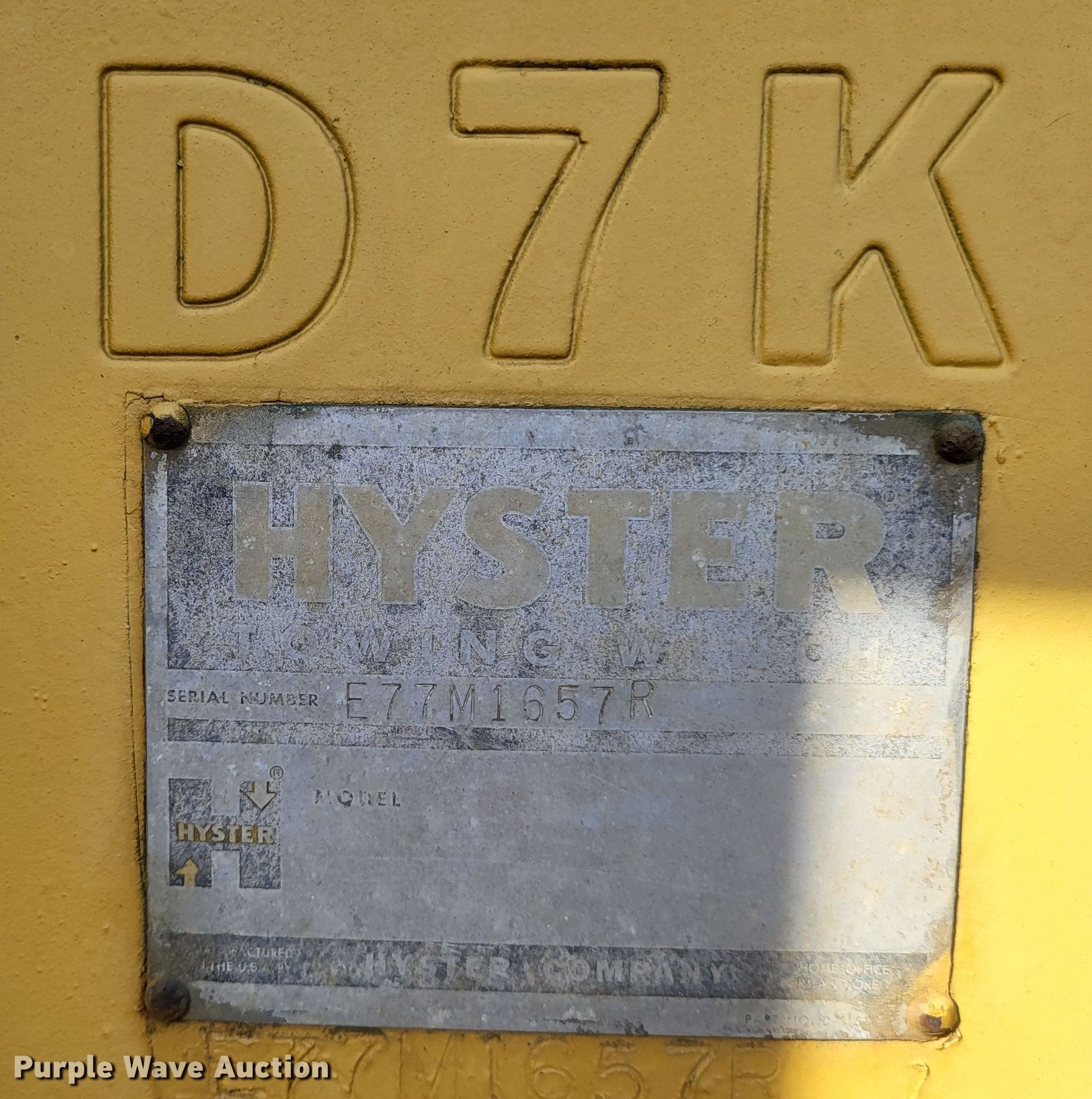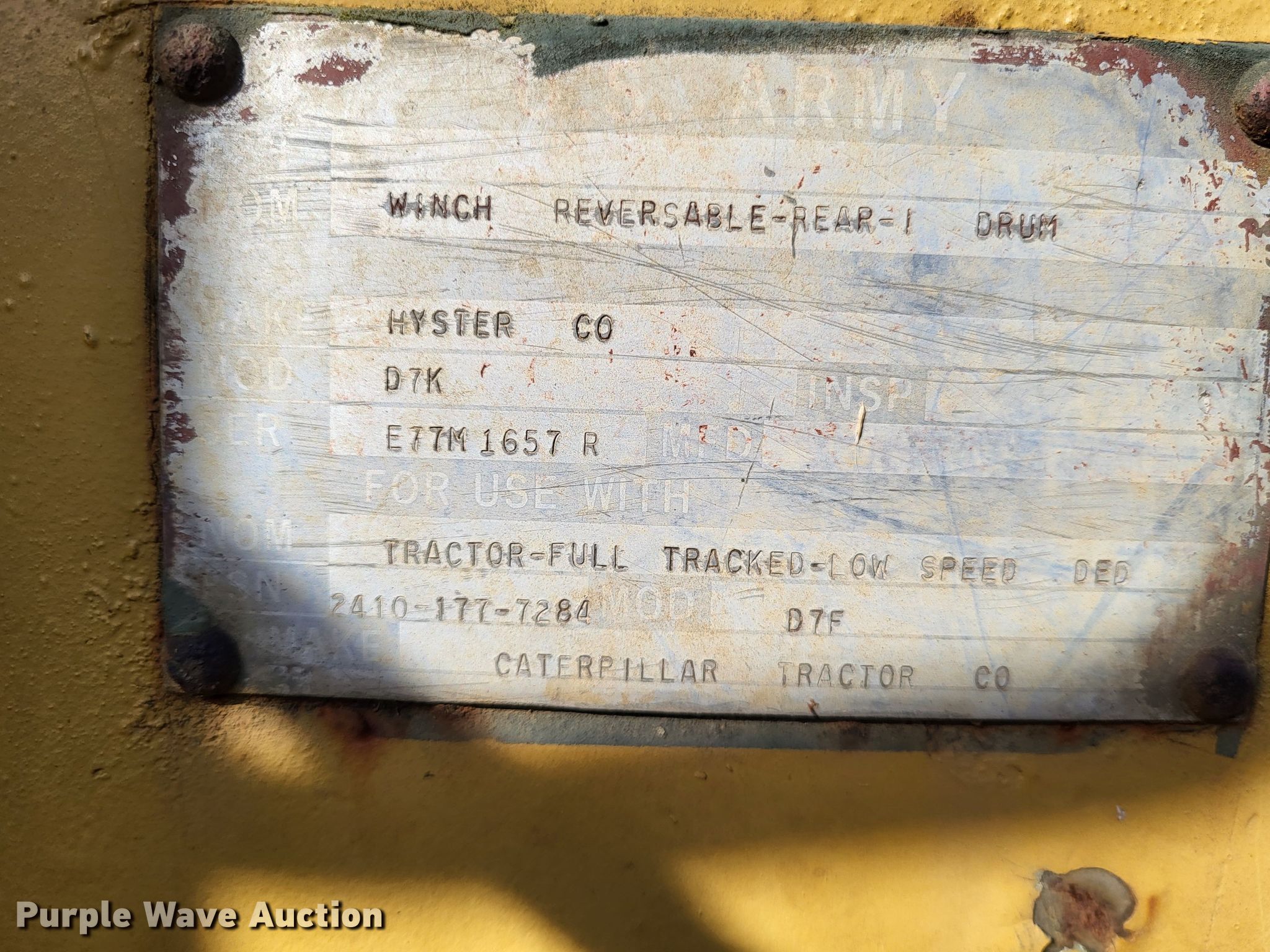 Caterpillar D7F dozer. Hours: 1,257 on meter, Serial: 61G225. Engine Caterpillar, Serial: 61G225, Cylinders: 6, Fuel type: Diesel. Transmission Powershift, 3F - 3R. Operators station Canopy, Steering: Clutch brake. Features Screen guards, Sweeps, Rear drawbar, Dozer blade Type: Semi-U, Single-tilt, Width: 11', Attachments Winch Hyster D7K, Cable: 1", Serial: E77M1657R.. Tracks Width: 22", Grouser pads: Single, Bottom rollers: 6. Little River Drainage District. 1312 County Rd 242. Chaffee, MO 63740
