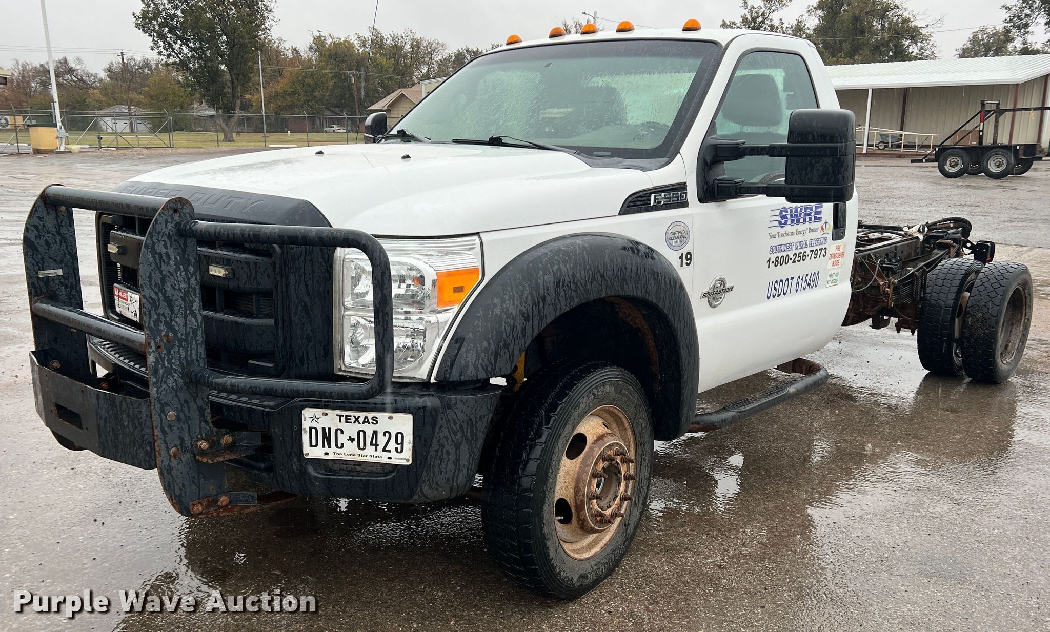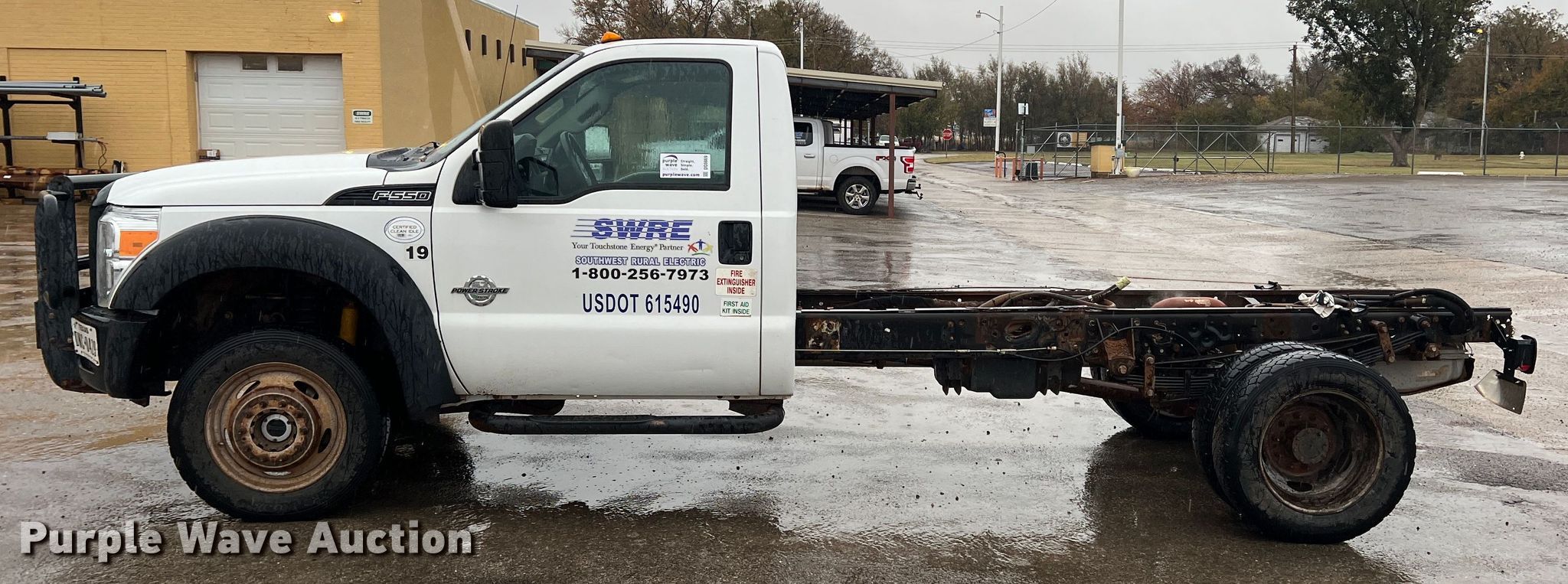 2014 Ford F550 Super Duty truck cab and chassis. Miles: 161,396 on odometer, VIN: 1FDUF5HT8EEB66980. Engine Displacement: 6.7L, Cylinders: 8, Fuel type: Diesel. Transmission Automatic. Chassis Four wheel drive, Axles: Single, Suspension: Spring, Brakes: Hydraulic, PTO. Interior AC, Heat. Tires Size: 225/70R19.5. Notes EGR deleted, Dash warning indicator: Check engine, Air bag, Windshield chipped or cracked. Texas title. Title distribution may be delayed up to 14 days from verification of funds. Southwest Rural Electric Association, Inc.. 700 N Broadway Ave. Tipton, OK 73570