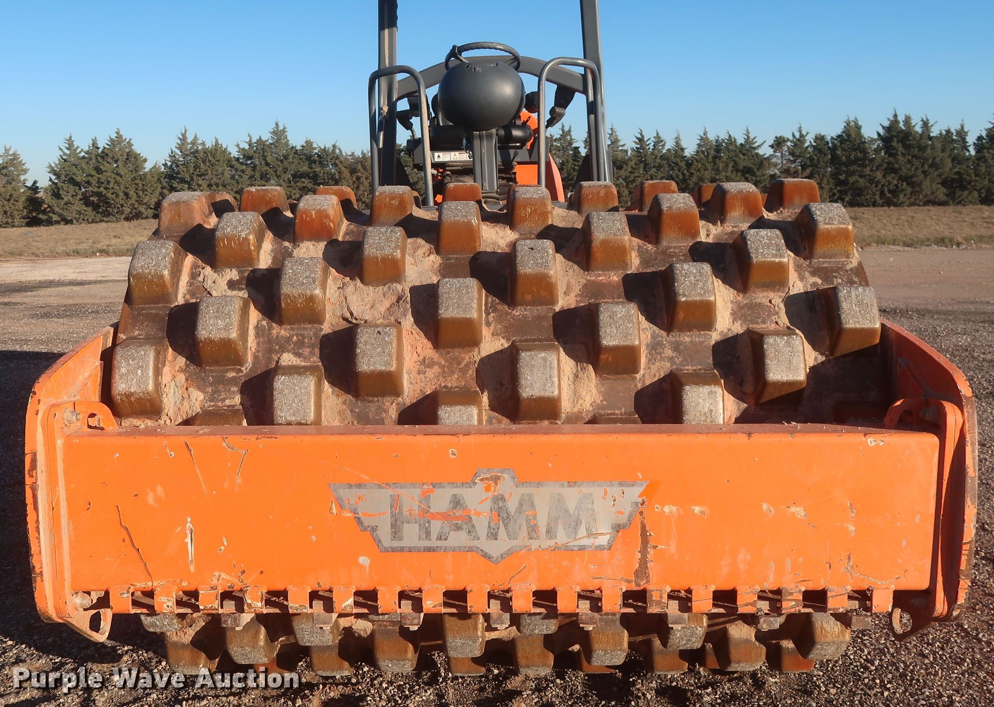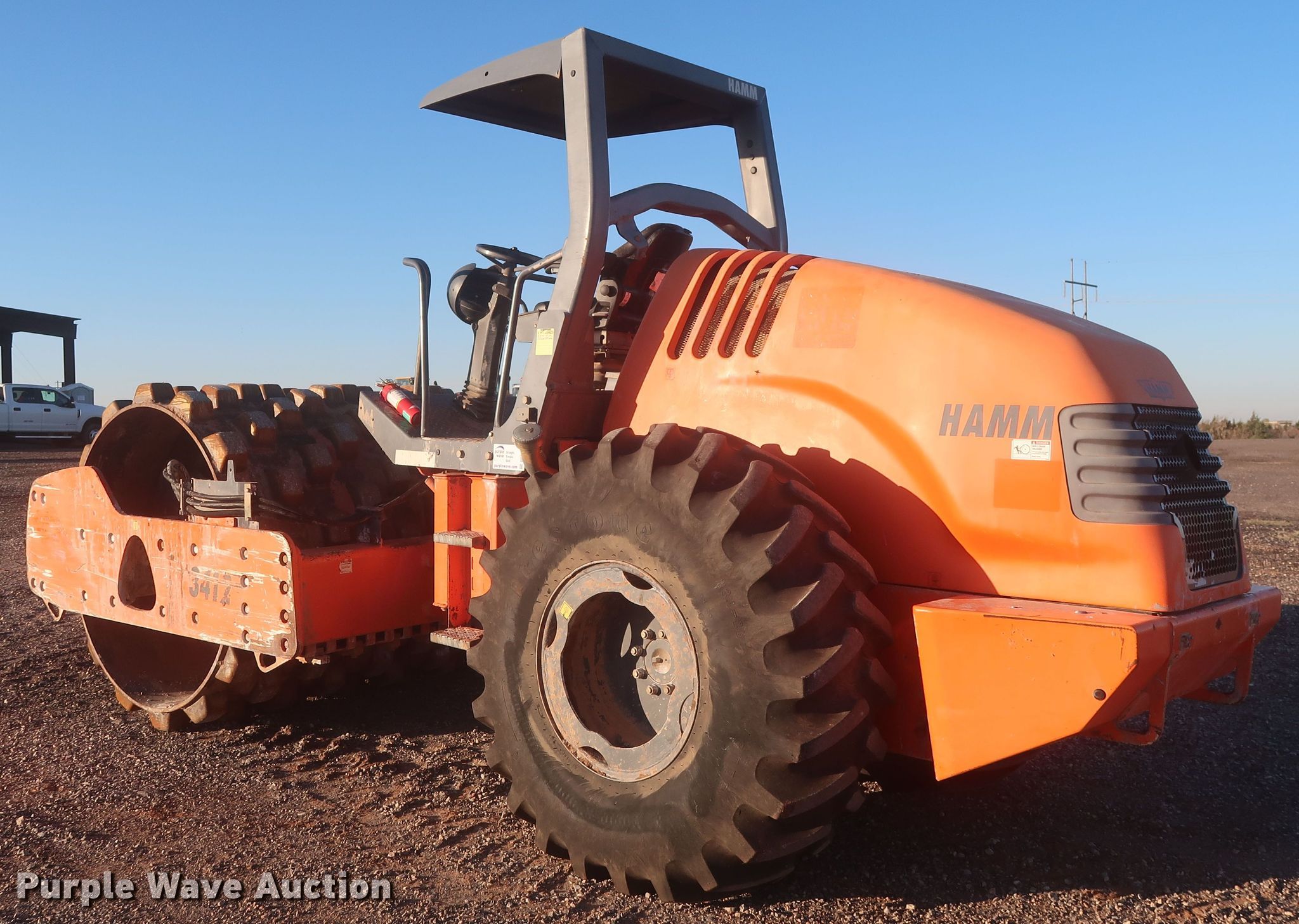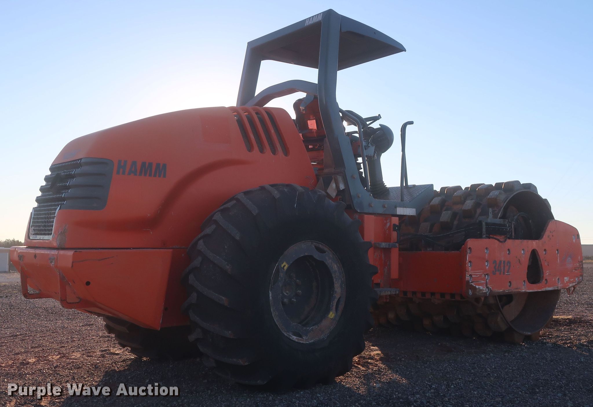2009 Hamm 3412P single drum vibratory roller. Hours: 5,407 on meter, Serial: H1802509, Unit #: 317.301. Engine Deutz TCD 2012 L04 2V, Displacement: 4.038L, Cylinders: 6, Fuel type: Diesel. Transmission Hydrostatic. Operators station OROPS. Features Drum: Padfoot, Vibratory system: Single, Front drum Width: 86", Diameter: 66", Drum scrapers: Front, Rear. Tires Size: 23.1-26. Duit Holdings, Inc. - Open Inspection Dec. 28. 7183 E Waterloo Industrial Road. Edmond, OK 73034