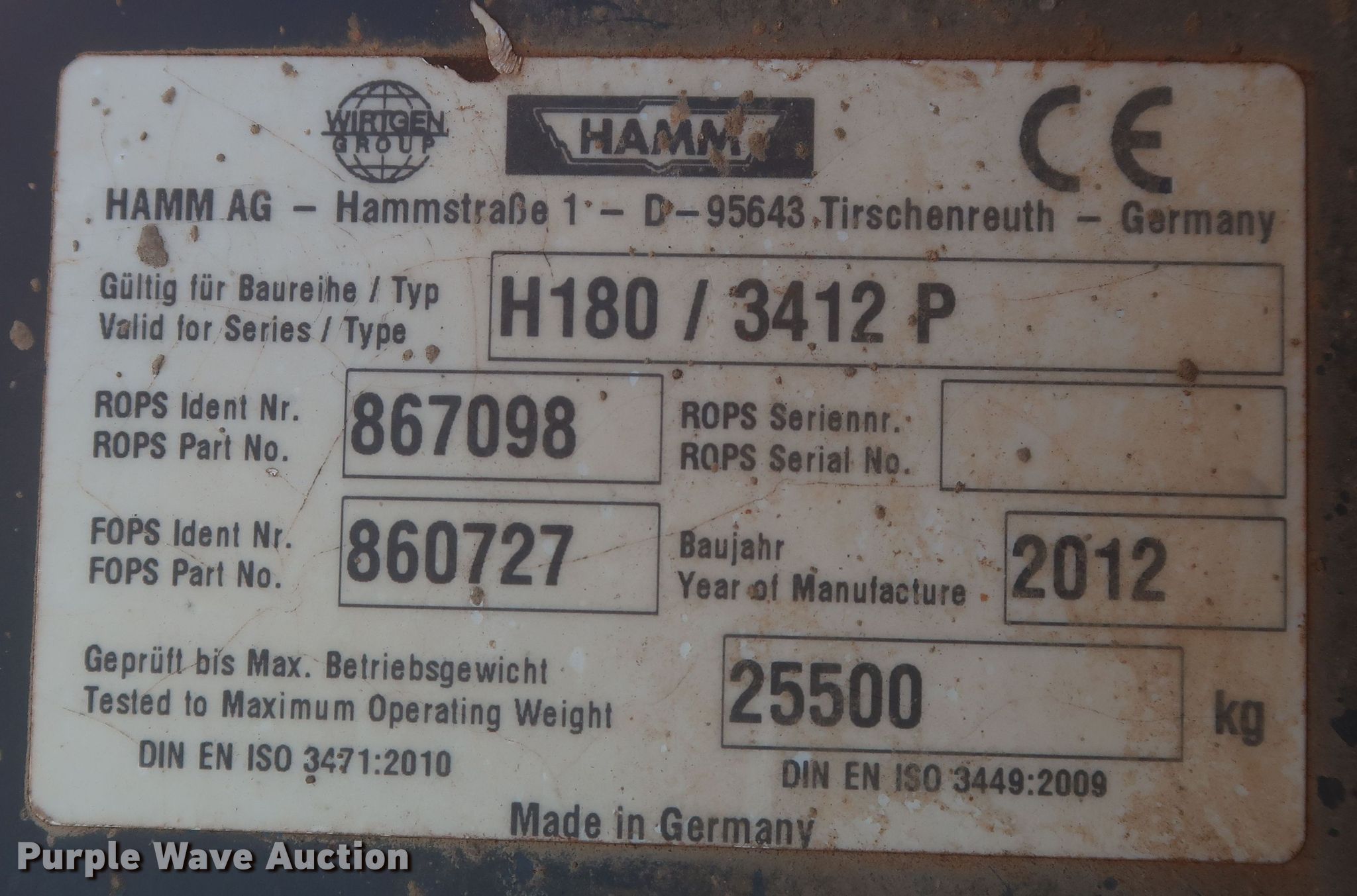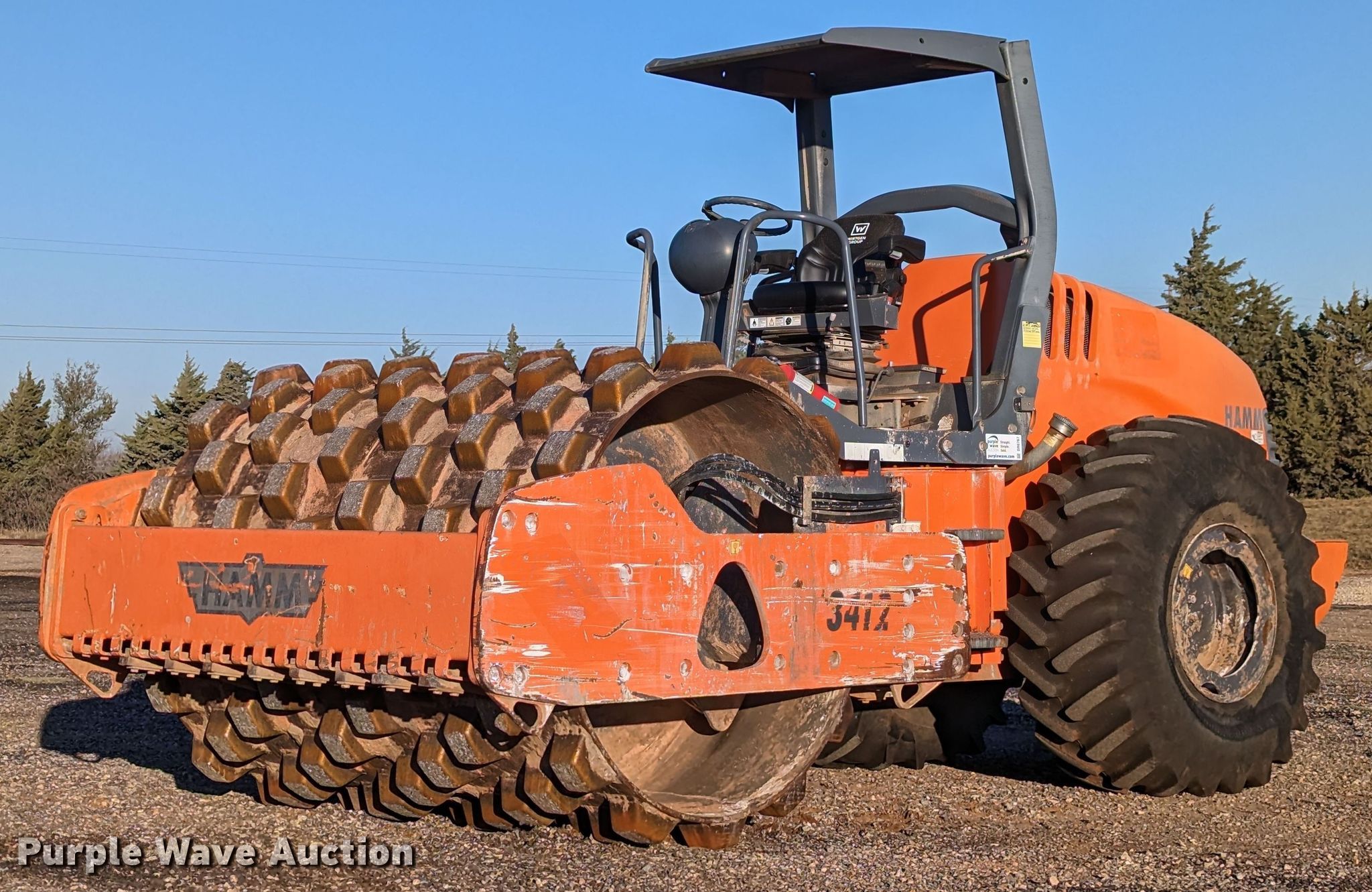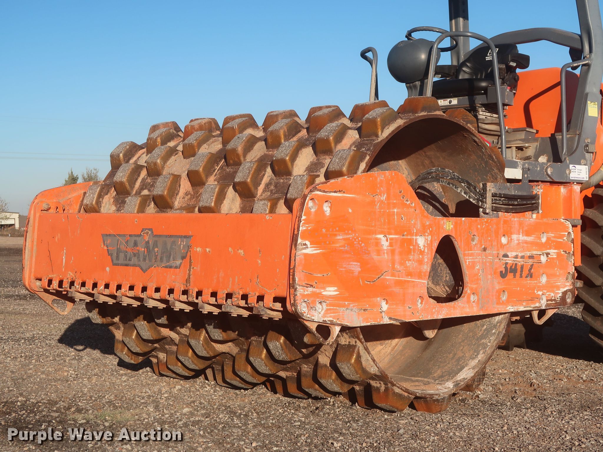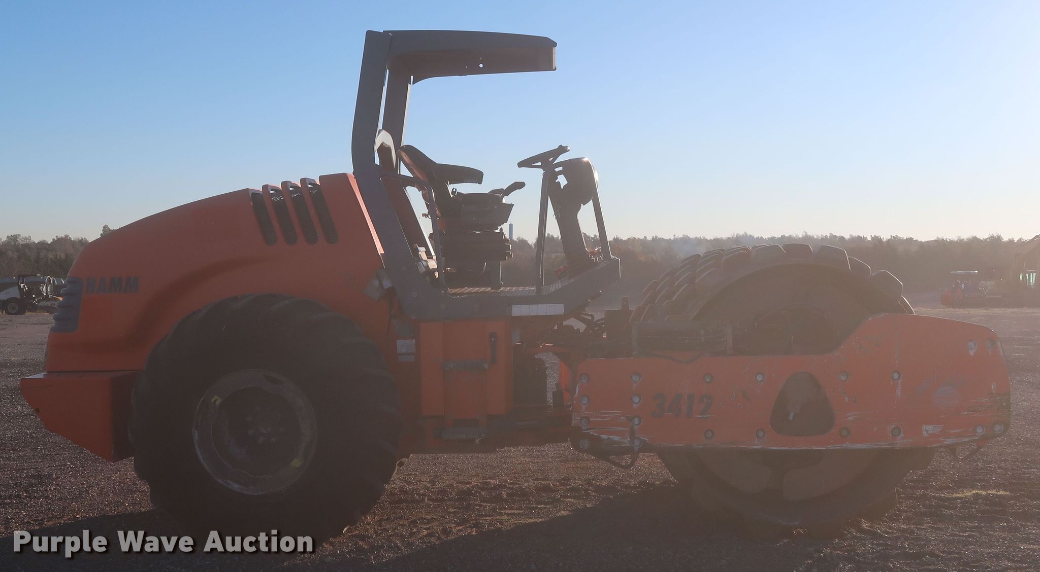 2009 Hamm 3412P single drum vibratory roller. Hours: 5,407 on meter, Serial: H1802509, Unit #: 317.301. Engine Deutz TCD 2012 L04 2V, Displacement: 4.038L, Cylinders: 6, Fuel type: Diesel. Transmission Hydrostatic. Operators station OROPS. Features Drum: Padfoot, Vibratory system: Single, Front drum Width: 86", Diameter: 66", Drum scrapers: Front, Rear. Tires Size: 23.1-26. Duit Holdings, Inc. - Open Inspection Dec. 28. 7183 E Waterloo Industrial Road. Edmond, OK 73034