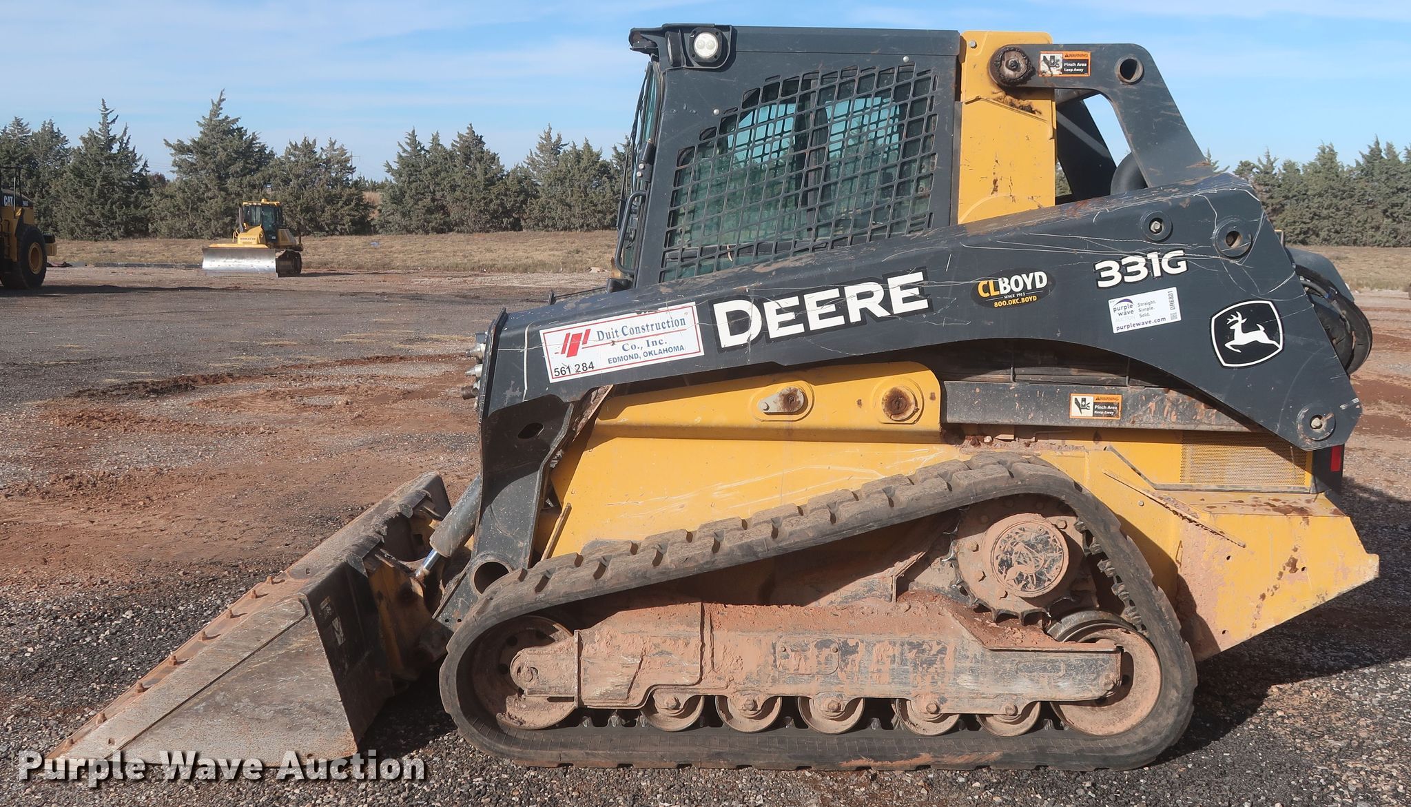 2019 John Deere 331G tracked skid steer loader. Hours: 2,973 on meter, Serial: 1T0331GMHKF358158, Unit #: 561.284. Engine Yanmar 4TNV94FHT, Displacement: 3.1L, Cylinders: 4, Fuel type: Diesel, HP: 90. Transmission Hydrostatic, Two speed travel. Operators station EROPS, AC, Heat, Bucket control: Hand, Electronic Monitoring System panel. Features Auxiliary hydraulics, Auxiliary electrical outlet, Quick coupler: Hydraulic, Bucket John Deere Worksite Pro C84, Width: 84", Cutting edge: Bolt-on. Tracks Width: 17.7". Duit Holdings, Inc. - Open Inspection Dec. 28. 7183 E Waterloo Industrial Road. Edmond, OK 73034