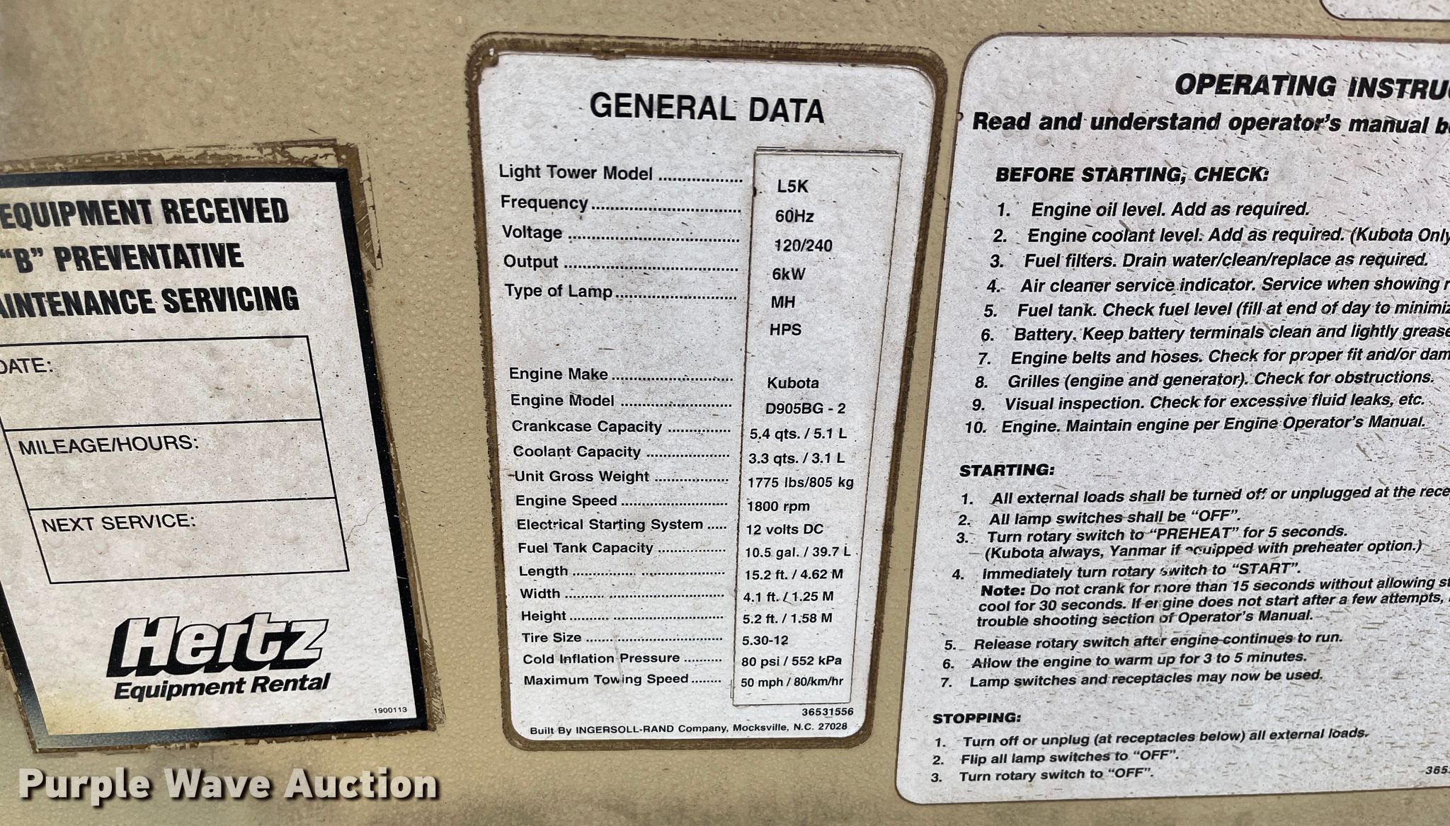 Purple Wave is selling a used Light Plant in Kansas. This item is a Ingersoll Rand light plant with the following: Hours: 4,174 on meter, Serial: 36531556