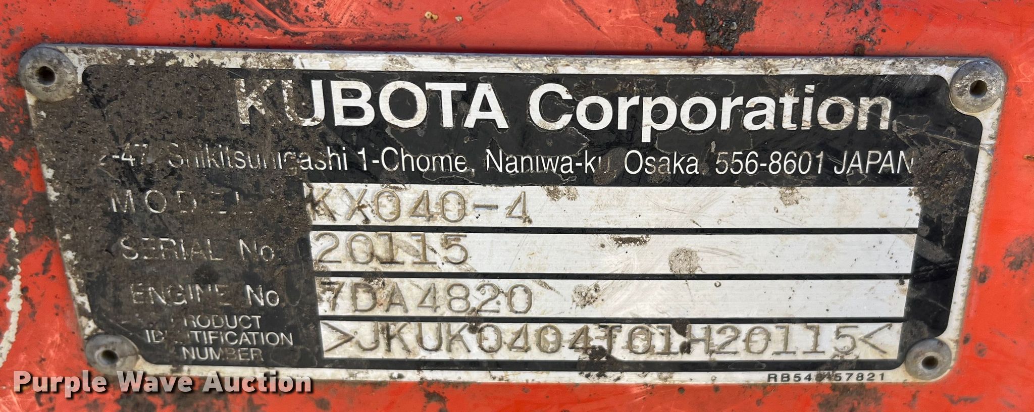 Purple Wave is selling a used Mini Excavator in Kansas. This item is a 2013 Kubota KX040-4 mini excavator with the following: Hours: 3,553 on meter, Serial: 20115