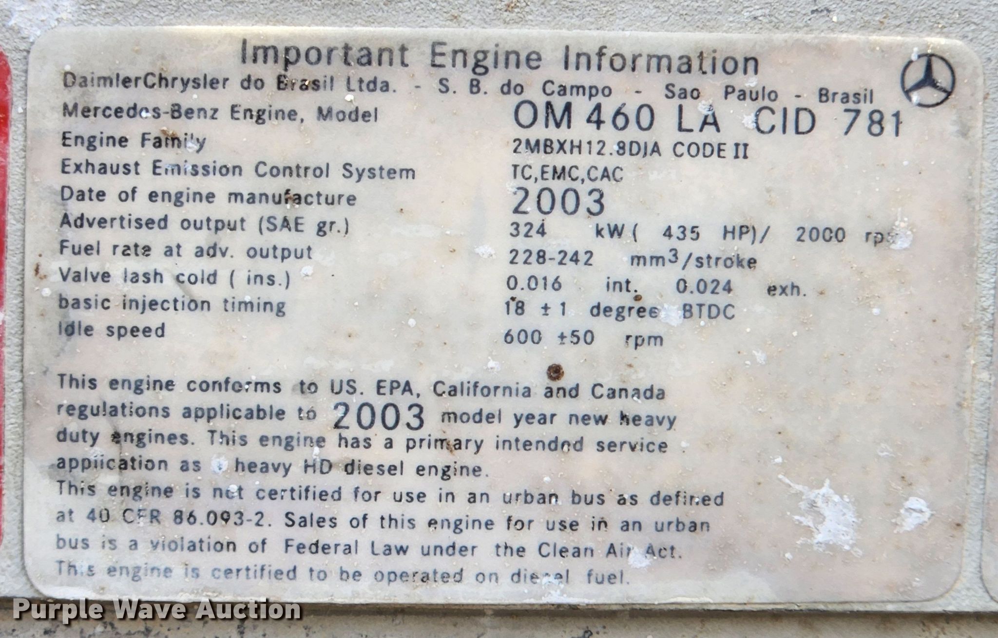 2004 Western Star 4900FA dump truck. Miles: 721,942 on odometer, Hours: 31,252 on meter, Actual miles and hours unknown, VIN: 5KKHAECV64PM47142. Engine Mercedes-Benz OM460 LA, Displacement: 12.8L, Cylinders: 6, Fuel type: Diesel. Transmission Eaton Fuller, Manual, Speed: 10. Chassis Axles: Tandem, Axles: 4, Pusher axle, Differential lock: Full, Suspension: Spring over walking beam, Brakes: Air, PTO. Interior AC, Heat, Cruise control. Features Dump bed 17' L x 96' W, Side height: 4", Side board height: 14", Bed type: Steel, Roll tarp, Ram: Single , End gate: Air operated. Tires Front: 385/65R22.5, Rear: 11R22.5, Lift axle: 295/75R22.5. Notes Windshield chipped or cracked, ECM has been replaced. Missouri title. Title distribution may be delayed up to 14 days from verification of funds. Eveland Excavating and Hauling. Hawk Point, MO 63349