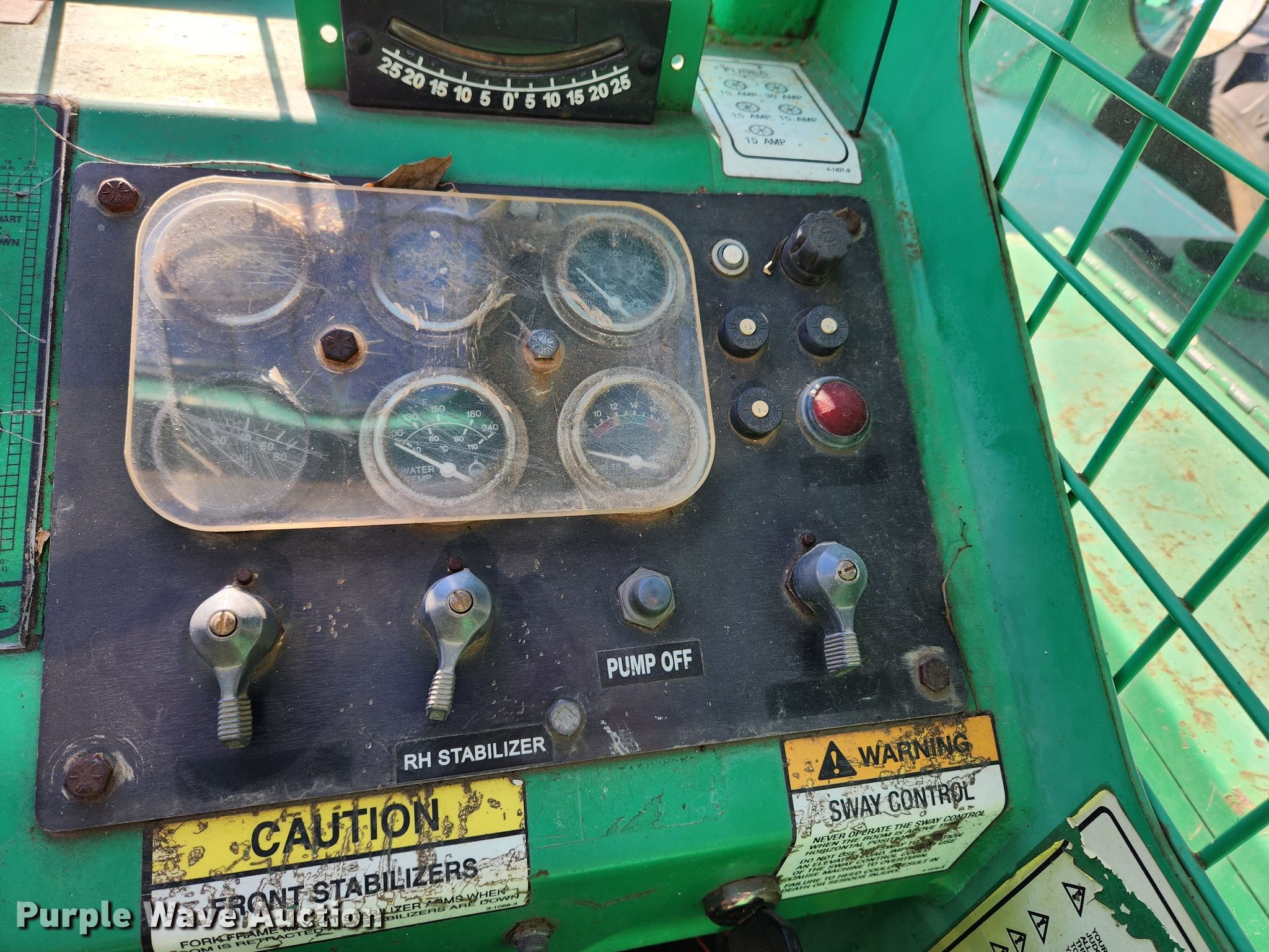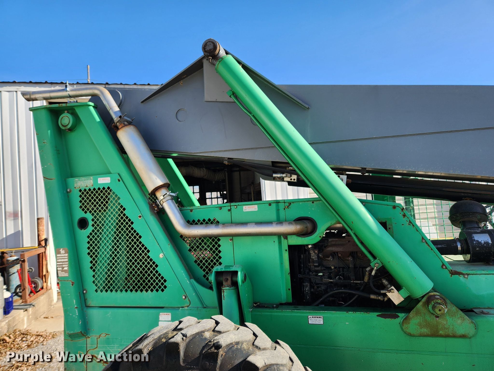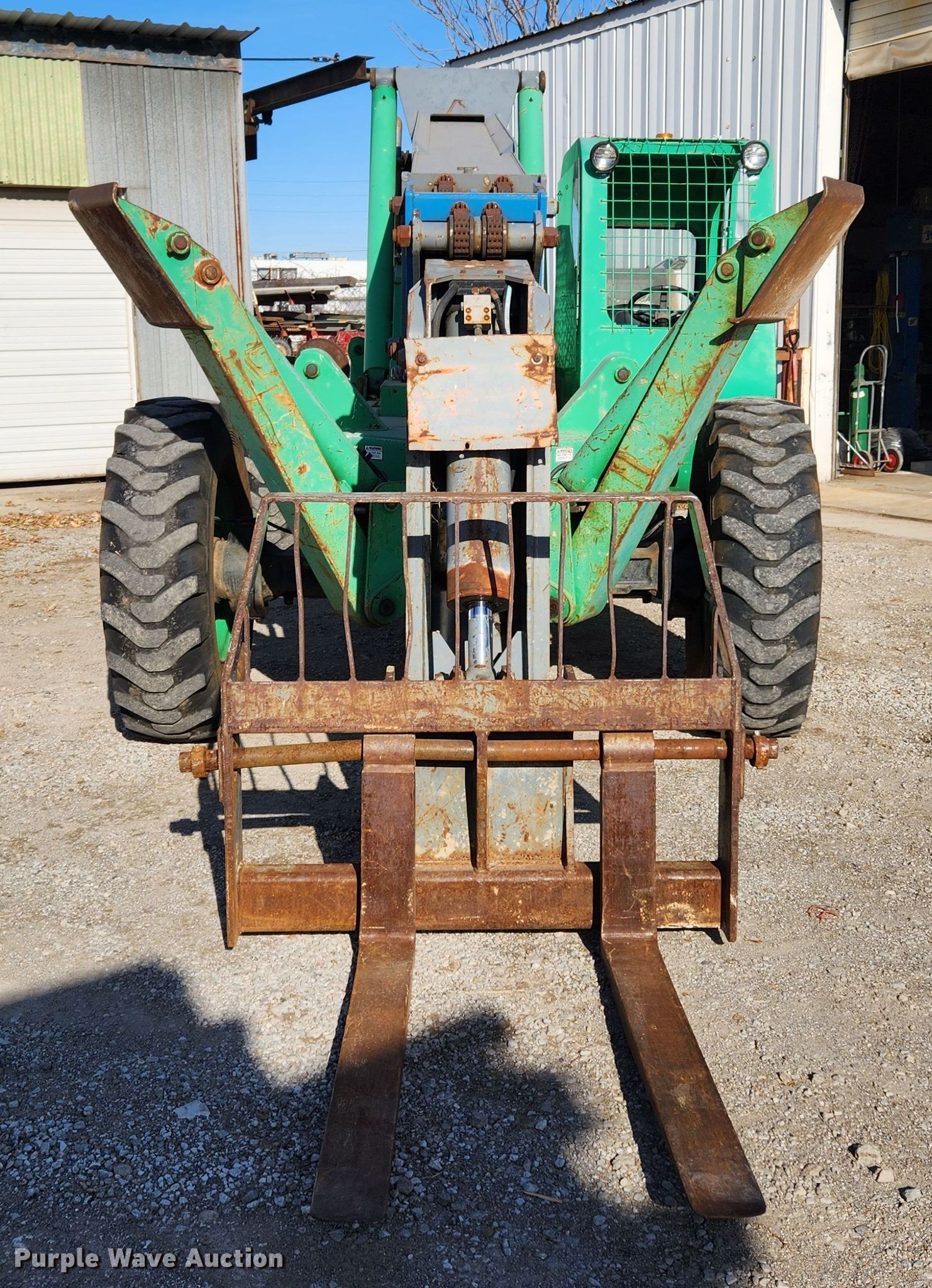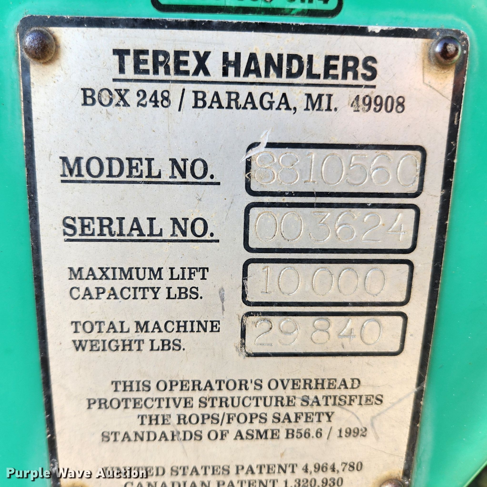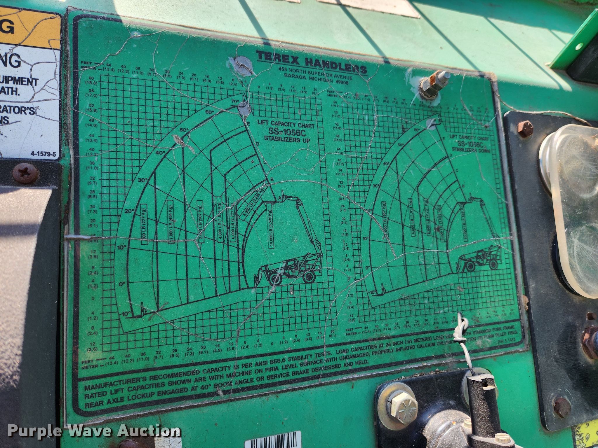 2000 Terex SS1056C Turbo telehandler. Hours: 1,241 on meter, Serial: 003624. Engine John Deere 4045TF250A, Displacement: 4.5L, Cylinders: 4, Fuel type: Diesel, HP: 125. Transmission Powershift, 3F - 3R, Four wheel drive. Operators station Canopy, Steering: Crab, Four wheel. Features Maximum lift capacity: 10,000 lbs, Maximum lift height: 56', Boom stages: 4, Fork length: 48", Hydraulic outriggers, Hydraulic leveling. Tires Size: 14.00-24, Foam filled. S.M. Wilson & Co.. Granite City, IL 62040