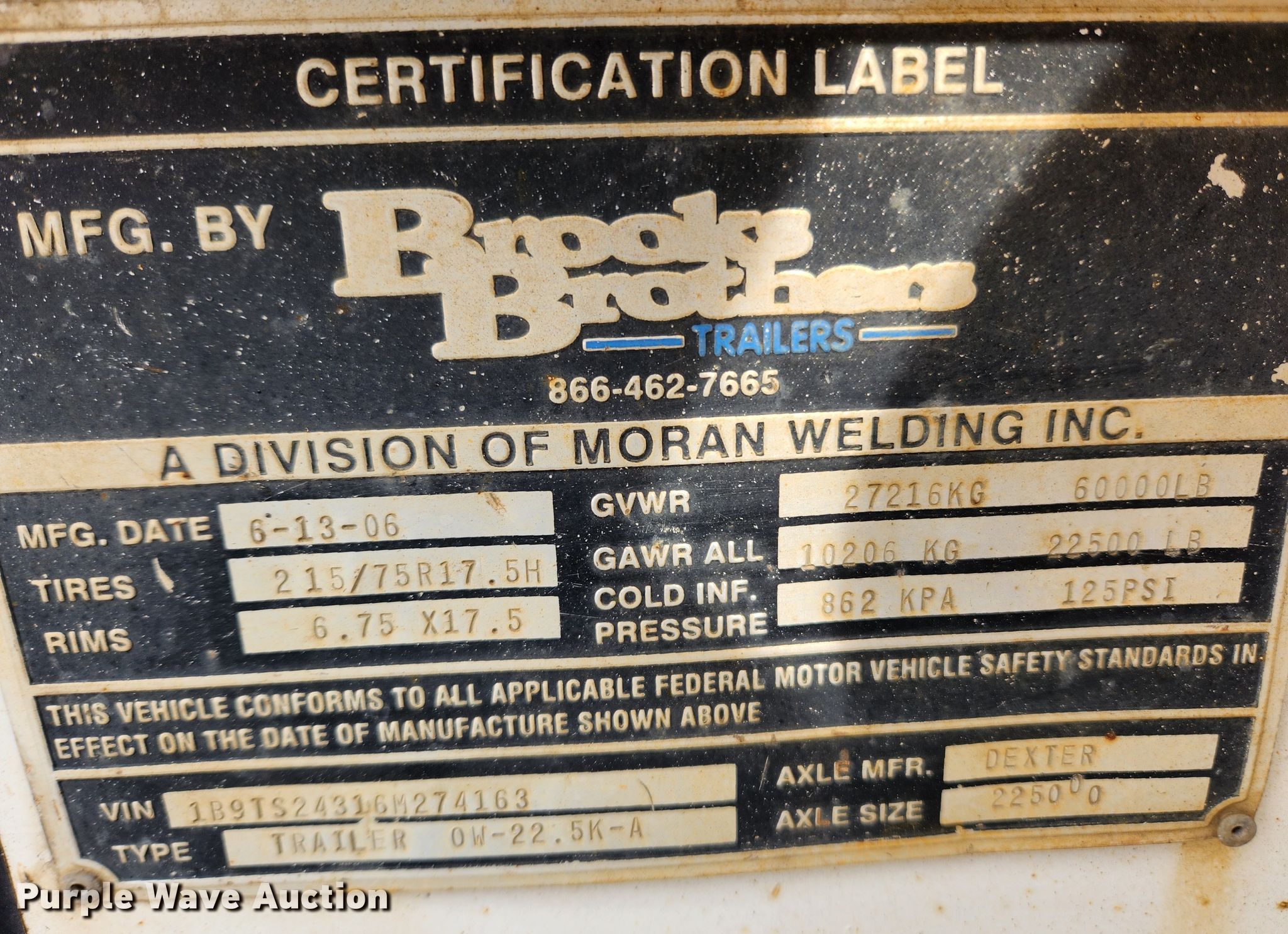 Purple Wave is selling a used Equip. Trailer in Missouri. This item is a 2006 Brooks Brothers OW-22.5K-A equipment trailer with the following: VIN: 1B9TS24316M274163
