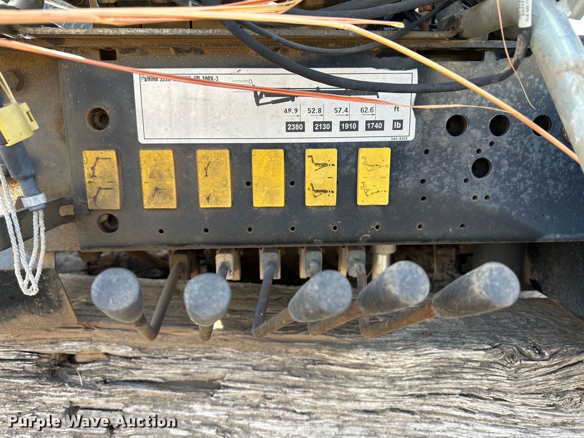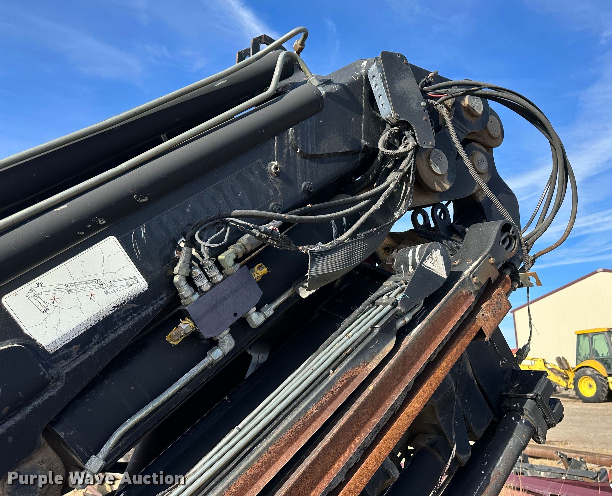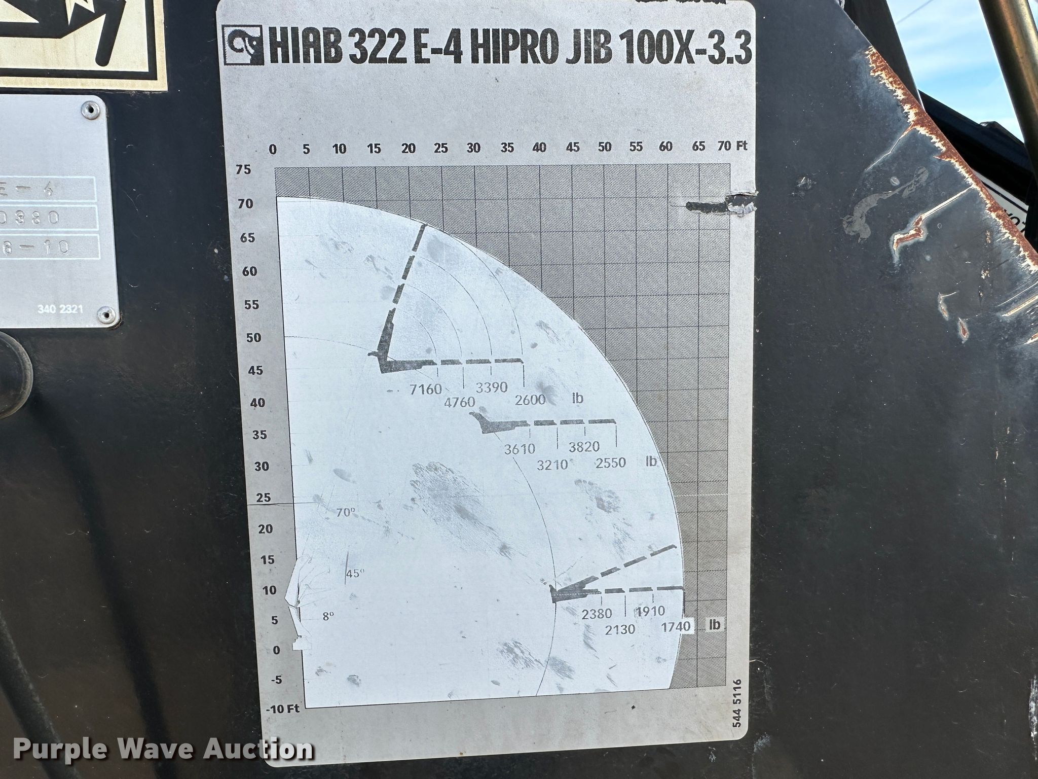Hiab HB100X crane. Serial: 3220380. Features Boom Telescopic, Knuckle, Maximum lift capacity: 7,160 lbs, Maximum lift height: 70', Boom controls Ground, Lift chart. Notes Fire damage, Non-operational unit. 11457 R Rd.. Ness City, KS 67560