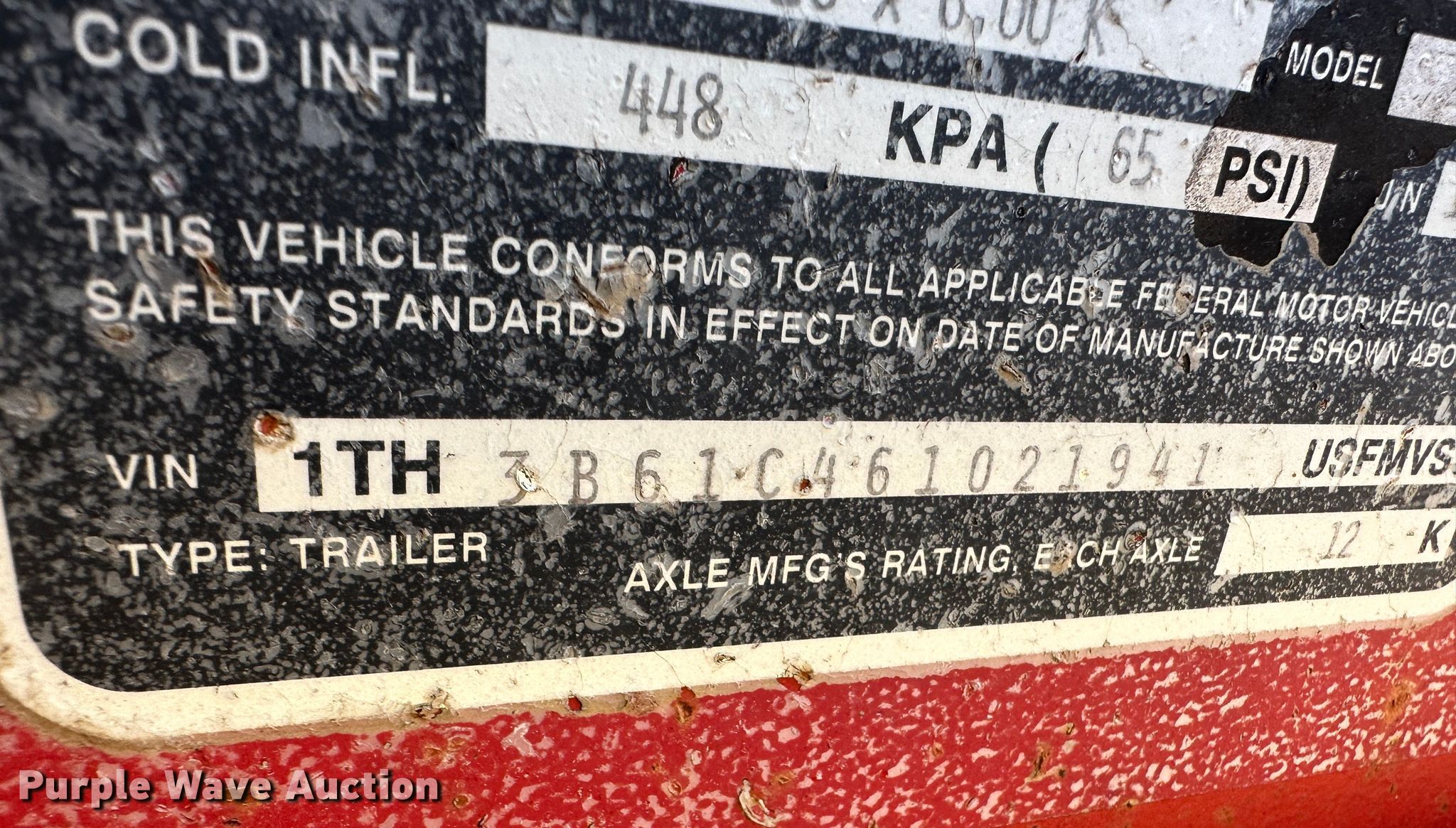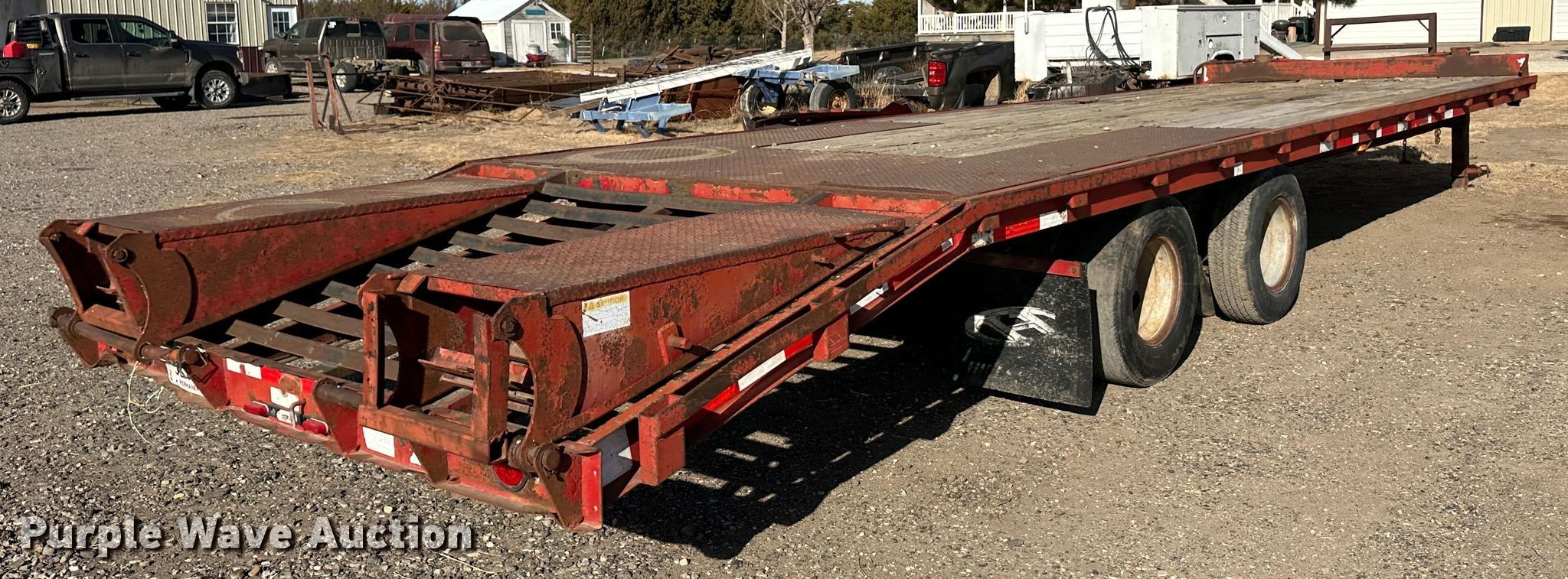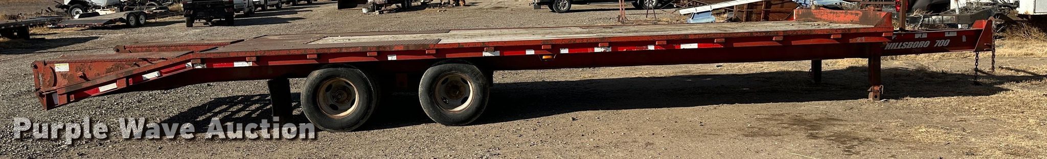 2006 Hillsboro equipment trailer. VIN: 1TH3B61C461021941. Dimensions Overall: 38' L x 100" W, Deck: 24' L x 96" W, Deck height: 35", Tail length: 5', Ramps: Manual Length: 4' 6". Features Deck type: Steel, Wood. Chassis Hitch: Pintle, Landing gear: Dual, Suspension: Walking beam, Axles: Tandem, GVWR: 25,650 lbs, GAWR: 11,110 lbs. Tires Steel wheels, Size: ST235/85R16. Kansas title. Title distribution may be delayed up to 14 days from verification of funds. 11457 R Rd.. Ness City, KS 67560