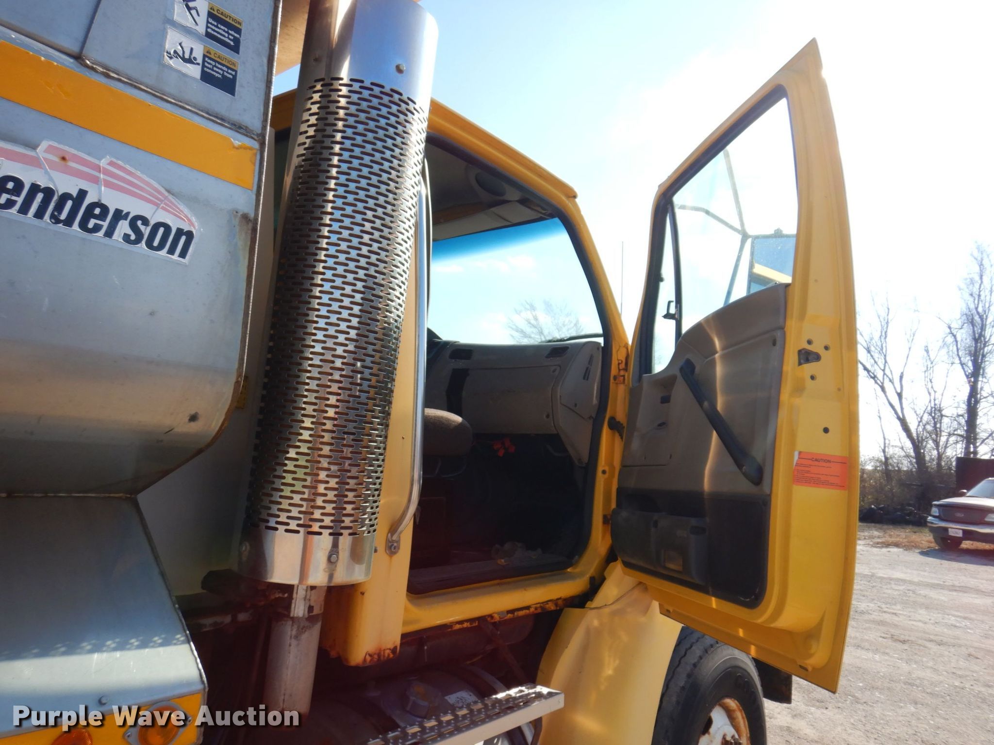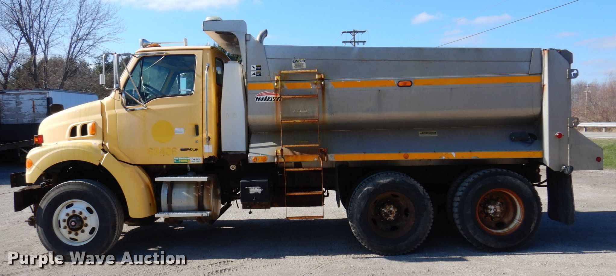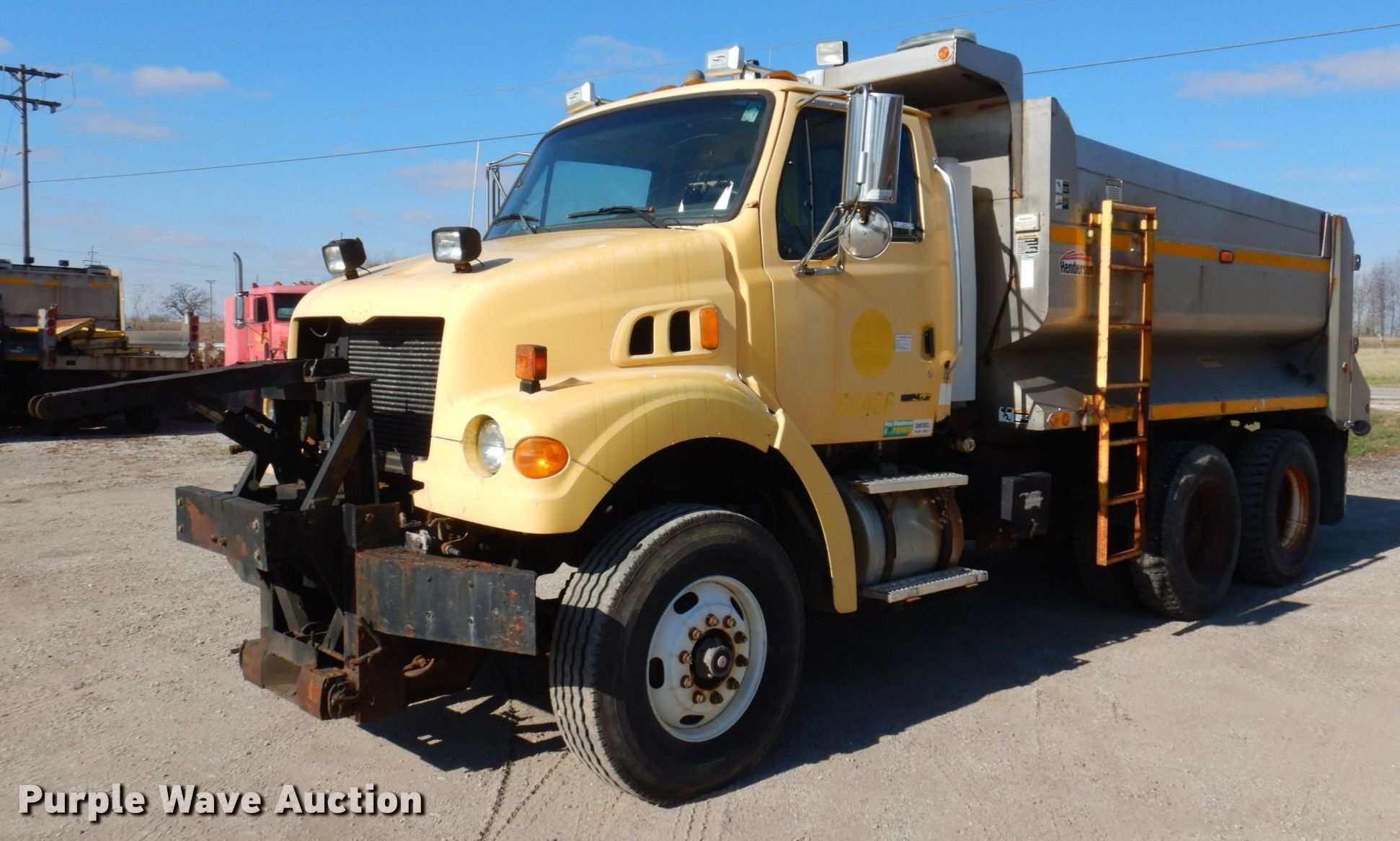 2004 Sterling L-Line dump truck. Miles: 127,880 on odometer, Hours: 8,412 on meter, VIN: 2FZHATAK24AM20387. Engine Caterpillar 3126, Displacement: 7.2L, Cylinders: 6, Fuel type: Diesel. Transmission Automatic. Chassis Axles: Tandem, Differential lock: Inter-axle, Suspension: Spring over walking beam, Brakes: Air, PTO, Front mount PTO, GVWR: 52,000 lbs FAWR: 18,000 lbs, IAWR: 17,000 lbs, RAWR: 17,000 lbs. Interior AC, Heat, Heated mirrors, Power windows, Cruise control. Features Dump bed Henderson 13X36XRDOX304SS, 13' L x 100" W, Side height: 40", Side board height: 16", Bed type: Steel, Ram: Single , End gate: Air operated, Conveyor Width: 22".. Tires Front: 315/80R22.5, Rear: 11R22.5. Notes Passenger side duals missing, Unknown operating condition of conveyor chain , Dash warning indicator: ABS. Illinois title. 1458 W Birchwood St. Morton, IL 61550