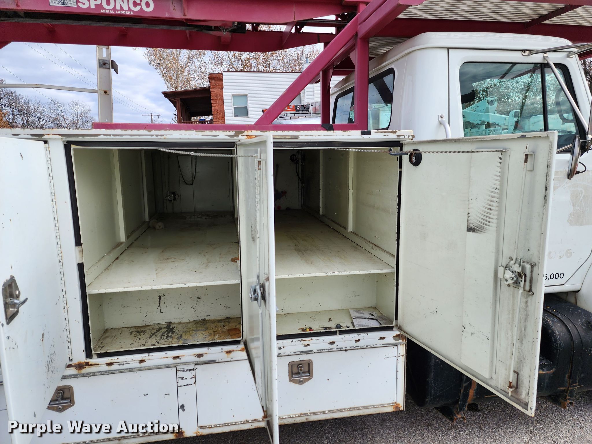 2000 International 4700 bucket truck. Miles: 169,808 on odometer, VIN: 1HTSCAAL3YH692625. Engine International DT466, Displacement: 7.6L, Cylinders: 6, Fuel type: Diesel. Transmission Automatic. Chassis Axles: Single, Suspension: Spring, Brakes: Air, PTO. Interior Heat, Heated mirrors, Cruise control. Features Bed 16' x 96" W, Boom Sponco 55, Serial: 55 3783 03, Maximum lift capacity: 300 lbs, Maximum lift height: 55', Boom type: Articulating, Telescopic, Boom controls Ground.. Tires Size: 11R22.5. Missouri prior salvage title. Title distribution may be delayed up to 14 days from verification of funds. Swift Construction. 2900 E 13th St. Kansas City, MO 64127