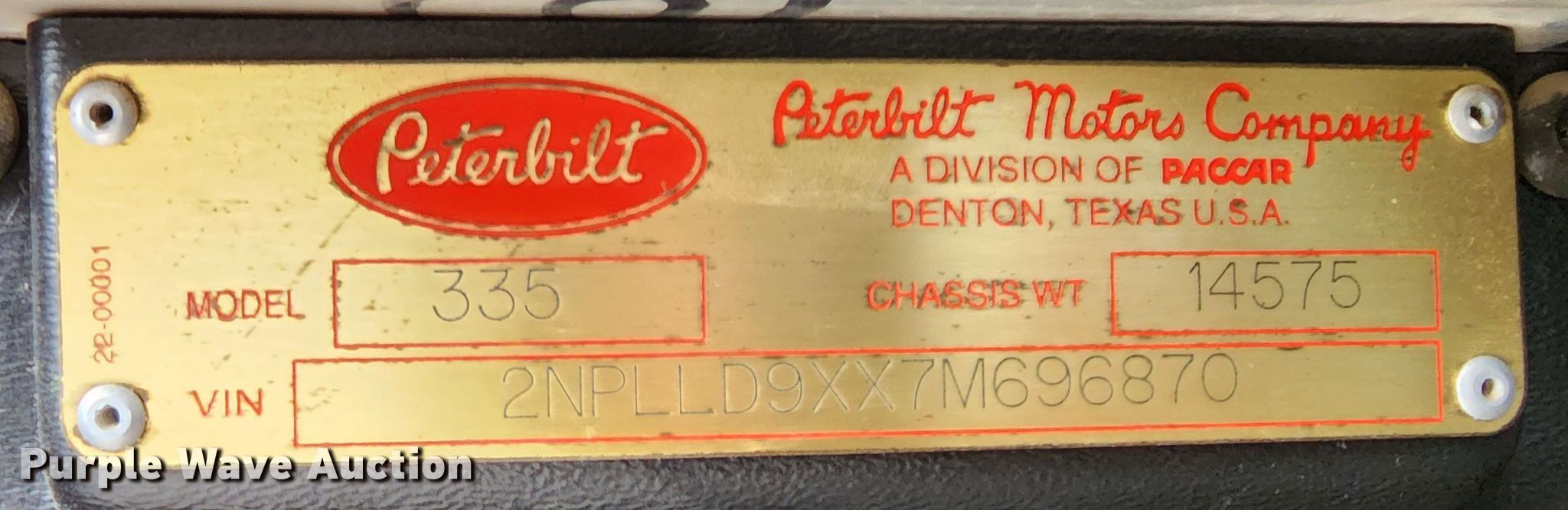 Purple Wave is selling a used Construction Dump Truck in Missouri. This item is a 2007 Peterbilt 335 dump truck with the following: Miles: 113,956 on odometer, VIN: 2NPLLD9XX7M696870