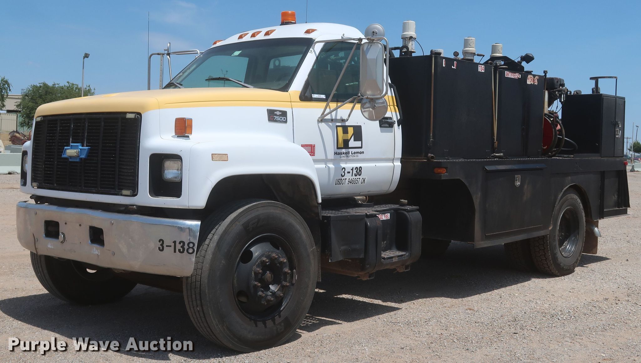 1998 Chevrolet C7500 fuel / lube truck. Miles: 430,696 on odometer, VIN: 1GBL7H1C3WJ110676, Unit #: 3-138. Engine Caterpillar 3126, Displacement: 7.2L, Cylinders: 6, Fuel type: Diesel. Transmission Manual, Speed: 6. Chassis Axles: Single, Suspension: Spring, Brakes: Hydraulic. Interior AC, Heat. Features Bed 15' L x 96" W, Air compressor, Oil/lube system Hose reels, Nozzles, Pump, Reservoirs Grease, Fuel tank Nozzles, Pump.. Tires Size: 11R22.5. Oklahoma classic title. Title distribution may be delayed up to 30 days from verification of funds. Haskell Lemon Construction Co.. 3800 Southwest 10th Street. Oklahoma City, OK 73108