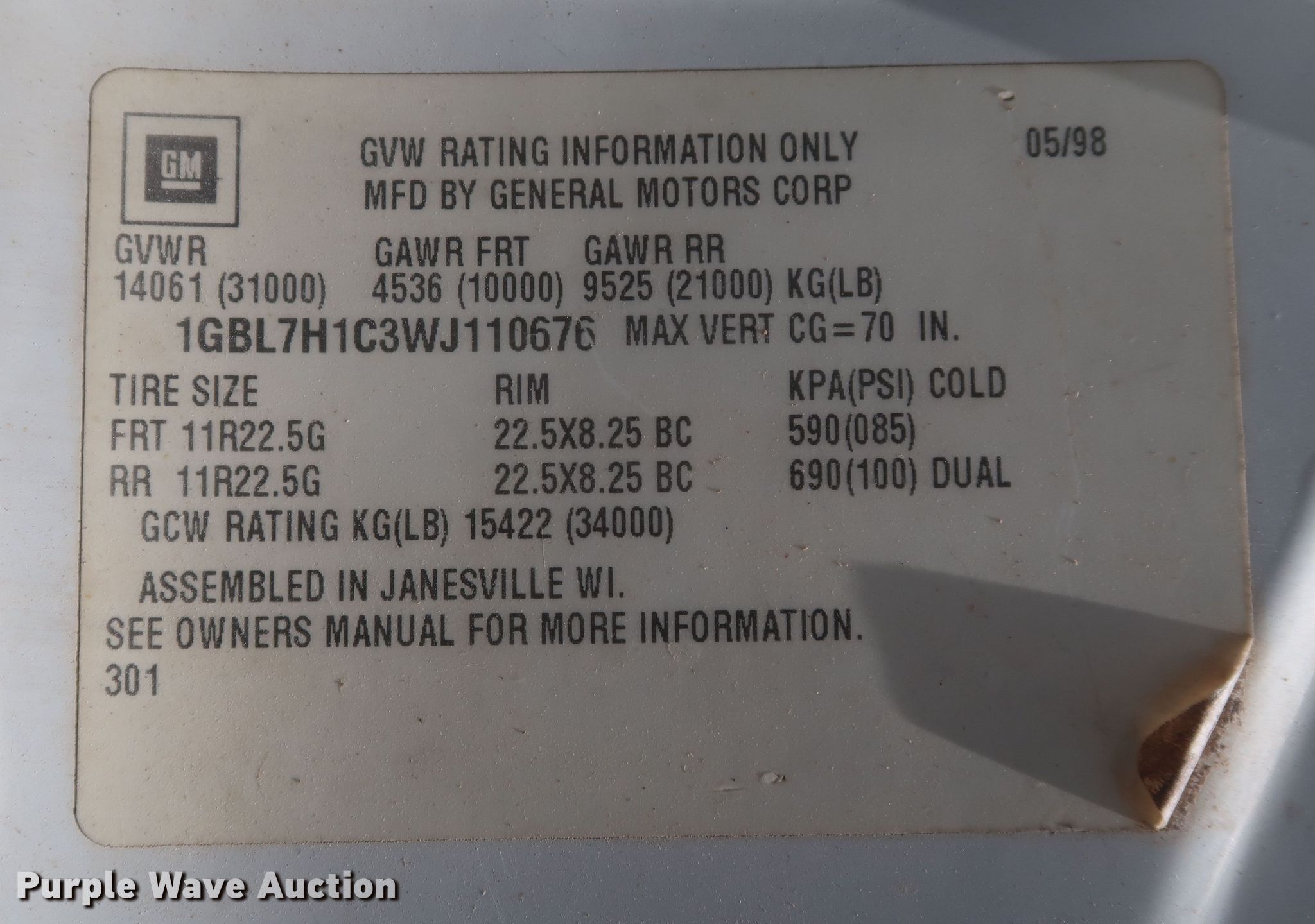 Purple Wave is selling a used Service Truck in Oklahoma. This item is a 1998 Chevrolet C7500 fuel / lube truck with the following: Miles: 430,696 on odometer, VIN: 1GBL7H1C3WJ110676, Unit #: 3-138