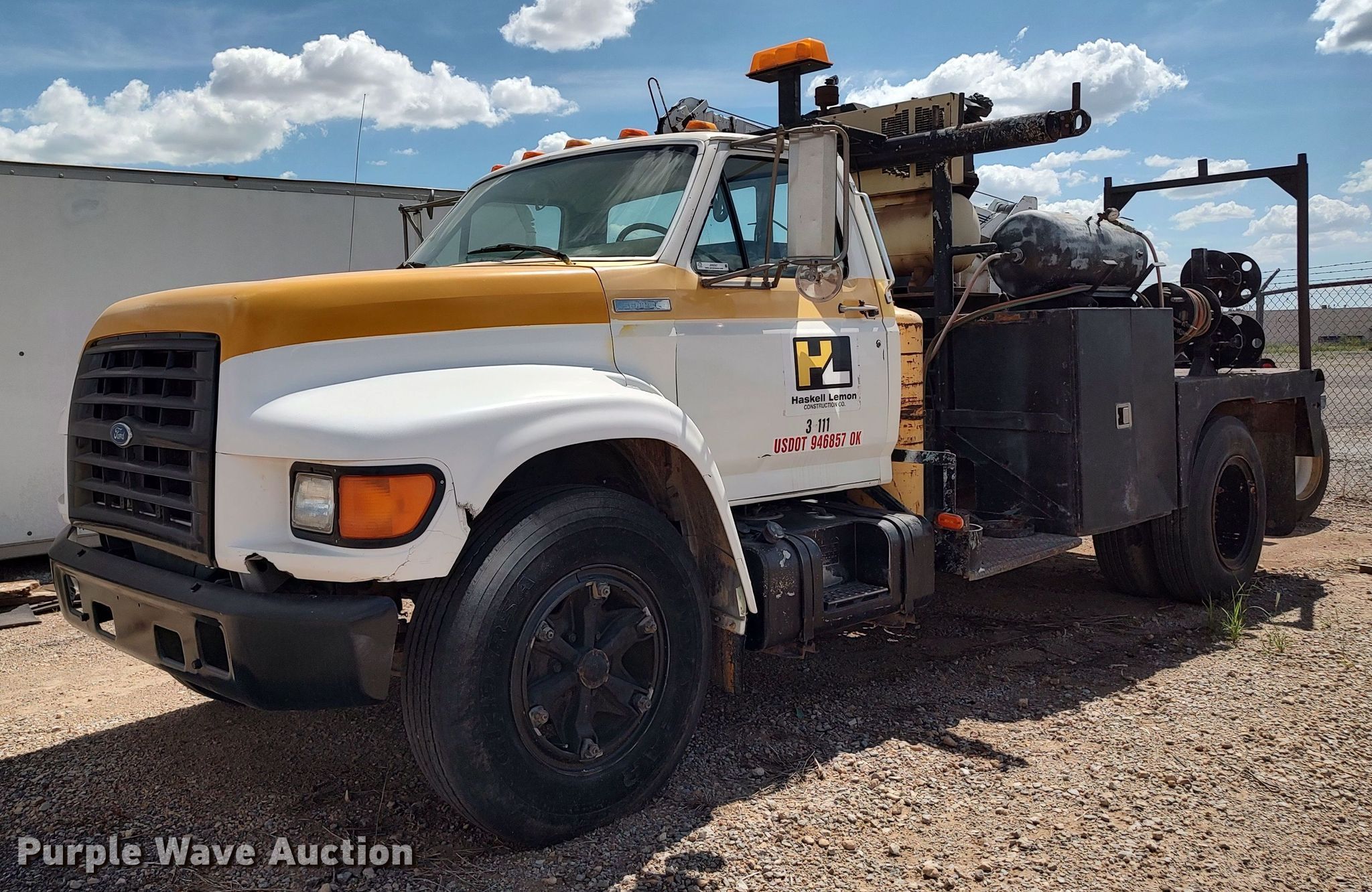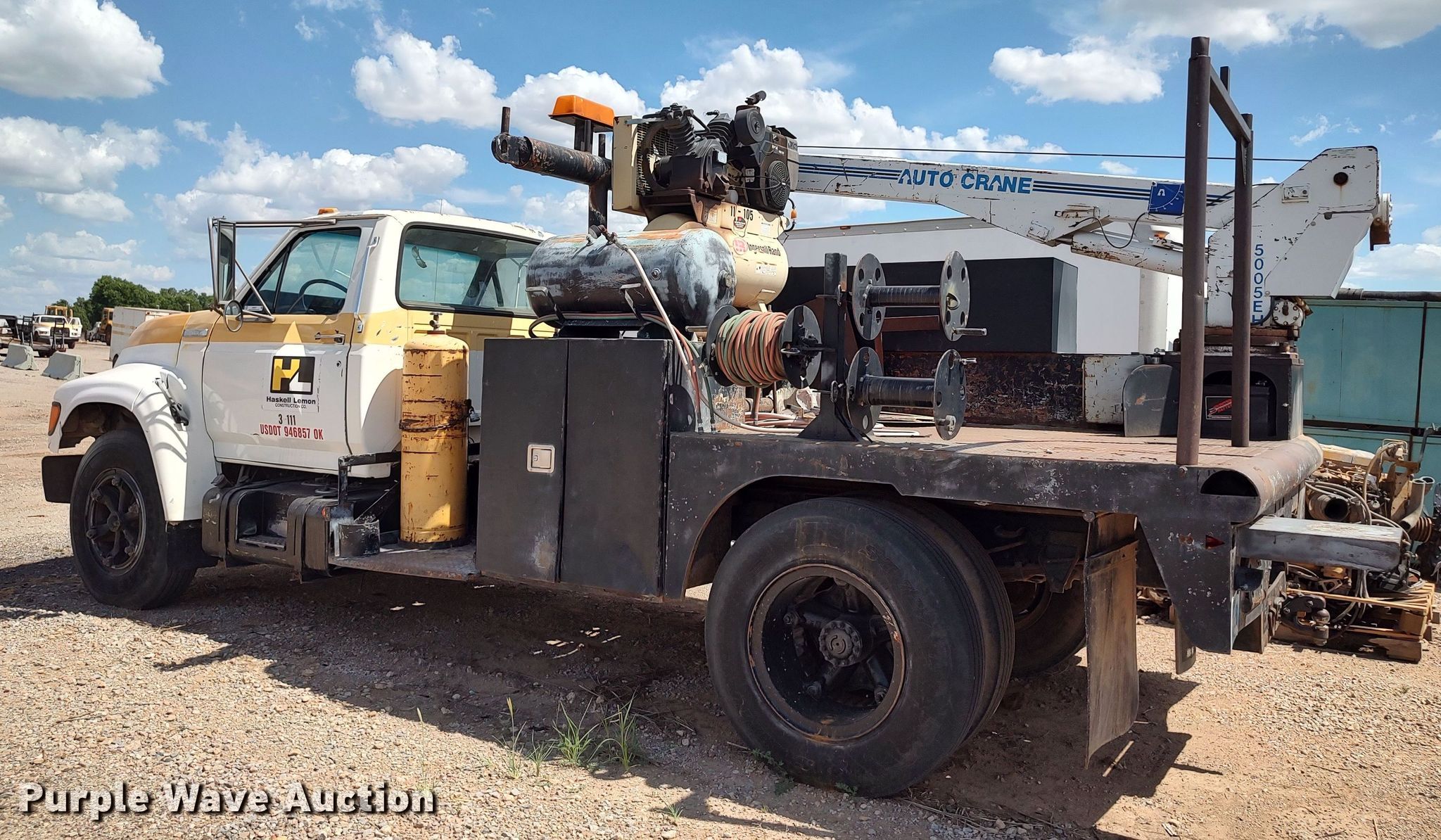 1995 Ford F700 utility / service truck. Miles: 118,755 on odometer, VIN: 1FDNF70J8SVA65234, Unit #: 3-111. Engine Displacement: 7.0L, Cylinders: 8, Fuel type: Diesel. Transmission Manual, Speed: 5, plus 2. Chassis Suspension: Spring, Brakes: Hydraulic. Interior AC, Heat. Features Bed 13' L x 94" W, Torch bottle rack, Air compressor Ingersoll Rand, Kohler Command Pro, Crane Auto Crane 5005EH, Boom length: 11'. Tires Size: 9.00R20. Oklahoma classic title. Title distribution may be delayed up to 30 days from verification of funds. Haskell Lemon Construction Co.. 3800 Southwest 10th Street. Oklahoma City, OK 73108