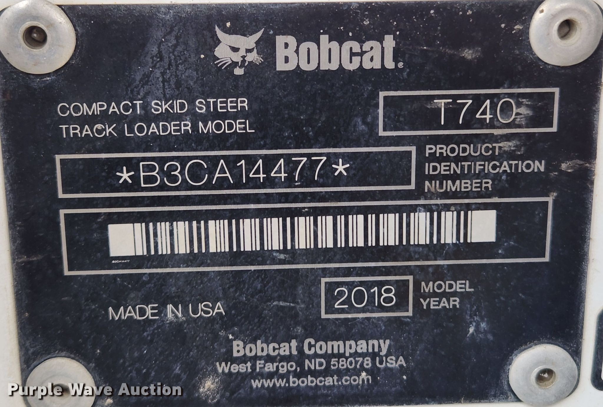 Purple Wave is selling a used Tracked Skid Steer Loader in Missouri. This item is a 2018 Bobcat T740 tracked skid steer loader with the following: Hours: 1,987 on meter, Miles or hours may vary, unit still in use, Serial: B3CA14477