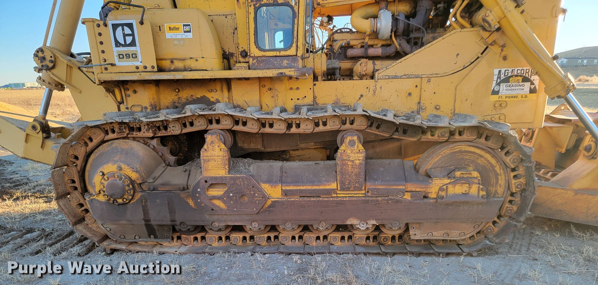 1973 Caterpillar D9G dozer. Hours: 2,734 on meter, Serial: 66A13158. Engine Caterpillar, Cylinders: 6, Fuel type: Diesel. Transmission Powershift, 3F - 3R. Operators station Enclosed cab, Heat, Steering: Clutch brake. Features Dozer blade Type: Straight, Width: 128" W, Attachments Ripper CRC, Shanks: 1.. Tracks Width: 24", Grouser pads: Single, Bottom rollers: 7. Notes Glass cracked, Maintenance records available upon request to Andy at [email protected]. AGE Corporation. 704 US-14. Fort Pierre, SD 57532