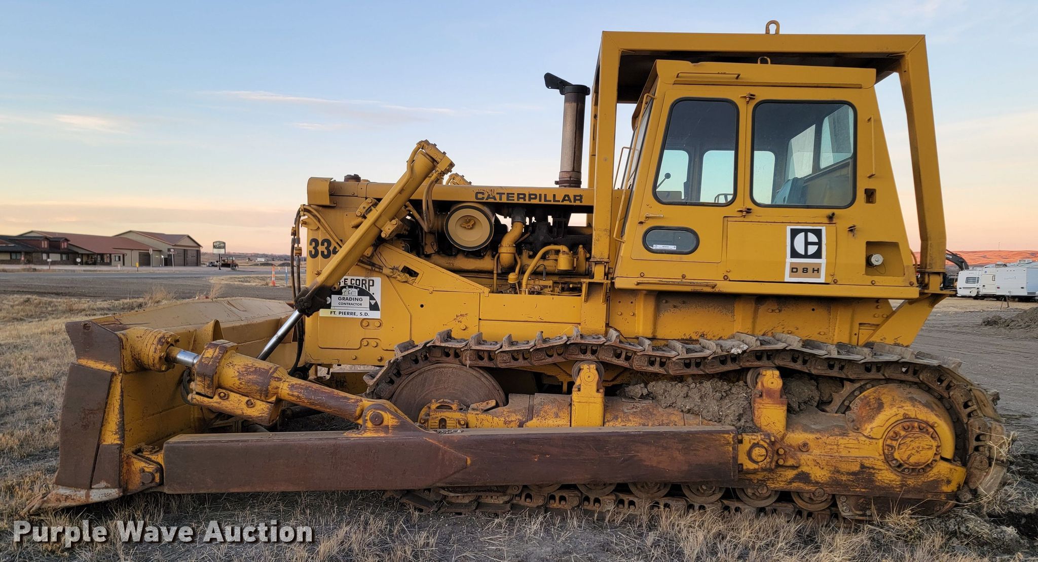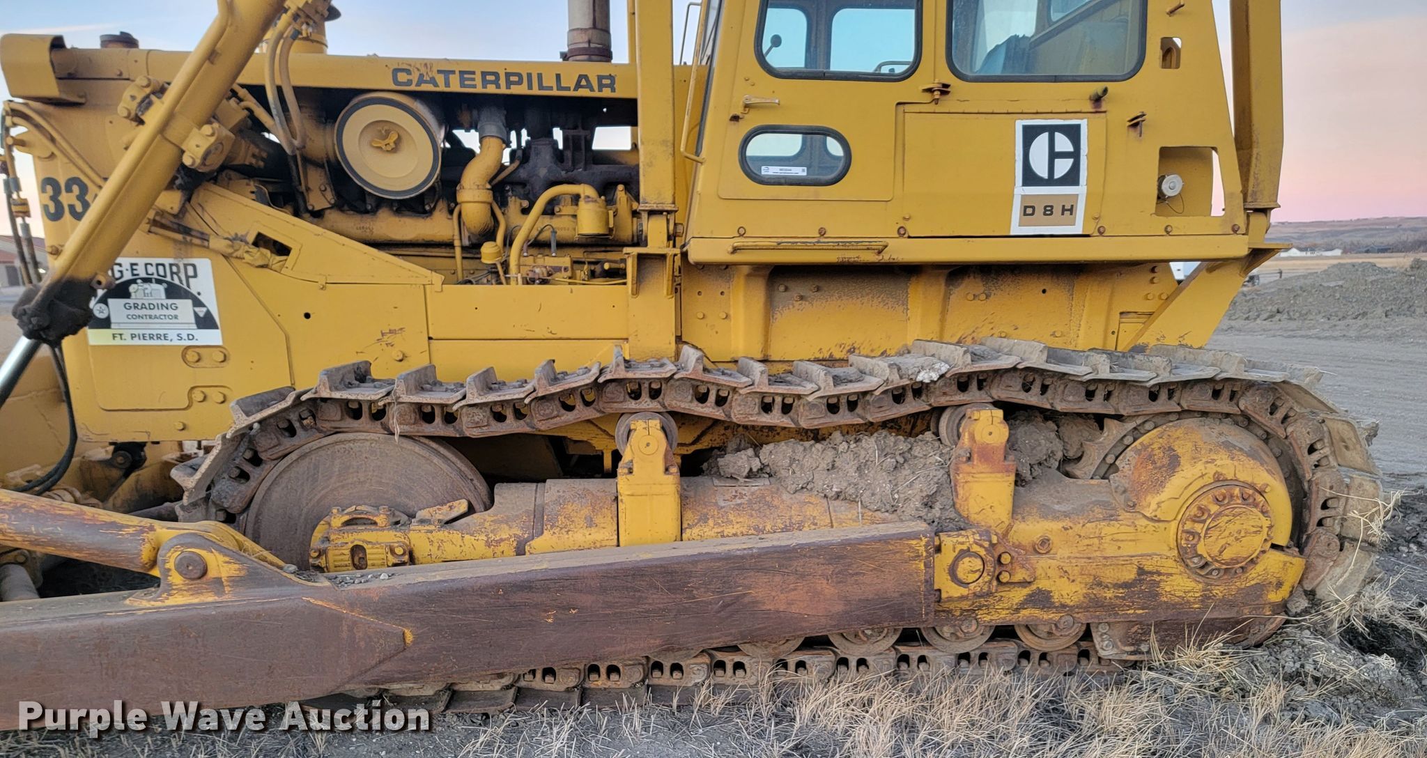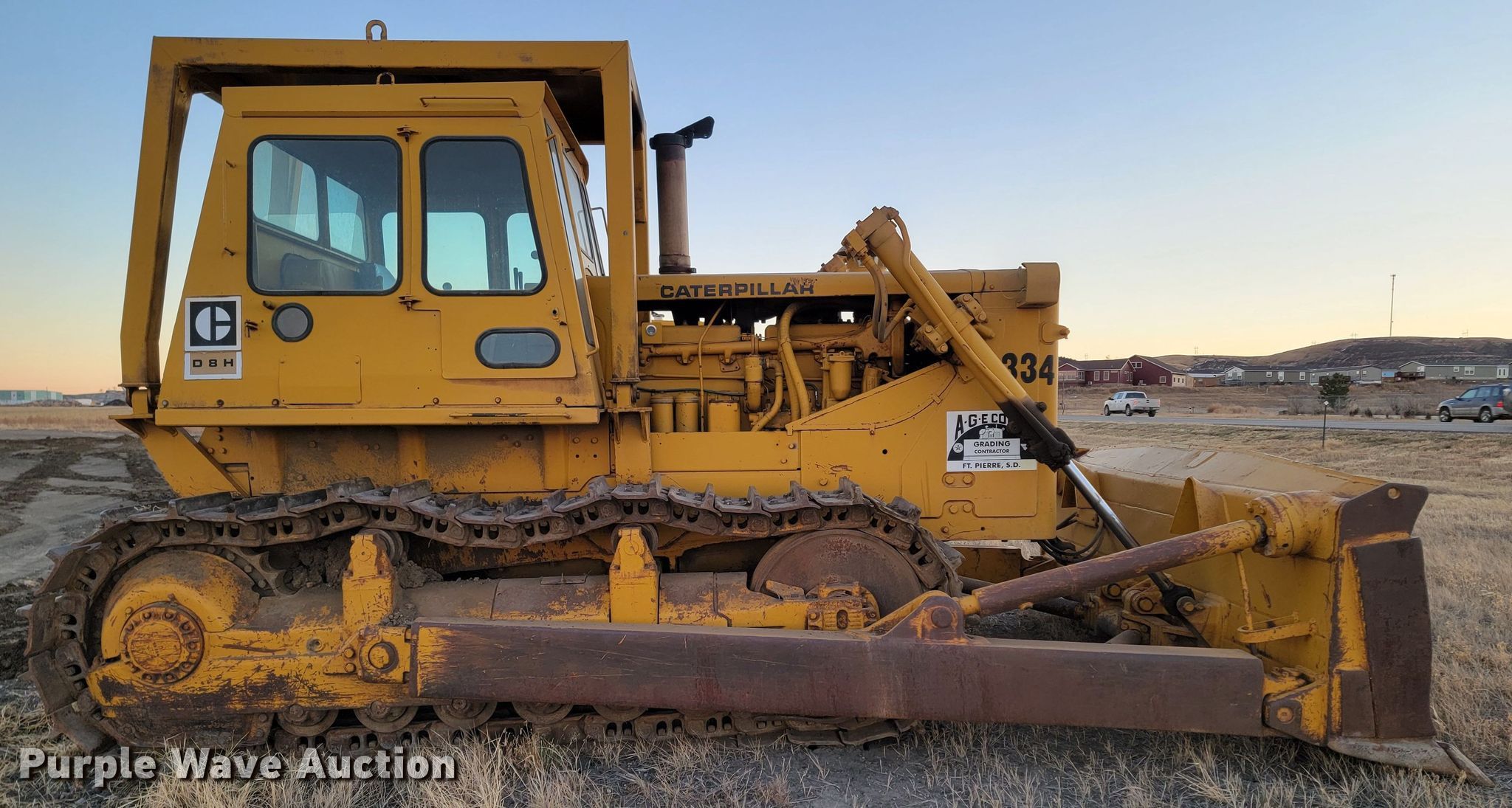 1966 Caterpillar D8H dozer. Hours: 7,262 on meter, Serial: 46A15142. Engine Caterpillar, Cylinders: 6, Fuel type: Diesel, Two cylinder gas pony motor. Transmission Powershift, 3F - 3R. Operators station Enclosed cab, Heat, Steering: Clutch brake. Features Rear drawbar, Dozer blade Type: Semi-U, Single-tilt, Width: 152" W. Tracks Width: 22", Grouser pads: Single, Bottom rollers: 6. Notes Glass cracked, Maintenance records available upon request to Andy at [email protected]. AGE Corporation. 704 US-14. Fort Pierre, SD 57532