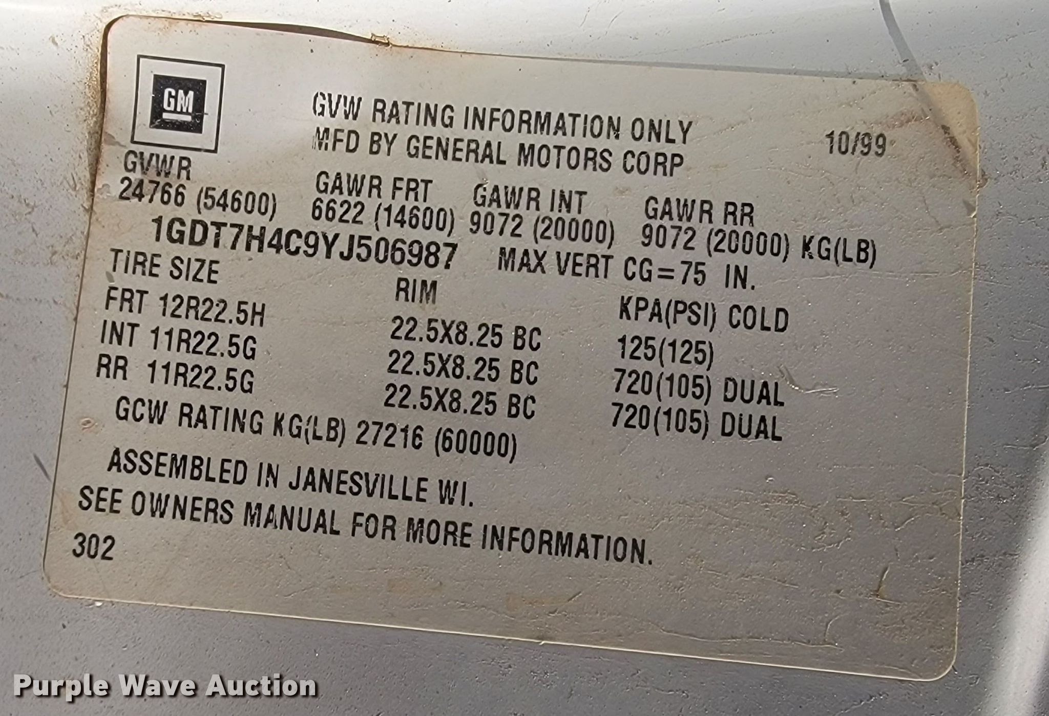 2000 GMC C8500 dump truck. Miles: 190,000 on odometer, Hours: 612 on meter, VIN: 1GDT7H4C9YJ506987, Unit #: 330. Engine Caterpillar 3126, Displacement: 7.2L, Cylinders: 6, Fuel type: Diesel. Transmission Eaton Fuller 8LL, Manual, Speed: 10. Chassis Axles: Triple, Pusher axle, Differential lock: Inter-axle, Suspension: Spring over walking beam, Brakes: Air, PTO, GVWR: 54,600 lbs FAWR: 14,600 lbs, IAWR: 20,000 lbs, RAWR: 20,000 lbs. Interior AC, Heat. Features Dump bed 16' L x 96" W, Side height: 36", Bed type: Steel, Roll tarp, Ram: Single , End gate: Air operated. Tires Front: 315/80R22.5, Rear: 11R22.5. Notes Air leak, Possible rear main engine seal leak. South Dakota title. Title distribution may be delayed up to 14 days from verification of funds. Morris Inc.. 306 U.S. 14. Fort Pierre, SD 57532