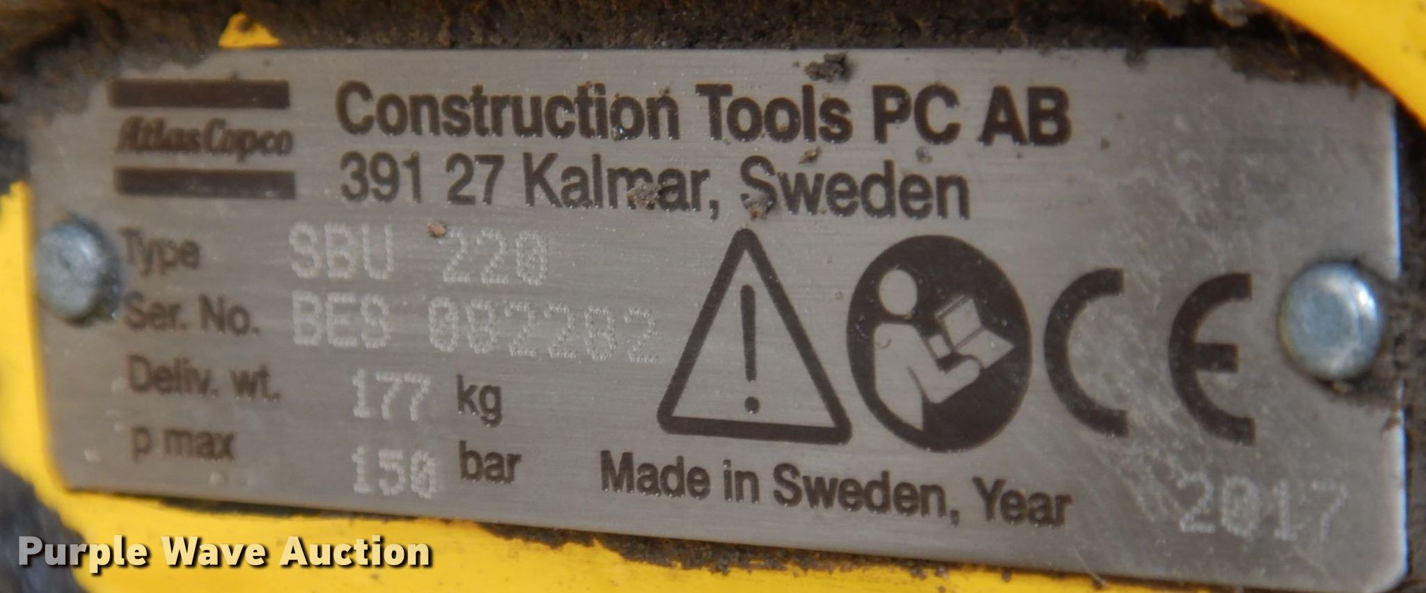 Purple Wave is selling a used Skid Steer Attach. in Missouri. This item is a 2017 Atlas Copco SBU220 skid steer breaker with the following: Serial: BES 082282, TAG attachment